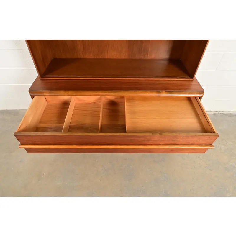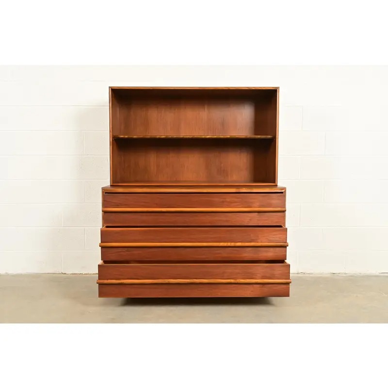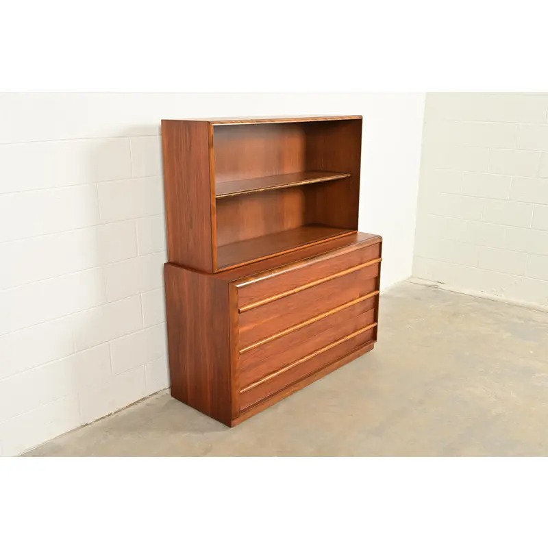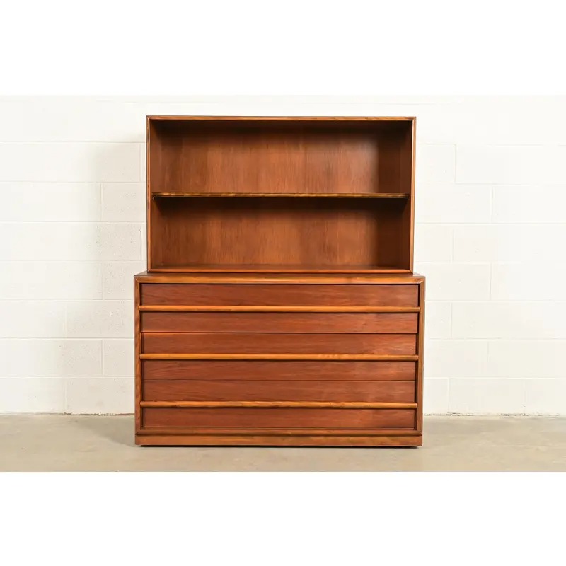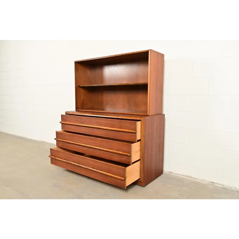 An exceptional Mid-Century Modern sculpted walnut three-drawer dresser or server with bookcase hutch top