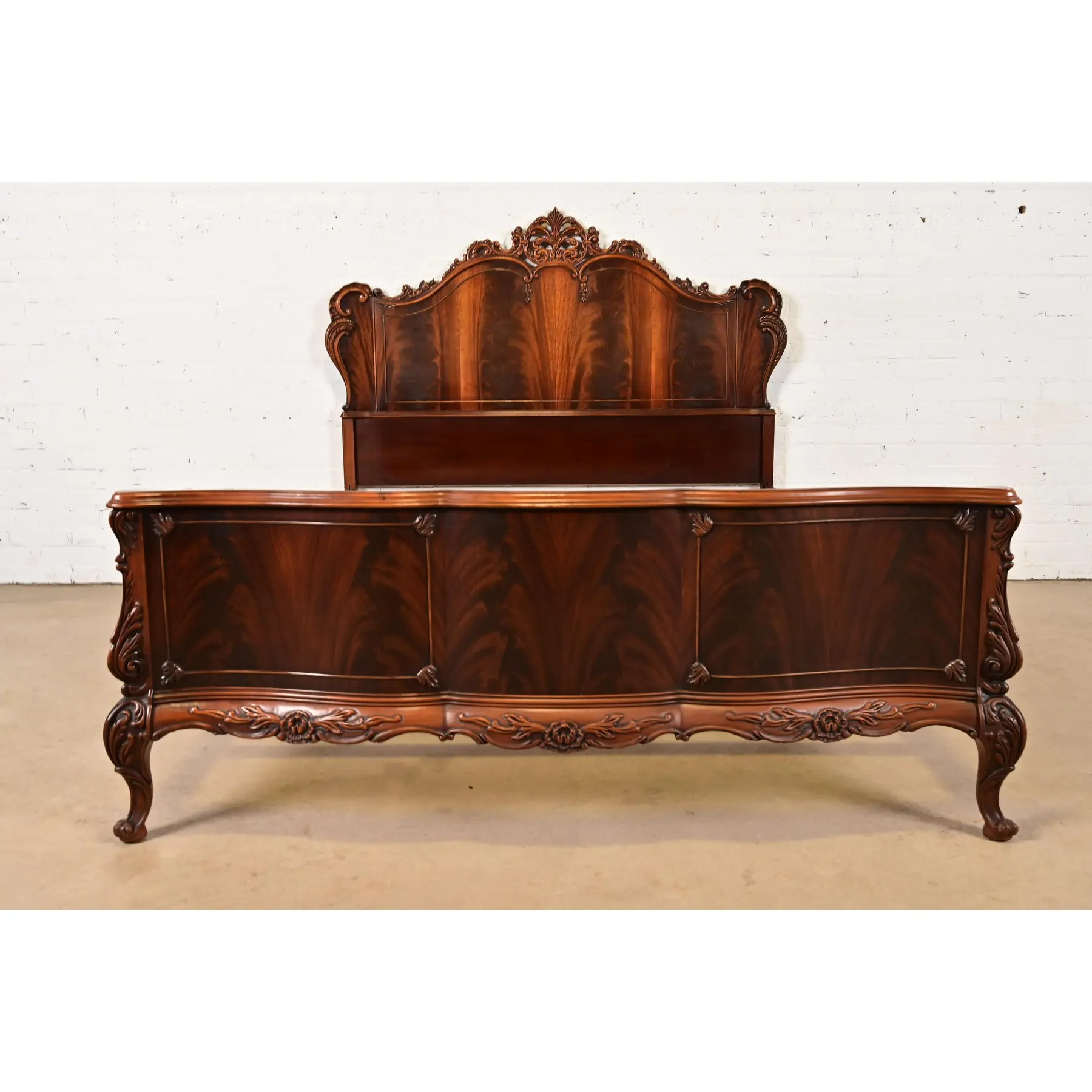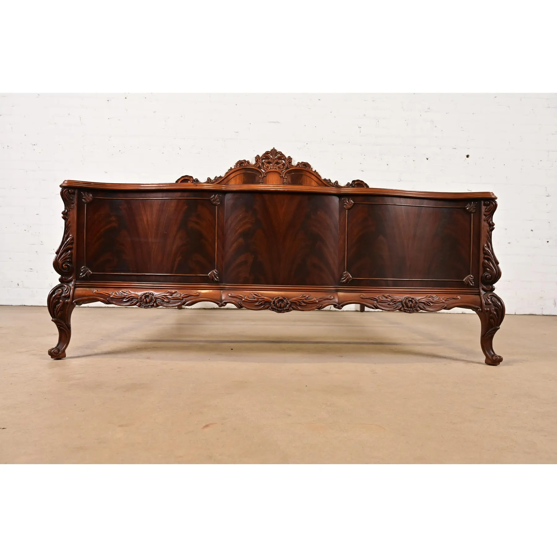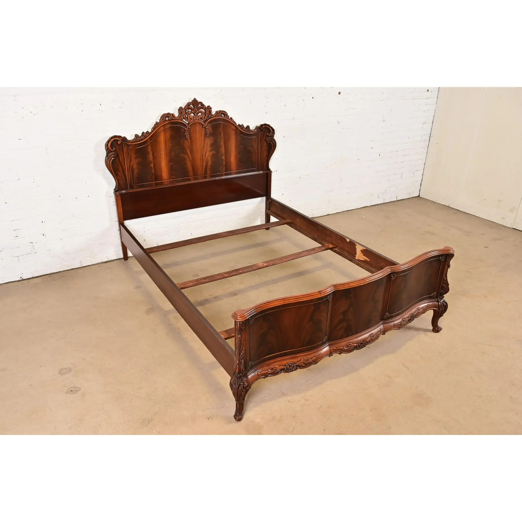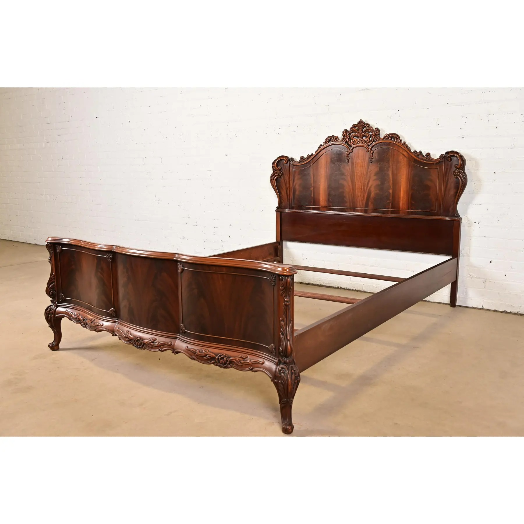 Romweber Antique French Provincial Louis XV Carved Flame Mahogany Full Size Bed, Circa 1920s