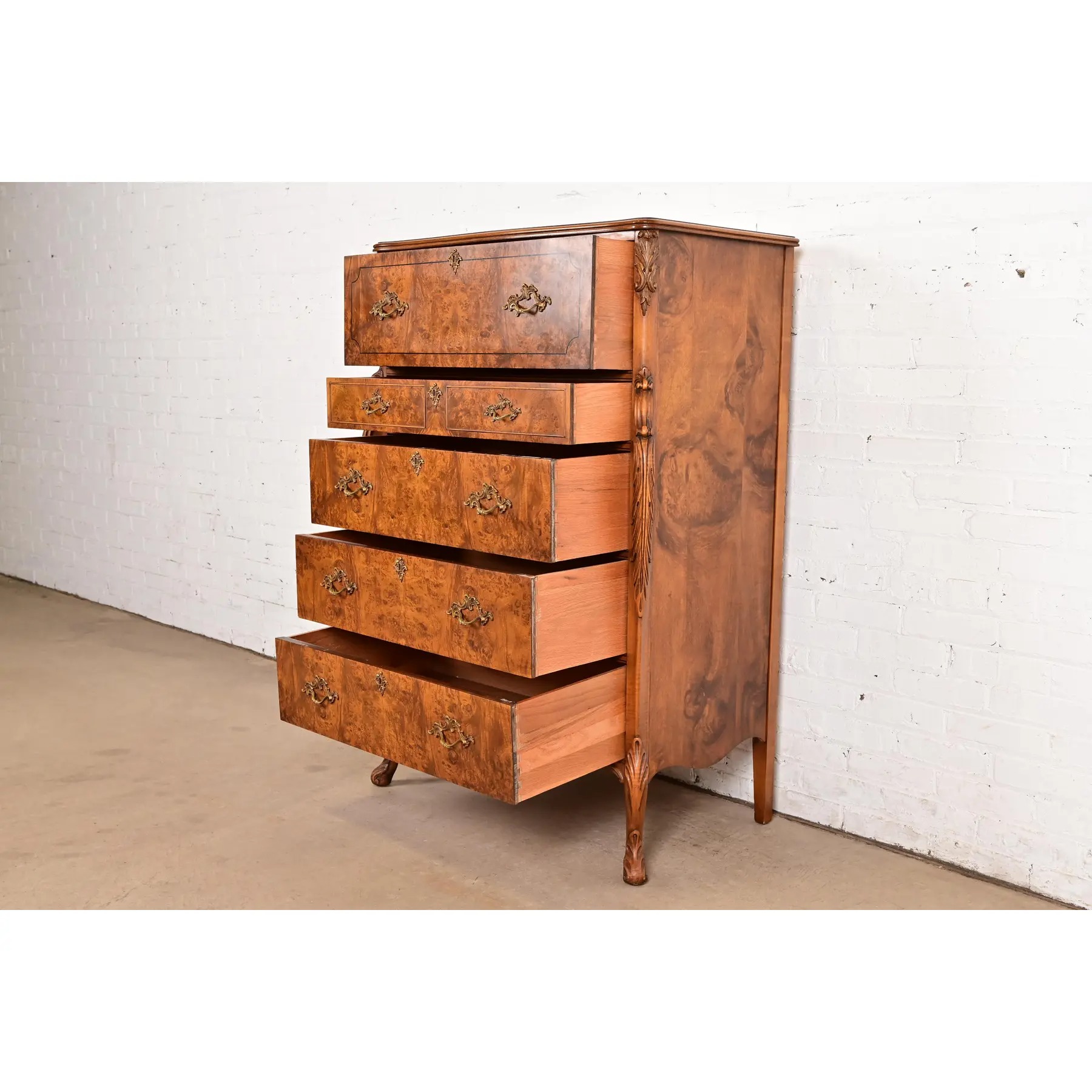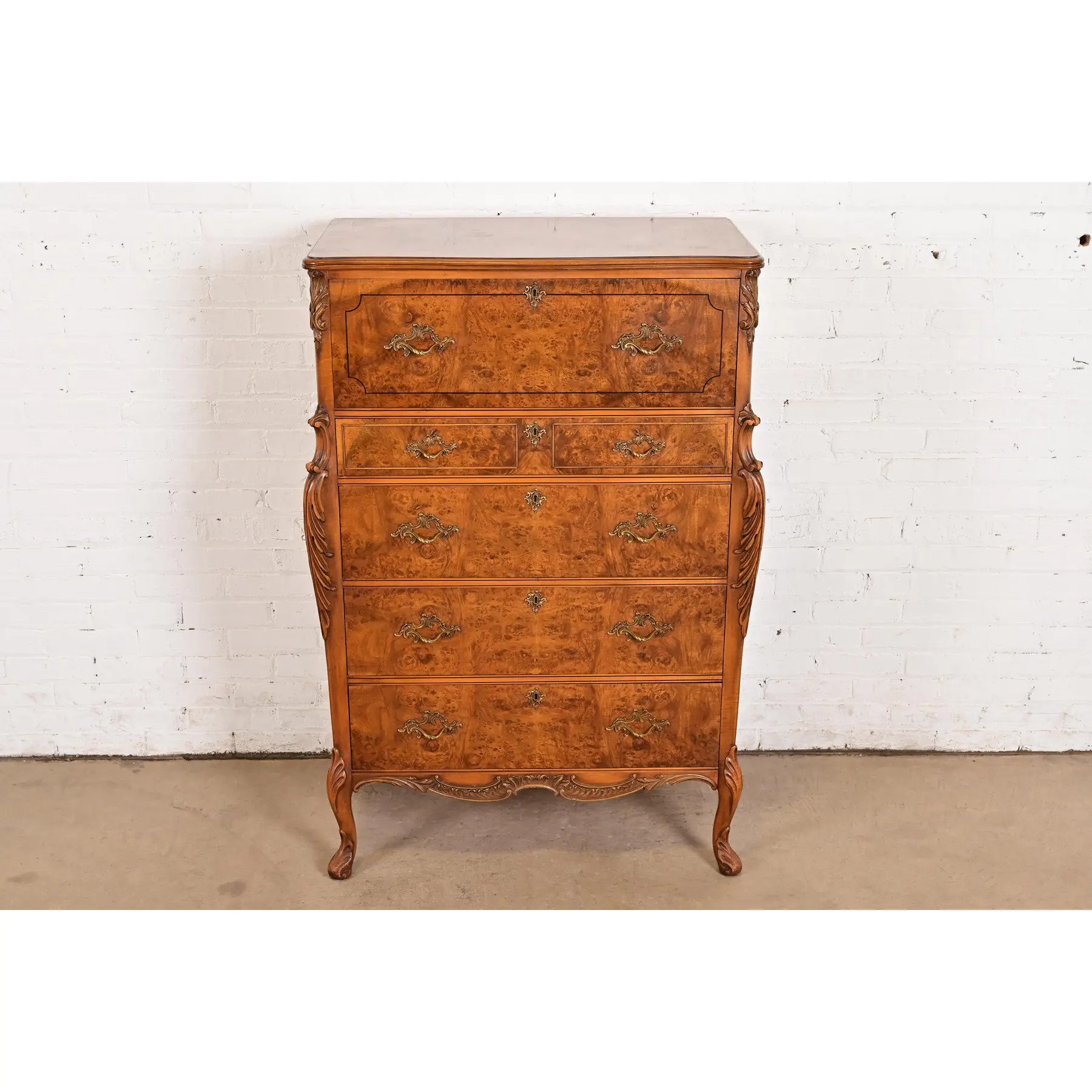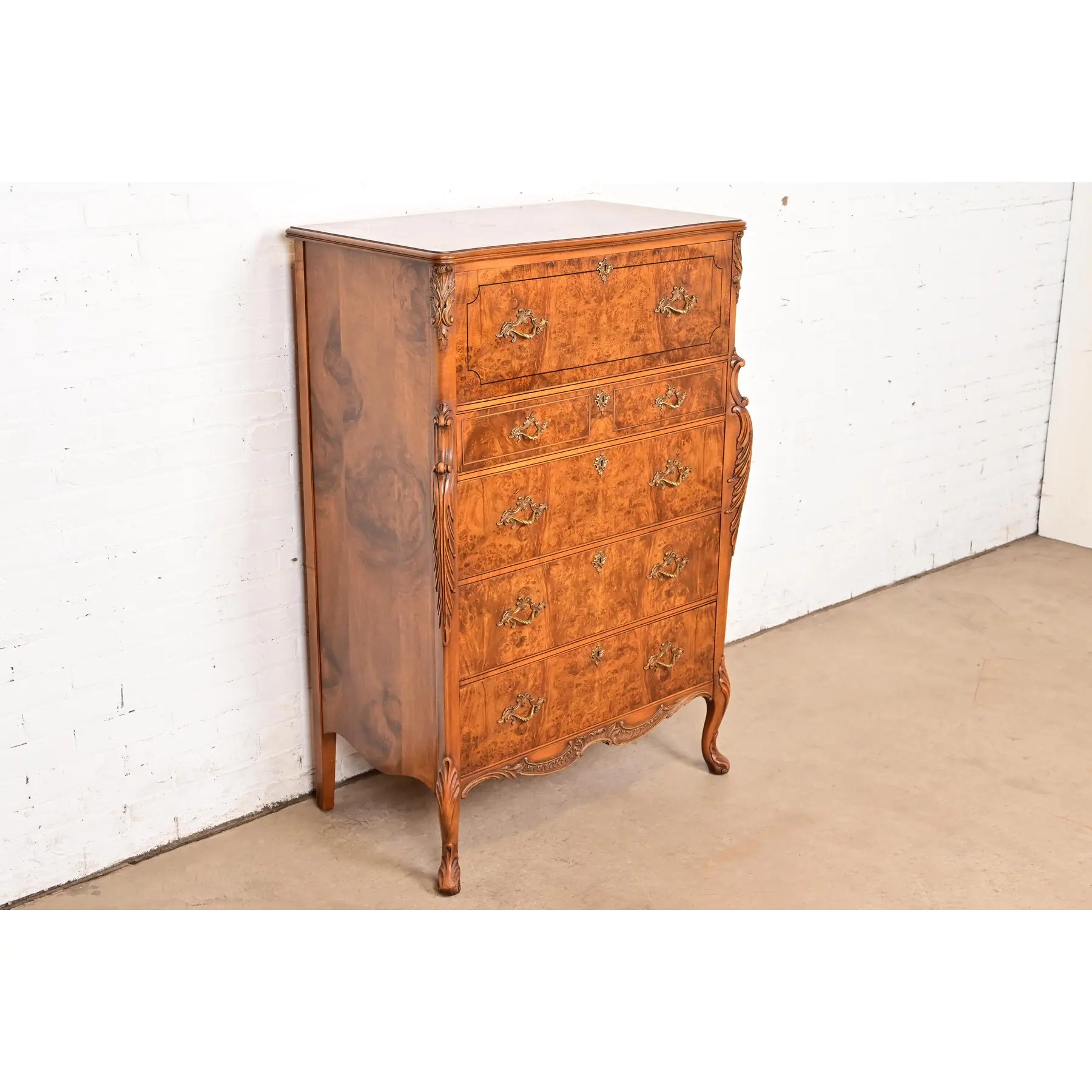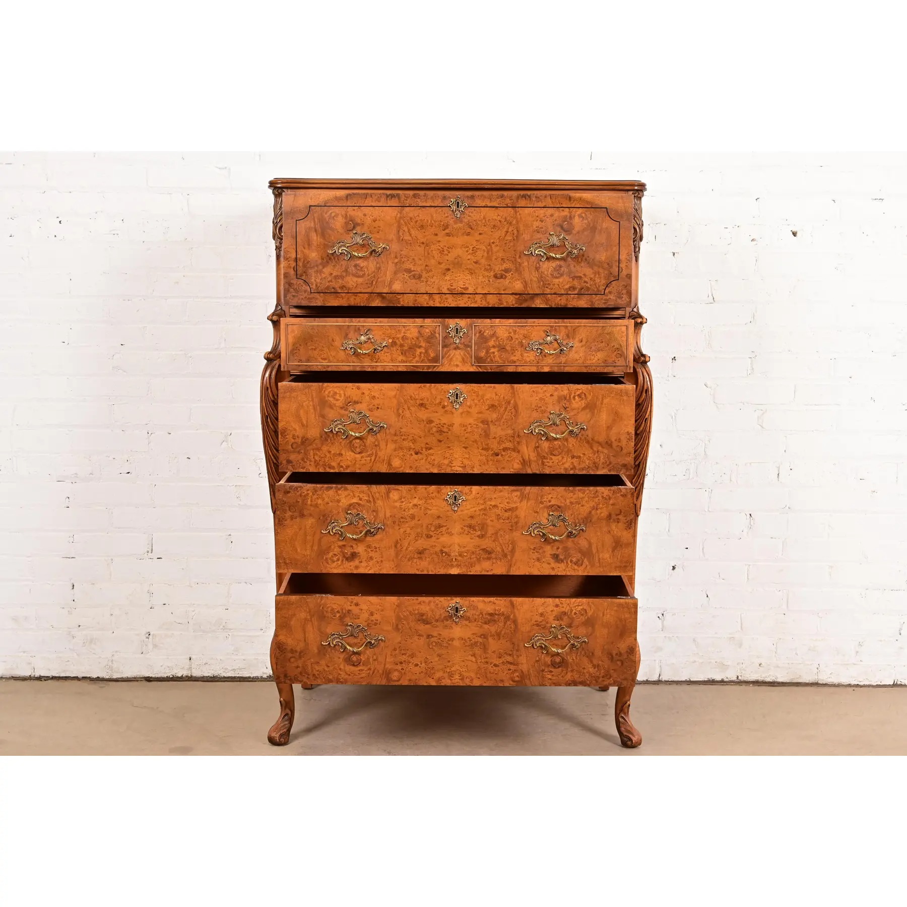 An exceptional French Provincial Louis XV style highboy dresser or chest of drawers