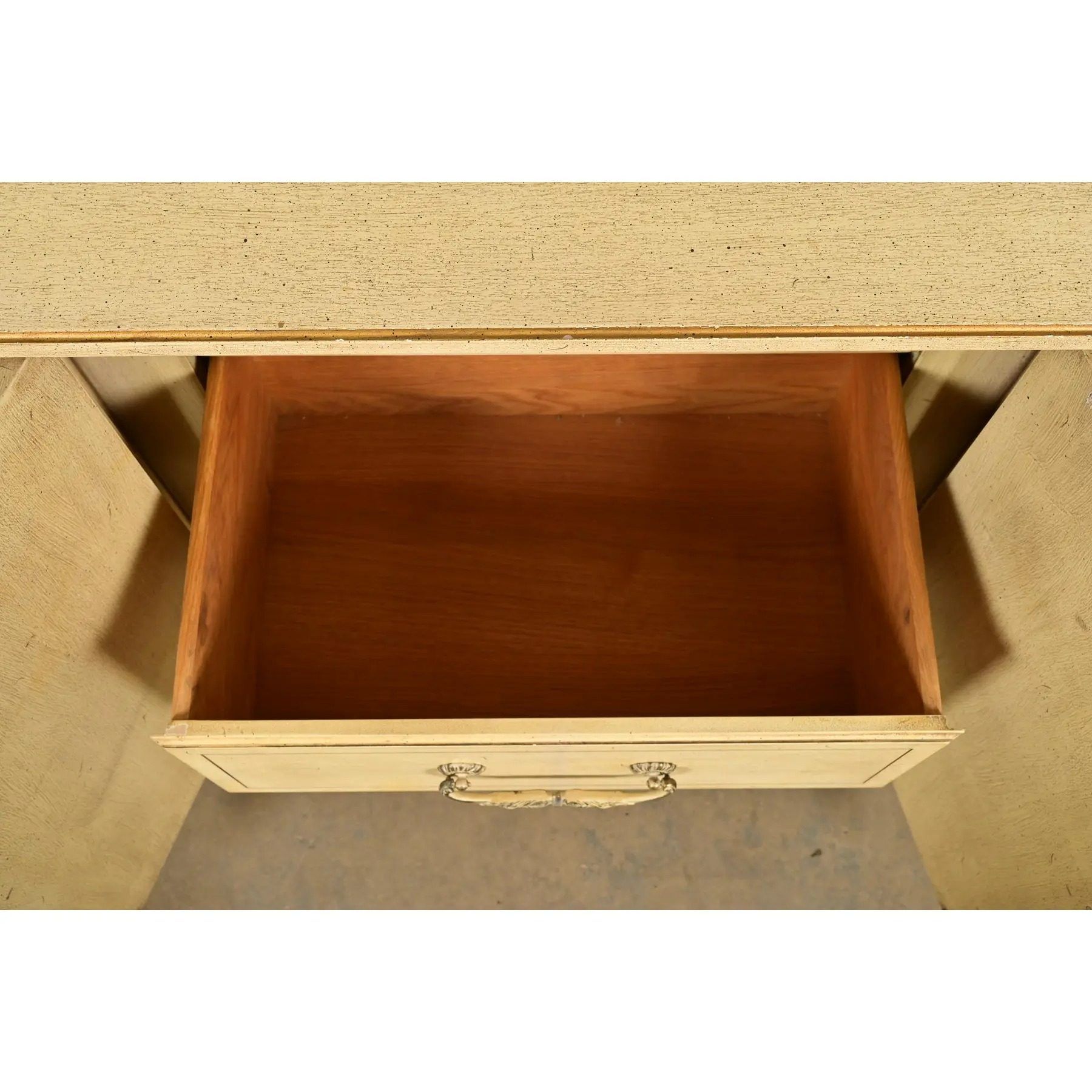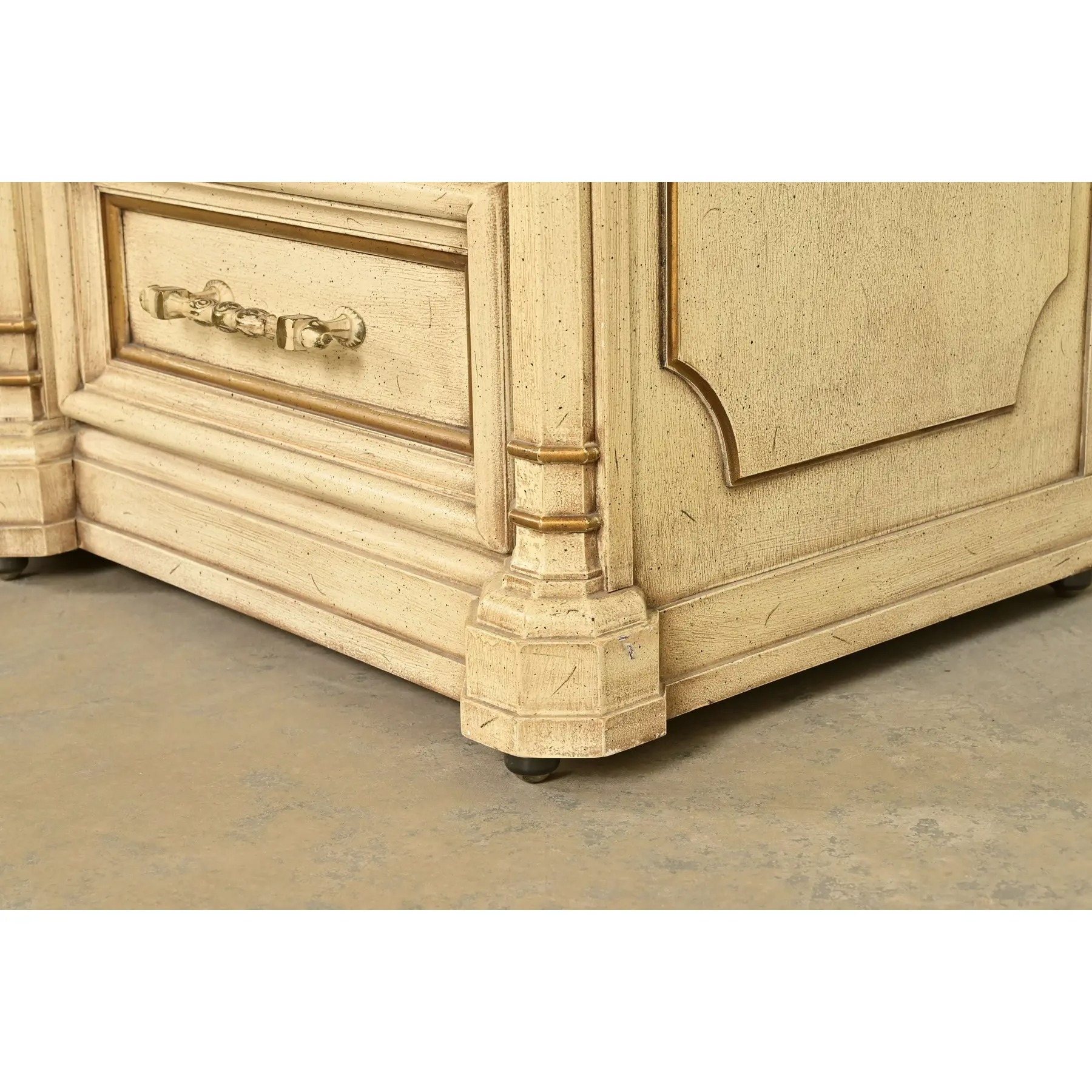 Carved cream lacquered walnut, with gold gilt trim, and original brass hardware.