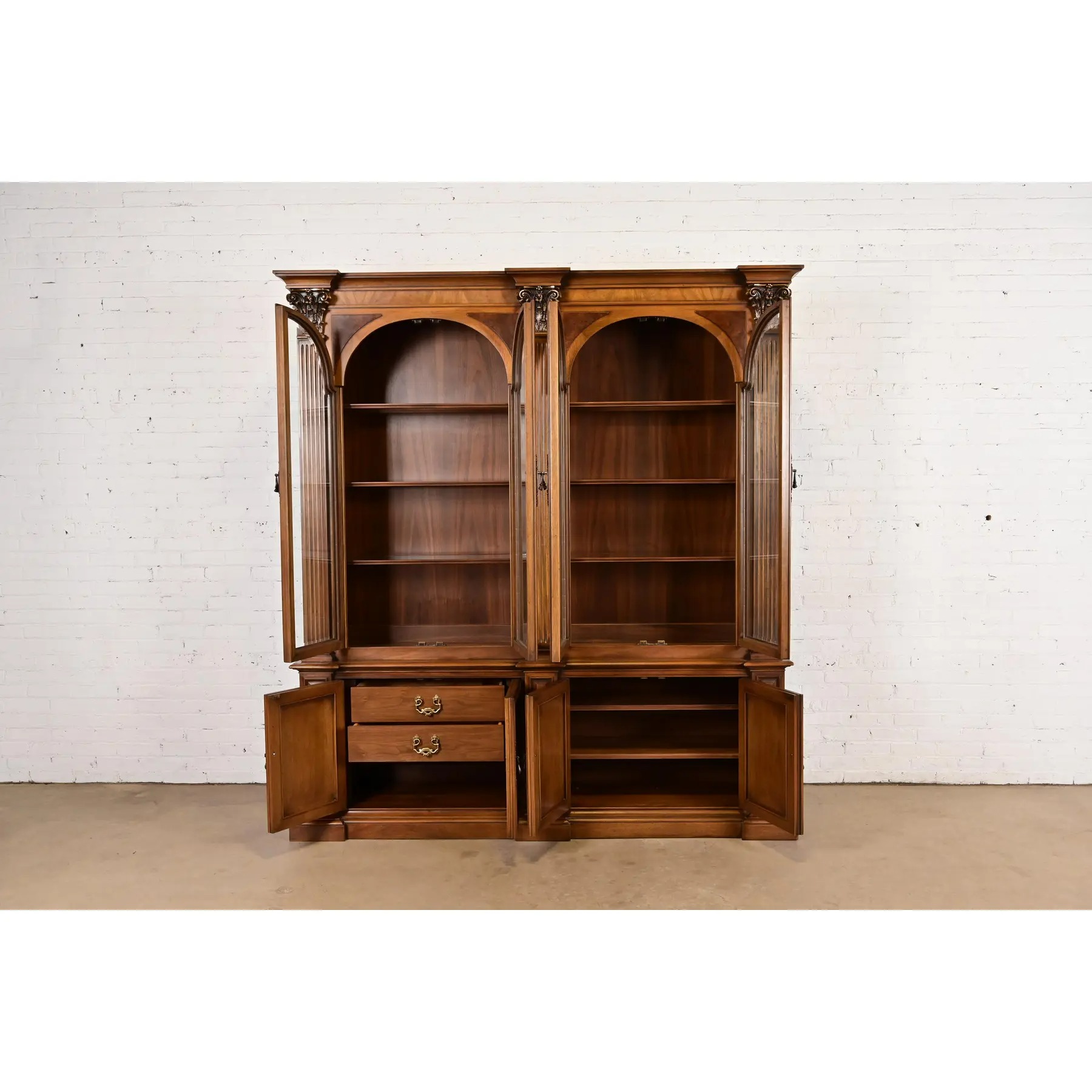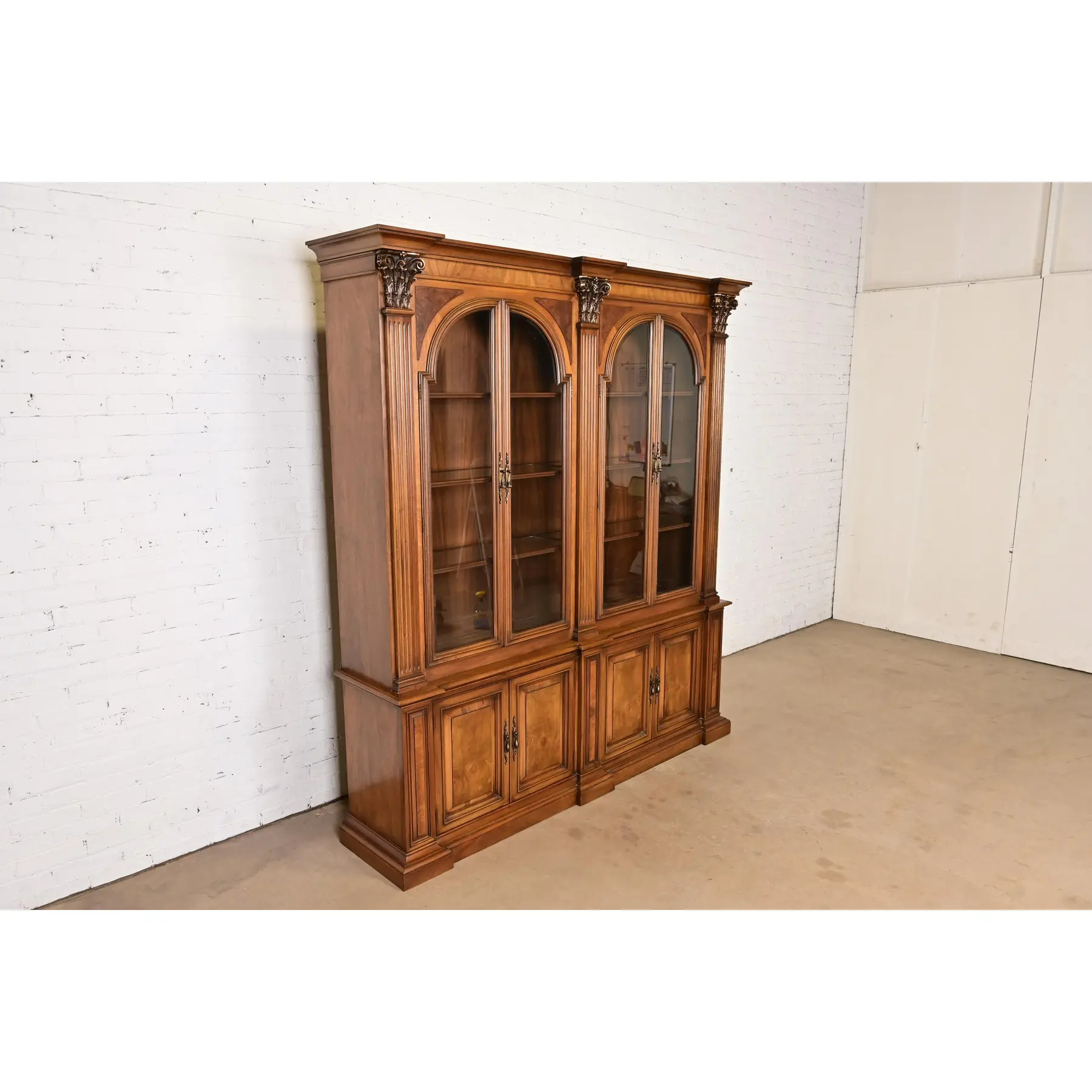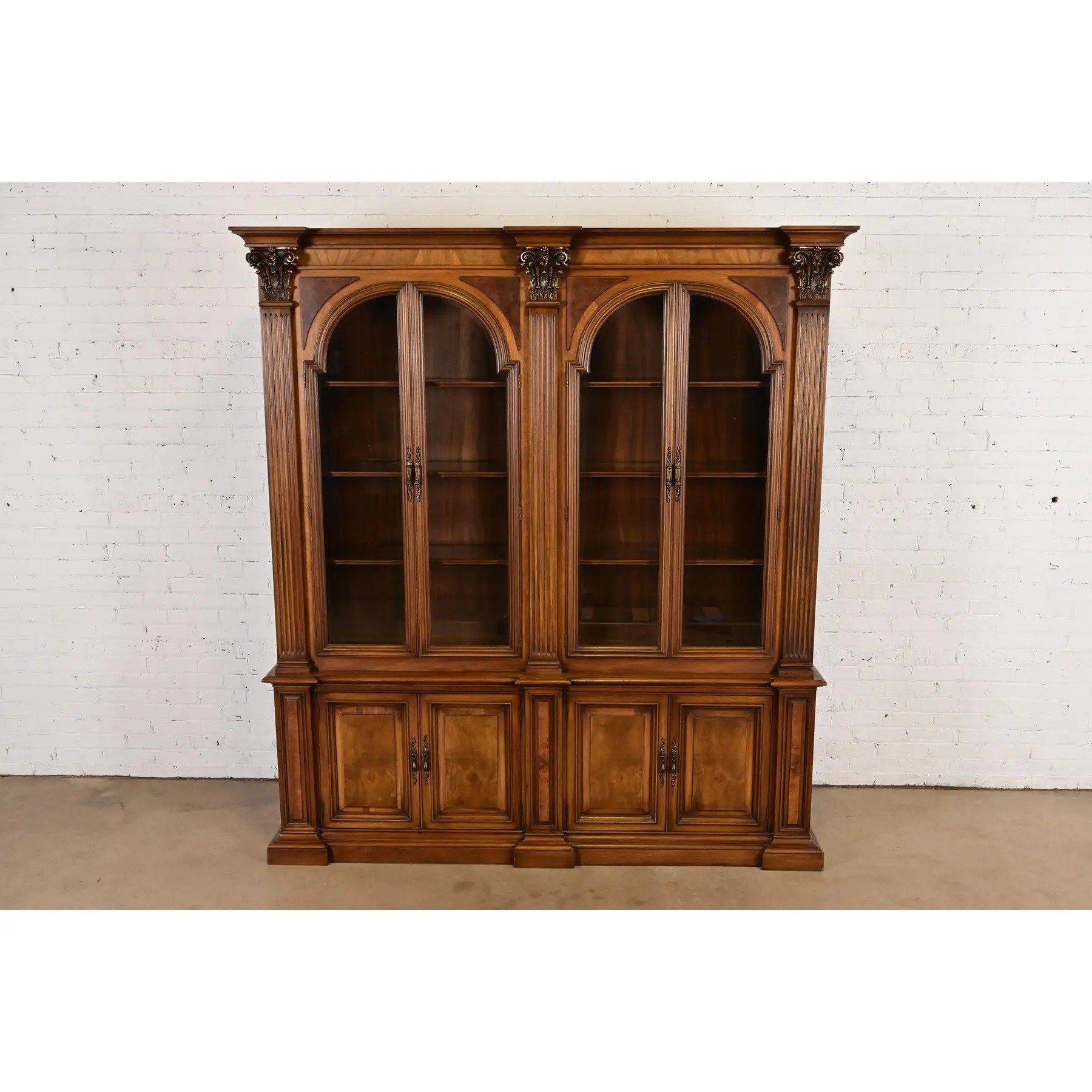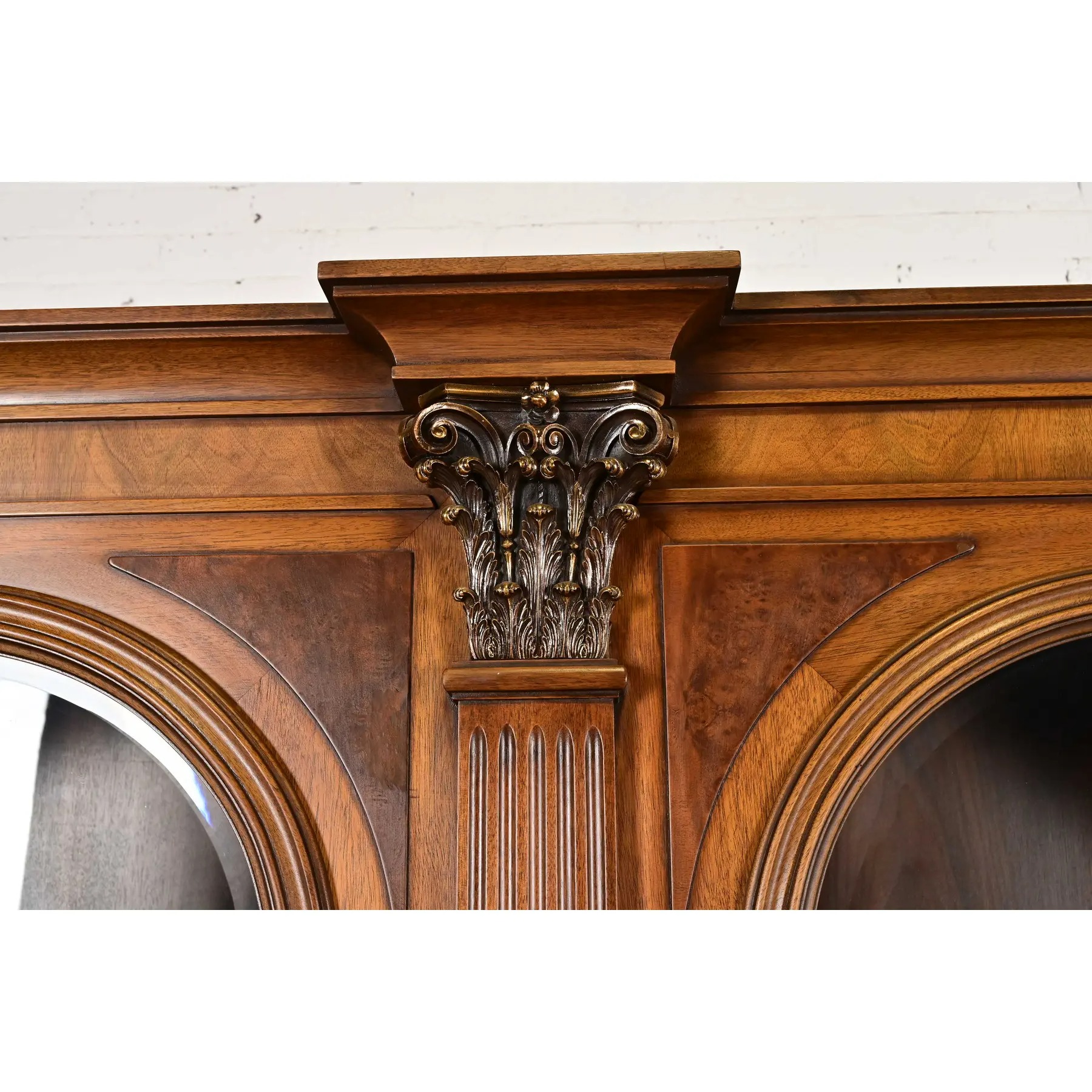 Walnut, with carved columns, burled walnut panels, glass front arched doors, and original brass hardware.