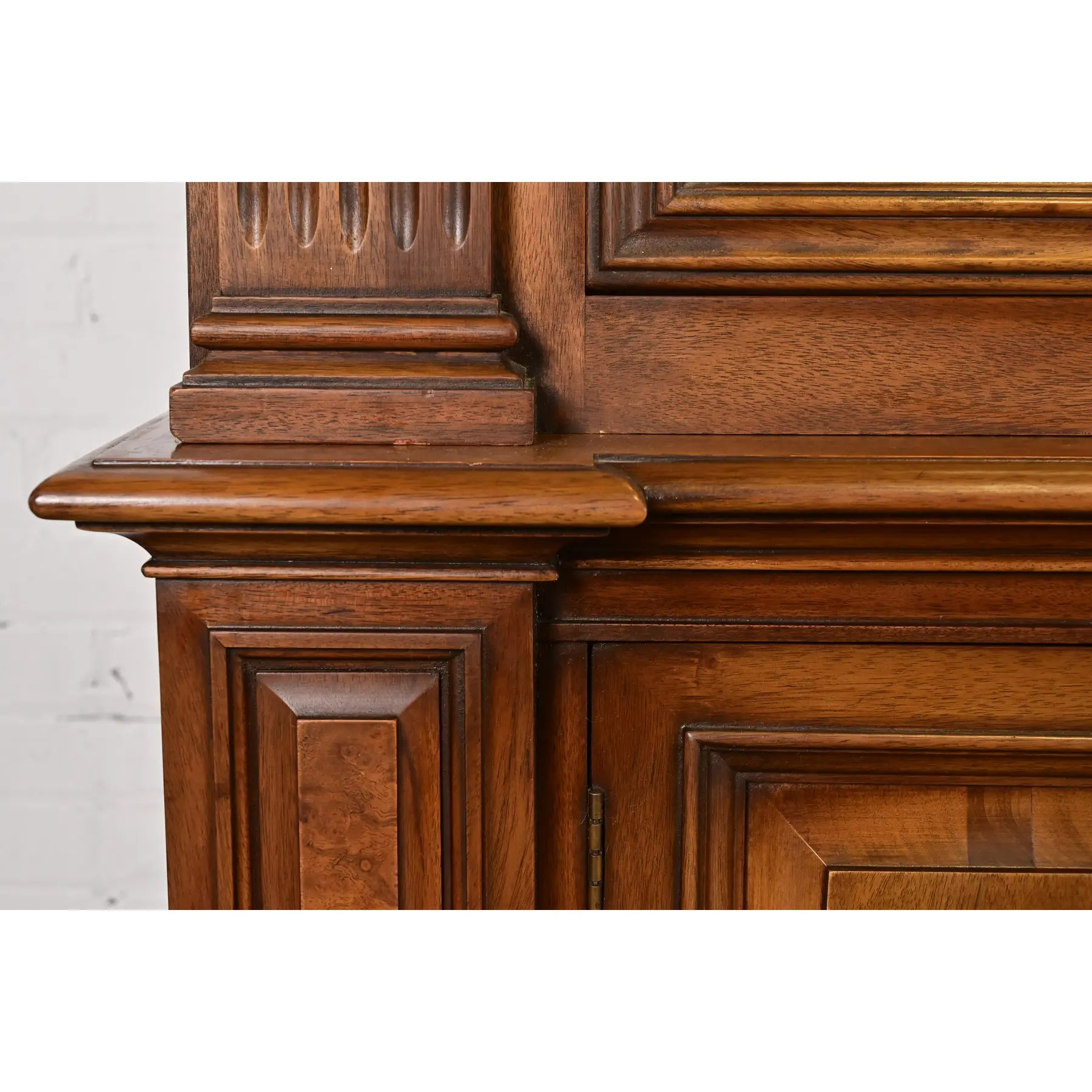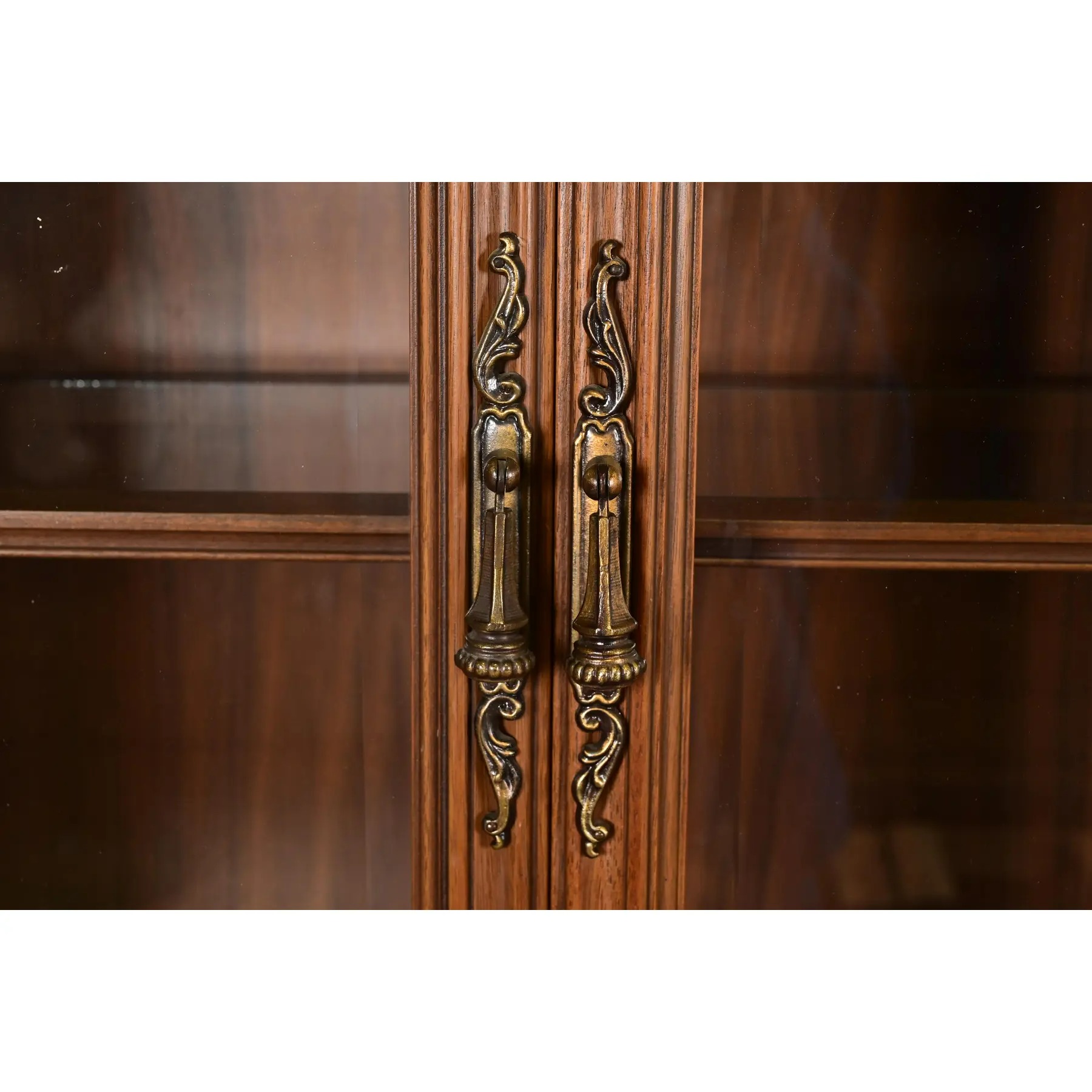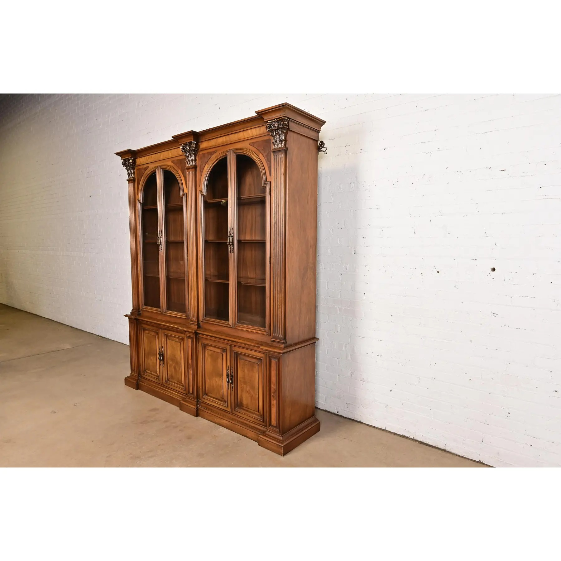 Walnut, with carved columns, burled walnut panels, glass front arched doors, and original brass hardware.
