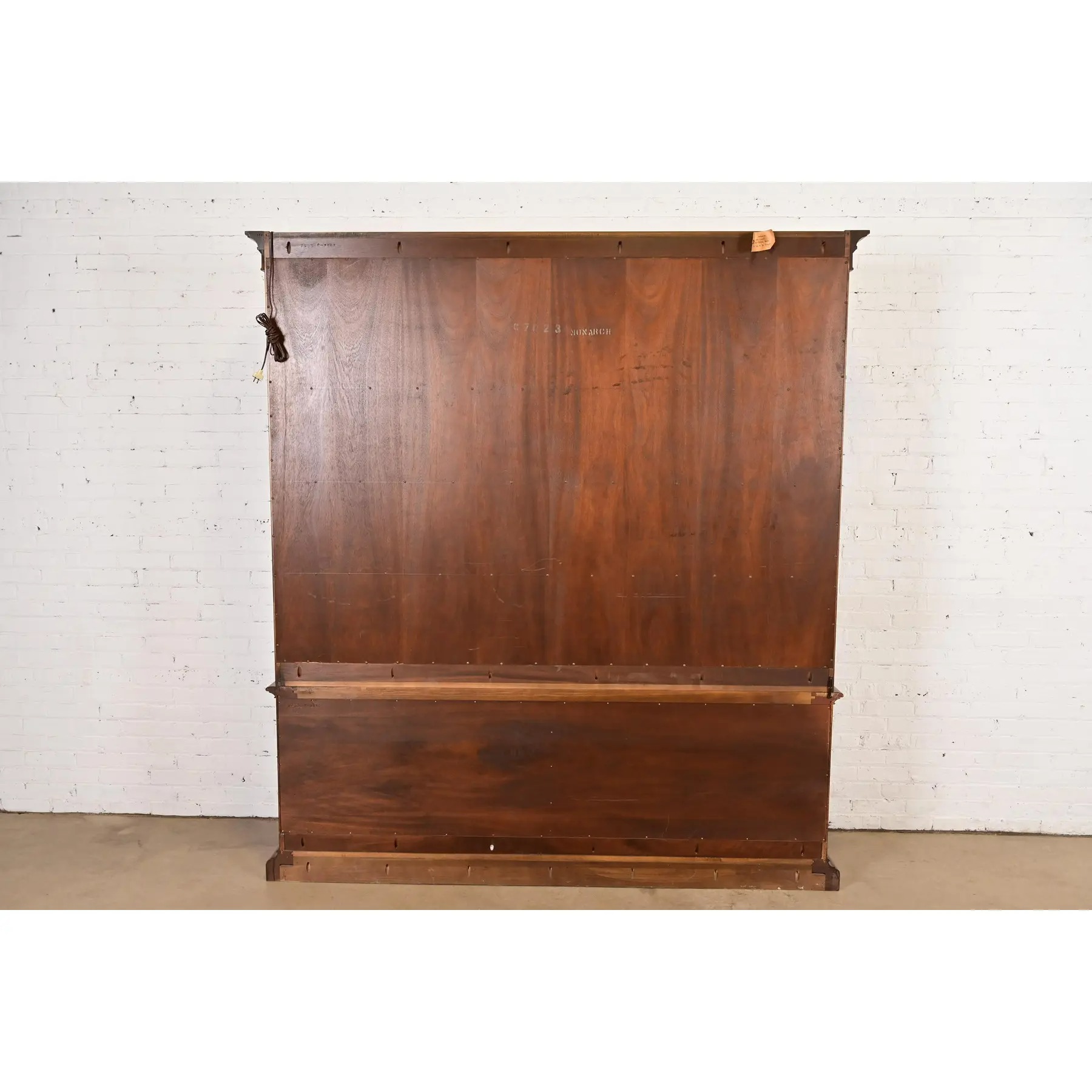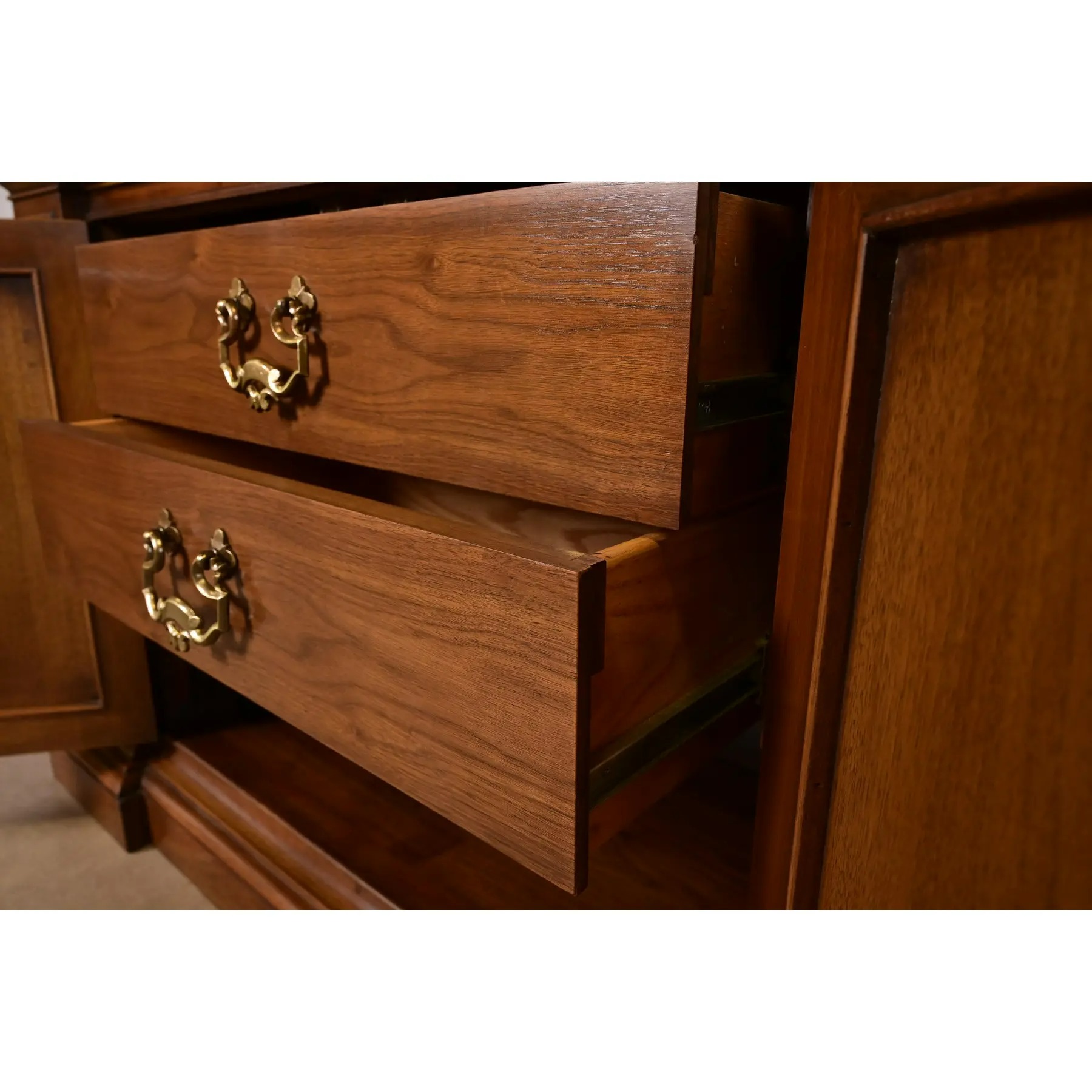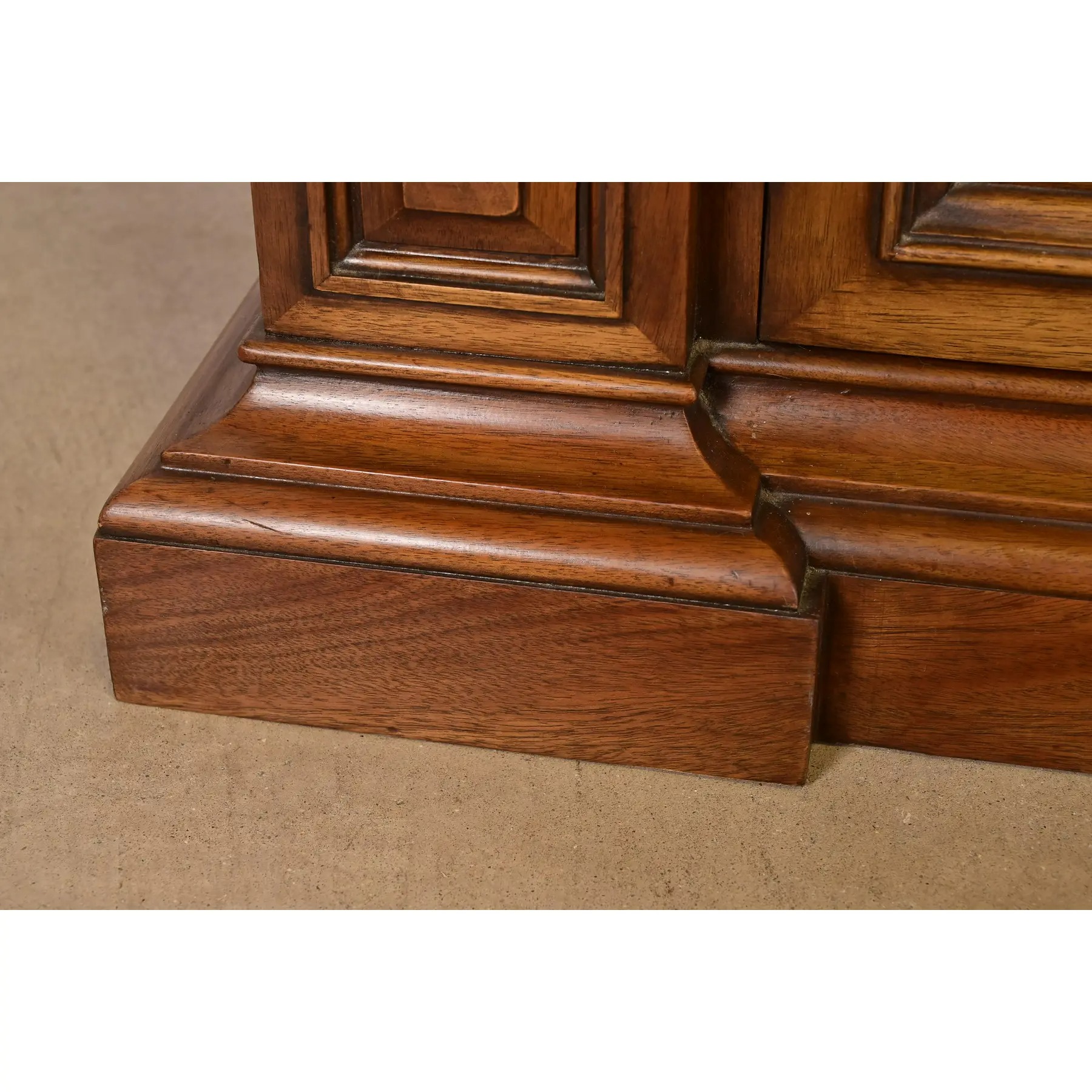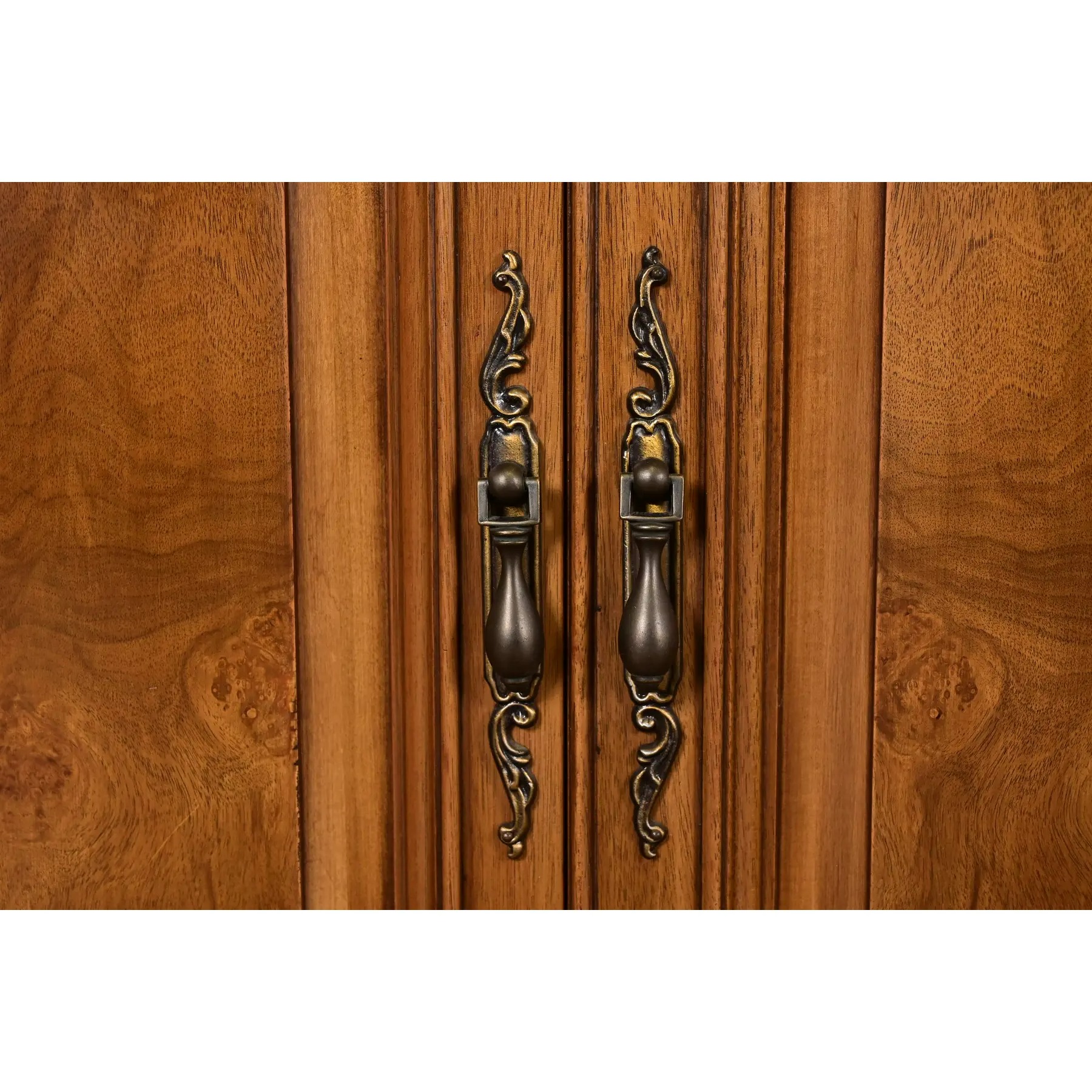 Walnut, with carved columns, burled walnut panels, glass front arched doors, and original brass hardware.