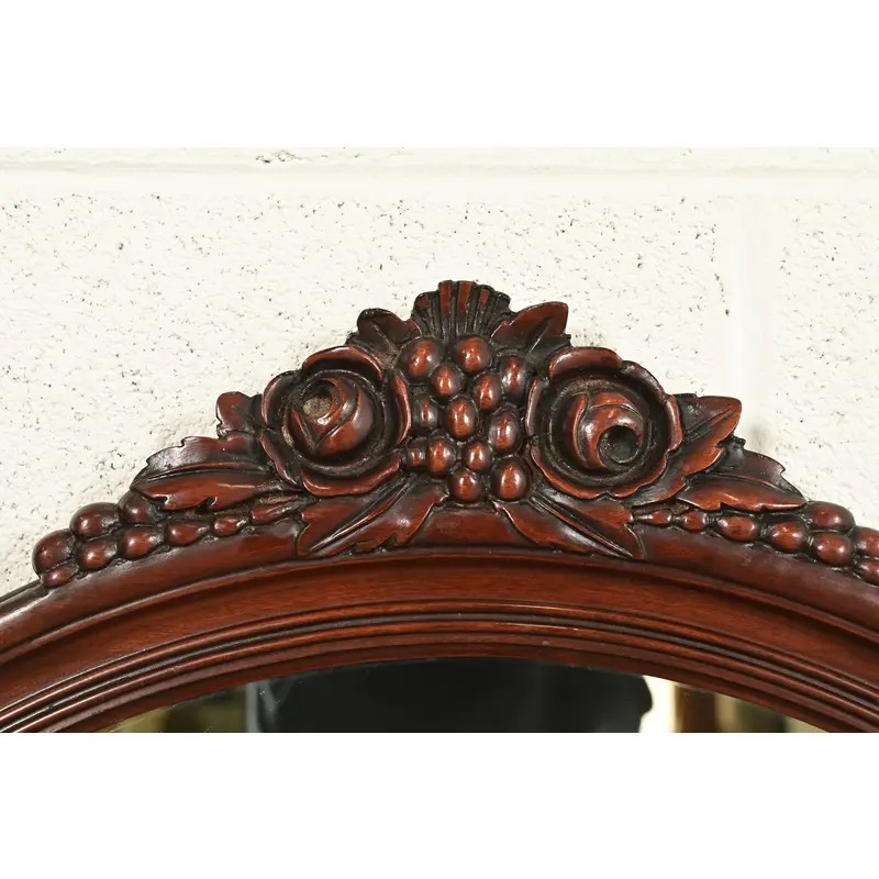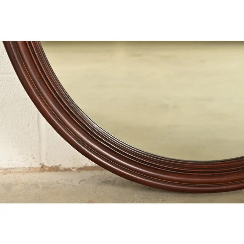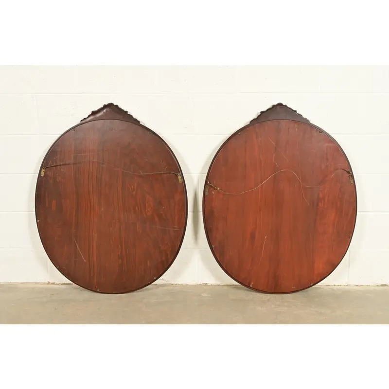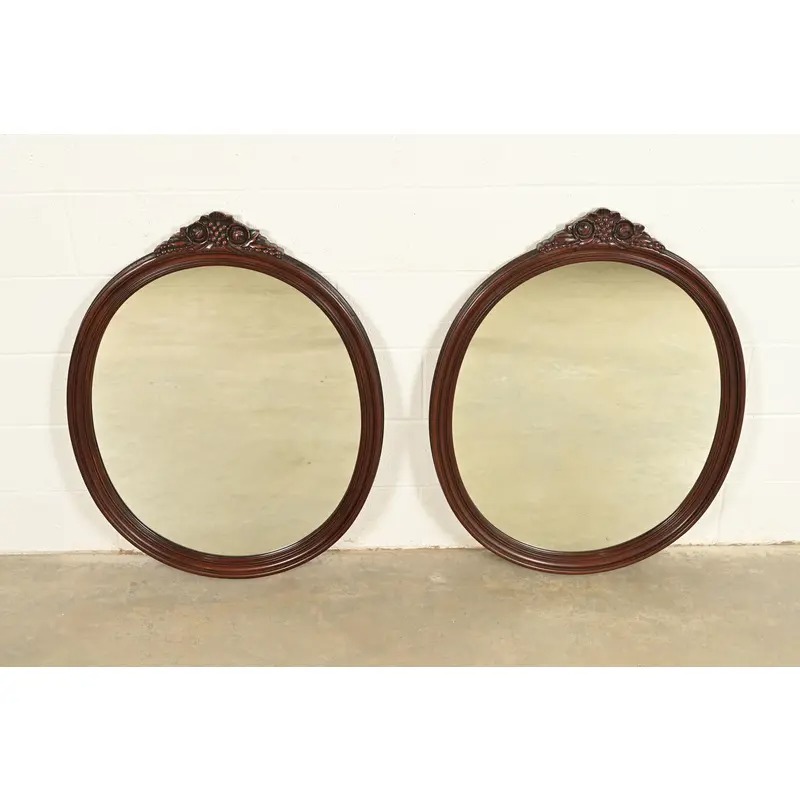 A gorgeous pair of antique Victorian or Neoclassical style carved mahogany framed oval wall mirrors
