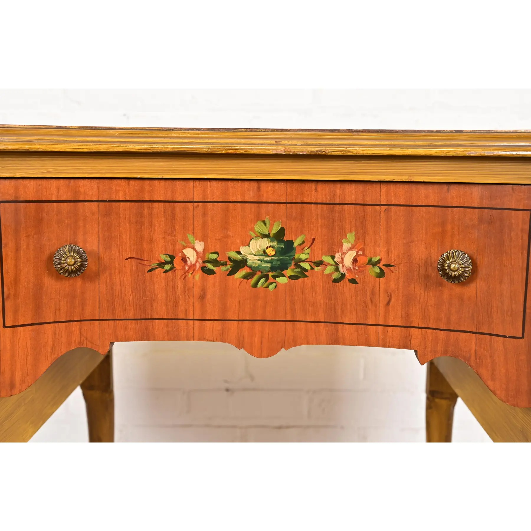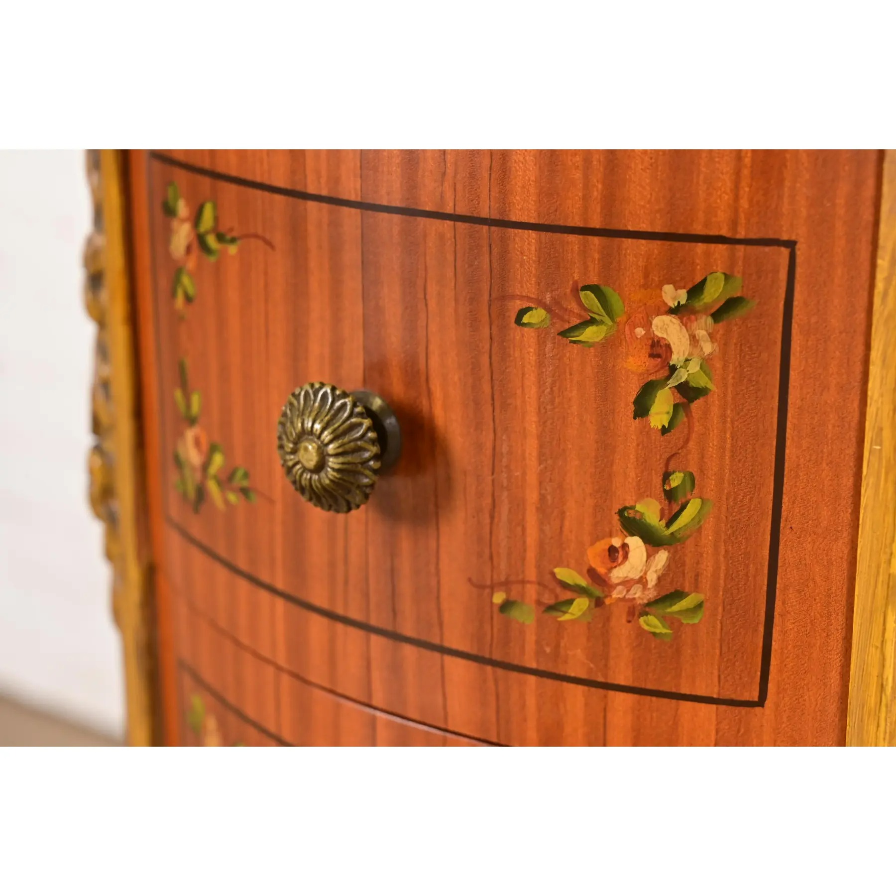 Beautiful carved satinwood, with original painted trim and legs, hand-painted floral accents, and original brass hardware.