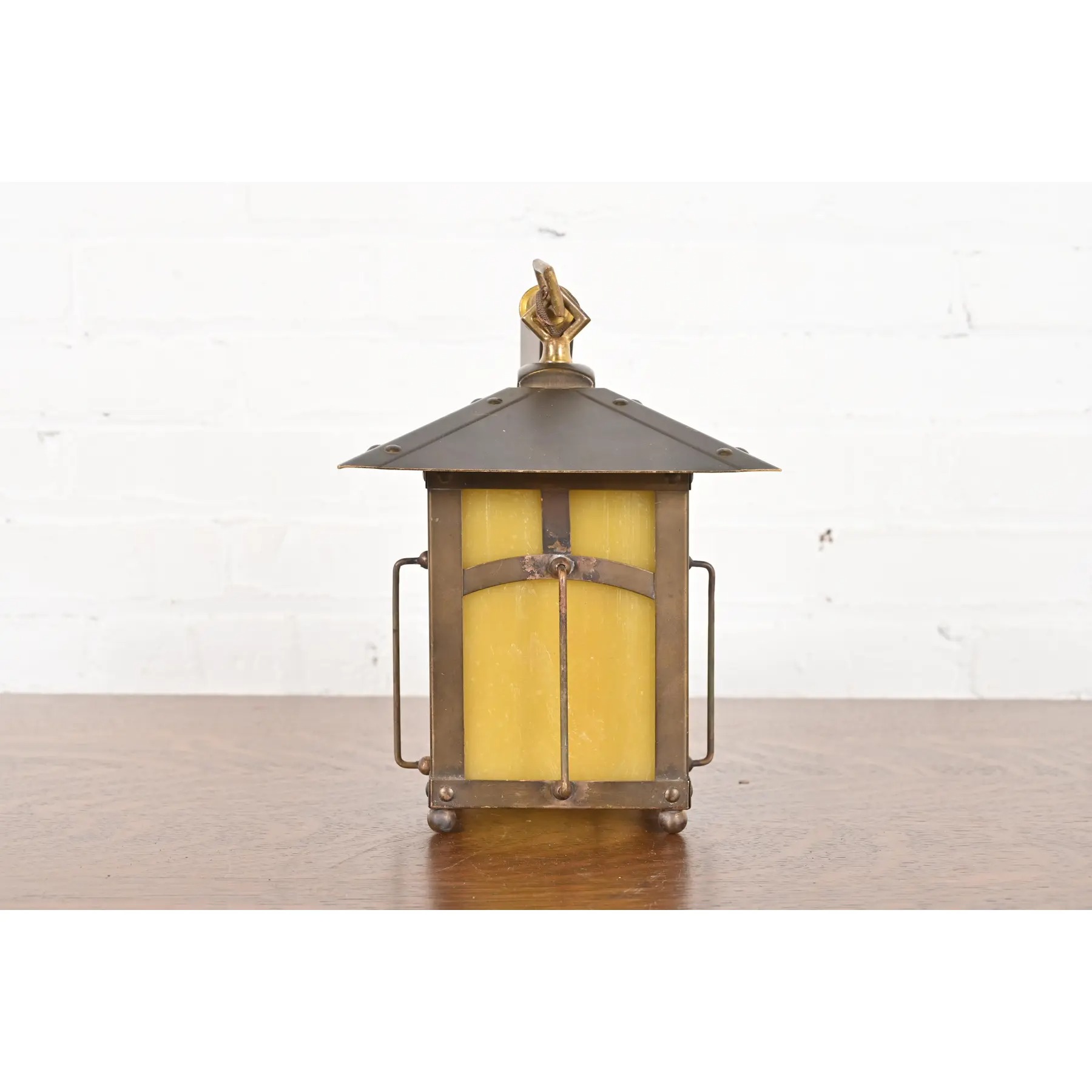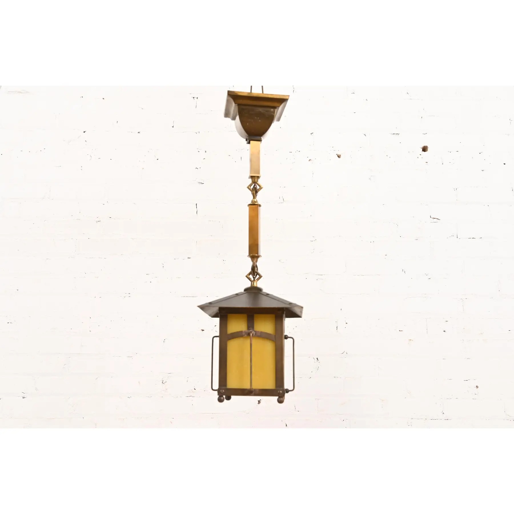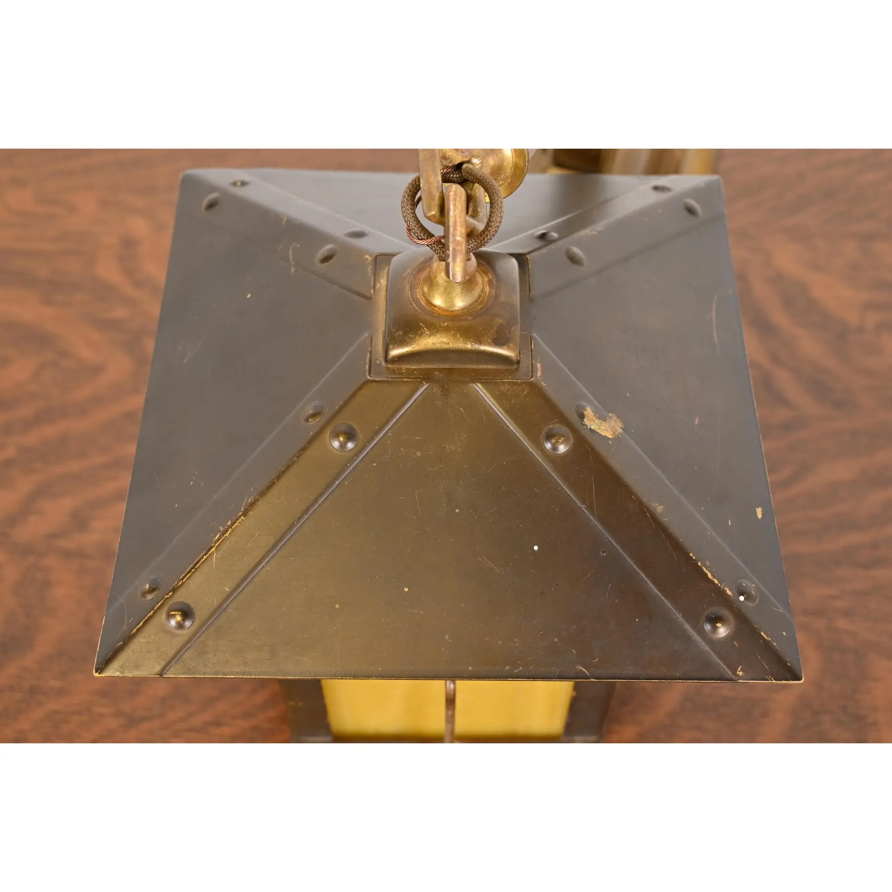 Roycroft Antique Arts & Crafts Brass and Caramel Glass Lantern Pendant Light, Circa 1920s