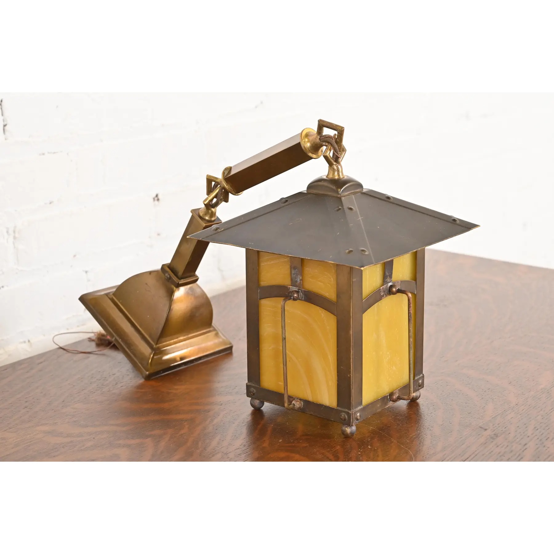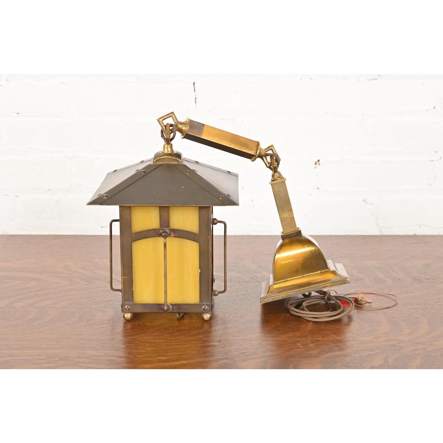 A rare and exceptional antique Arts & Crafts period brass and caramel glass lantern pendant light
