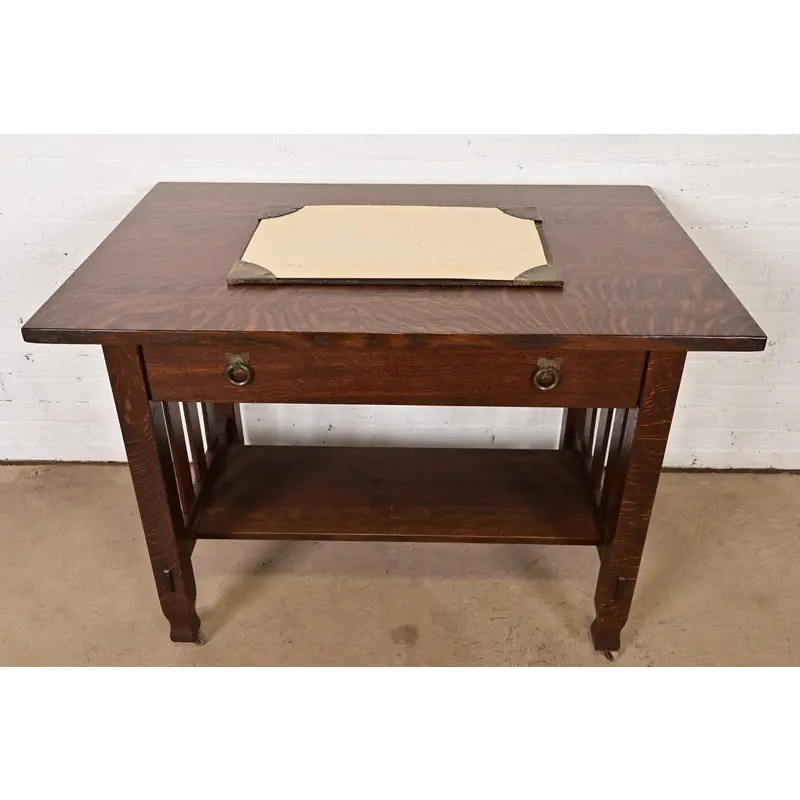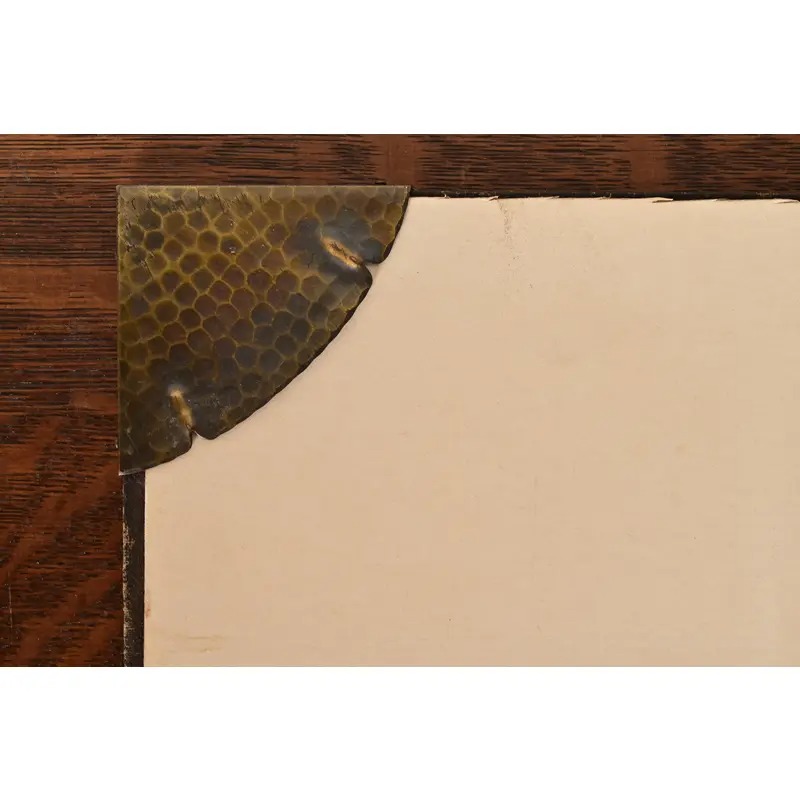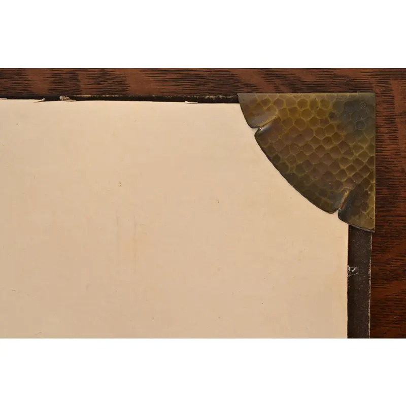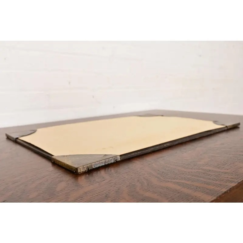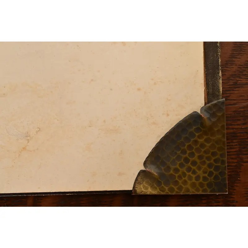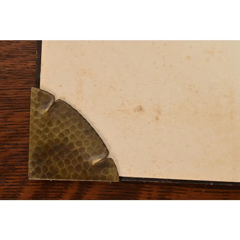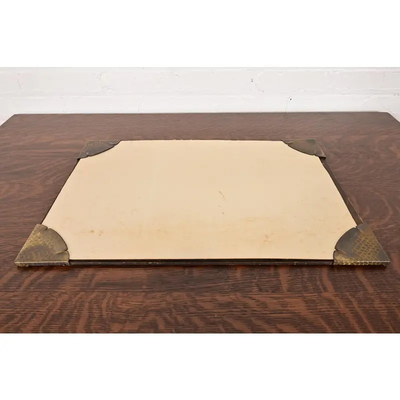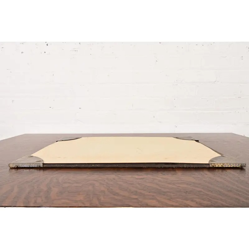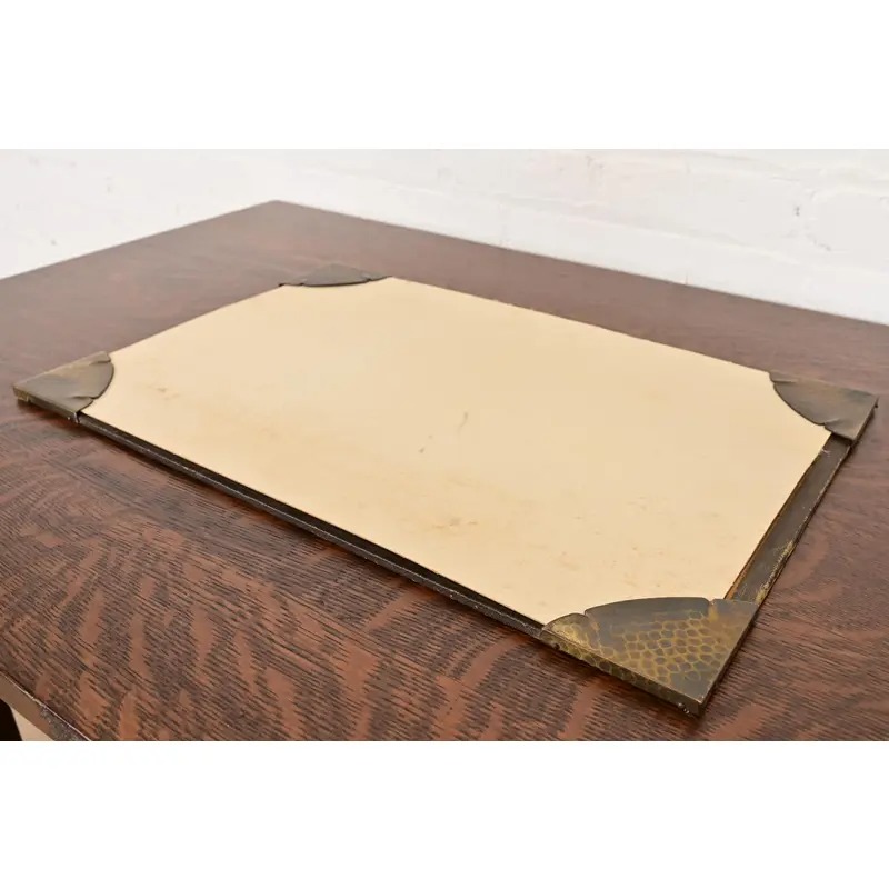 A gorgeous set of Arts & Crafts period brass finished hand hammered copper blotter corners with desk blotter