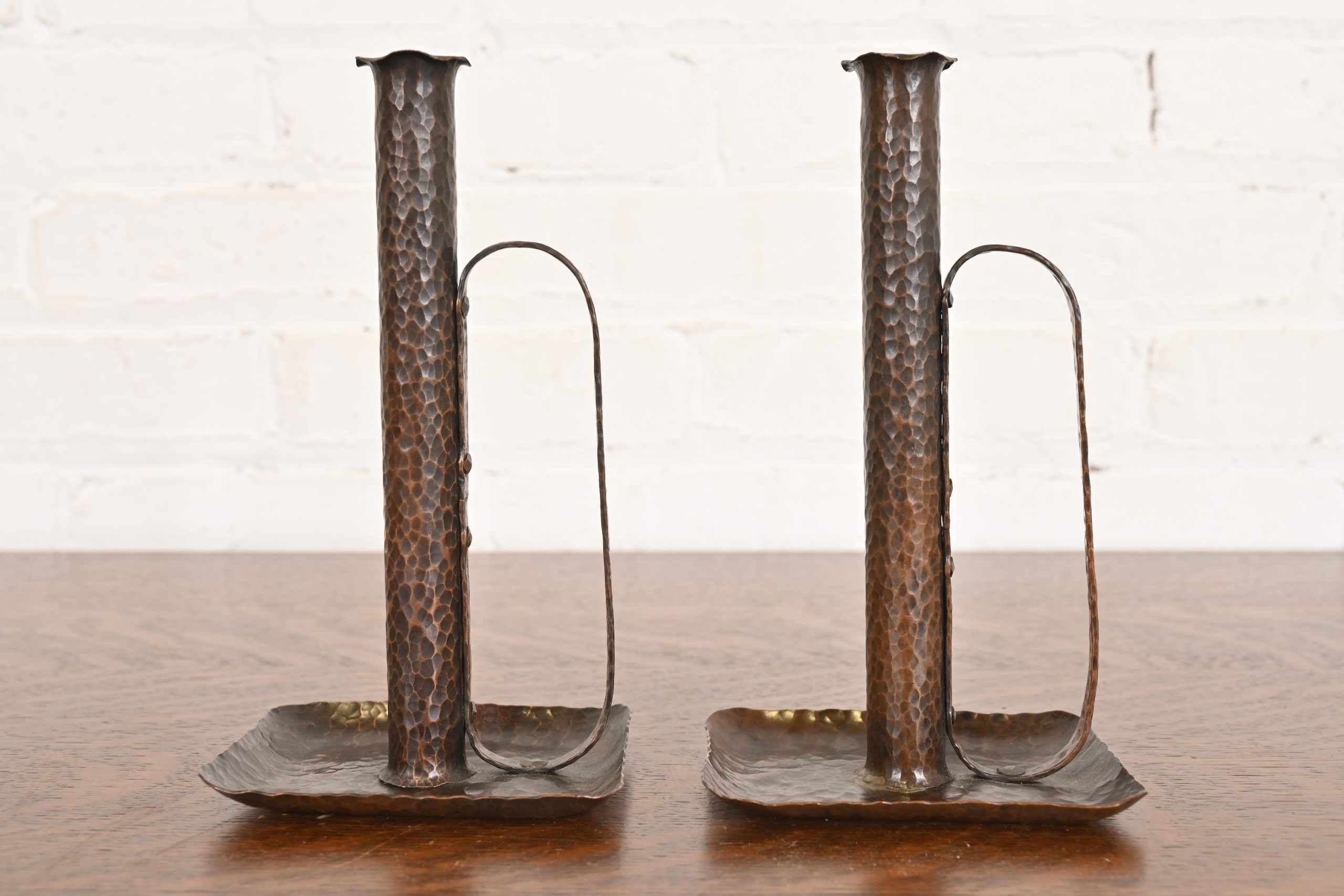 A gorgeous pair of Arts & Crafts period hand hammered copper chambersticks or candlesticks with handles