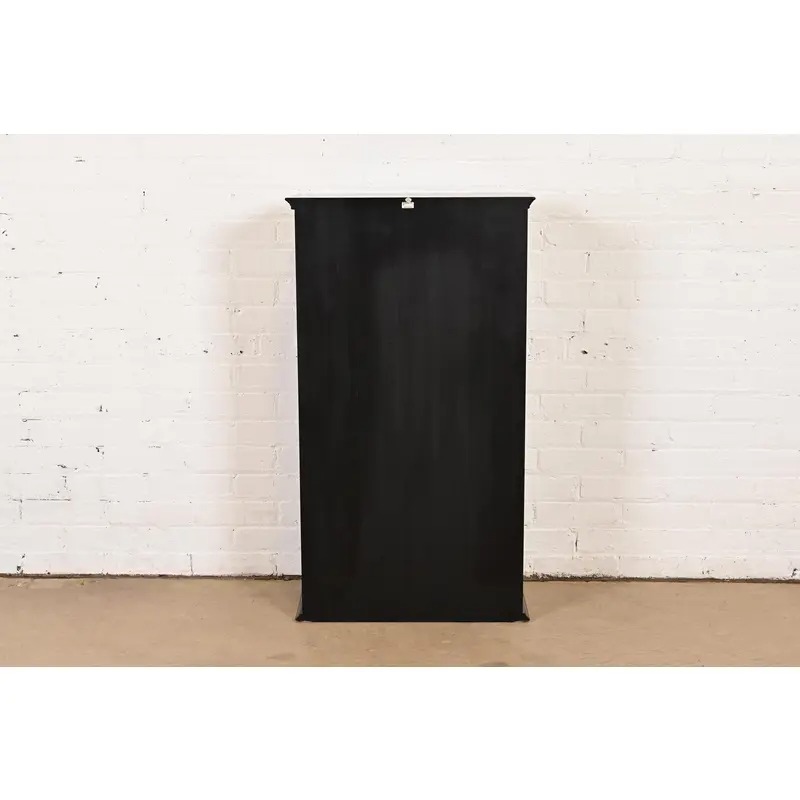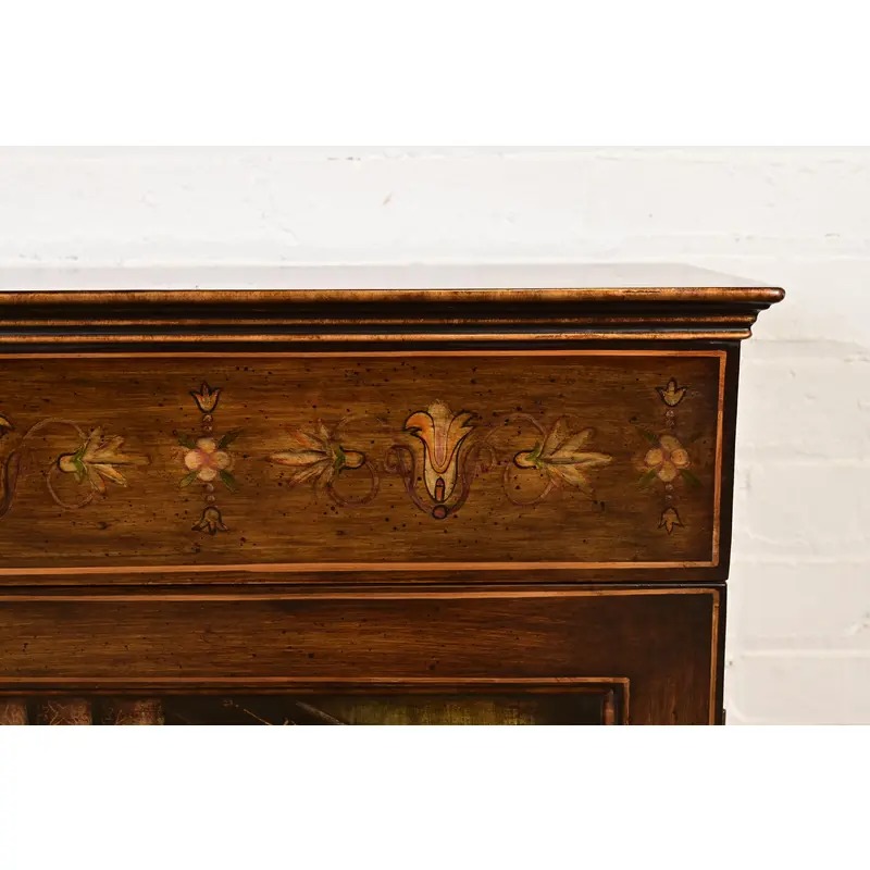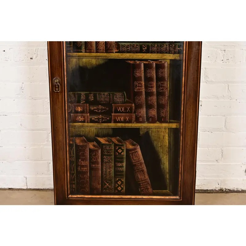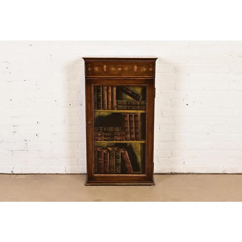 A gorgeous English Regency or Sheraton style hand painted bookcase featuring a trompe-l’œil painting of books on the door.
