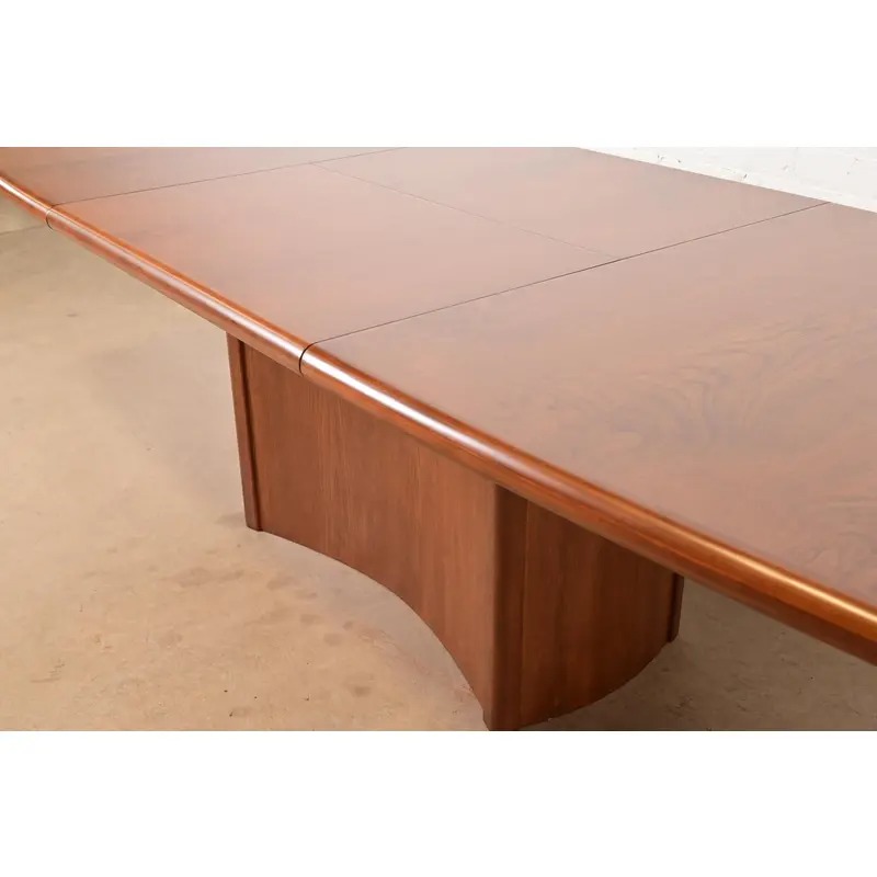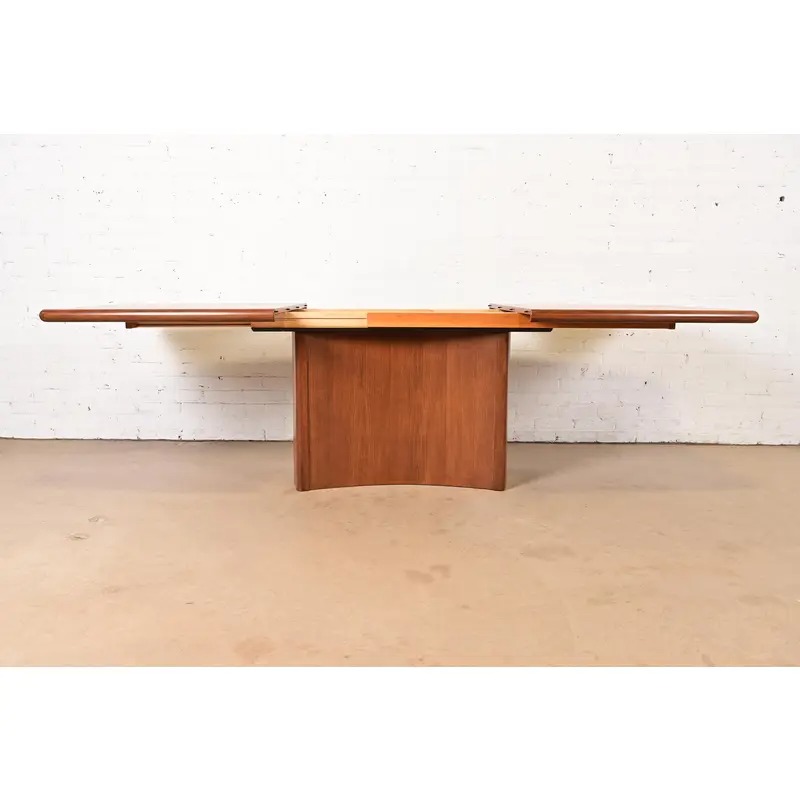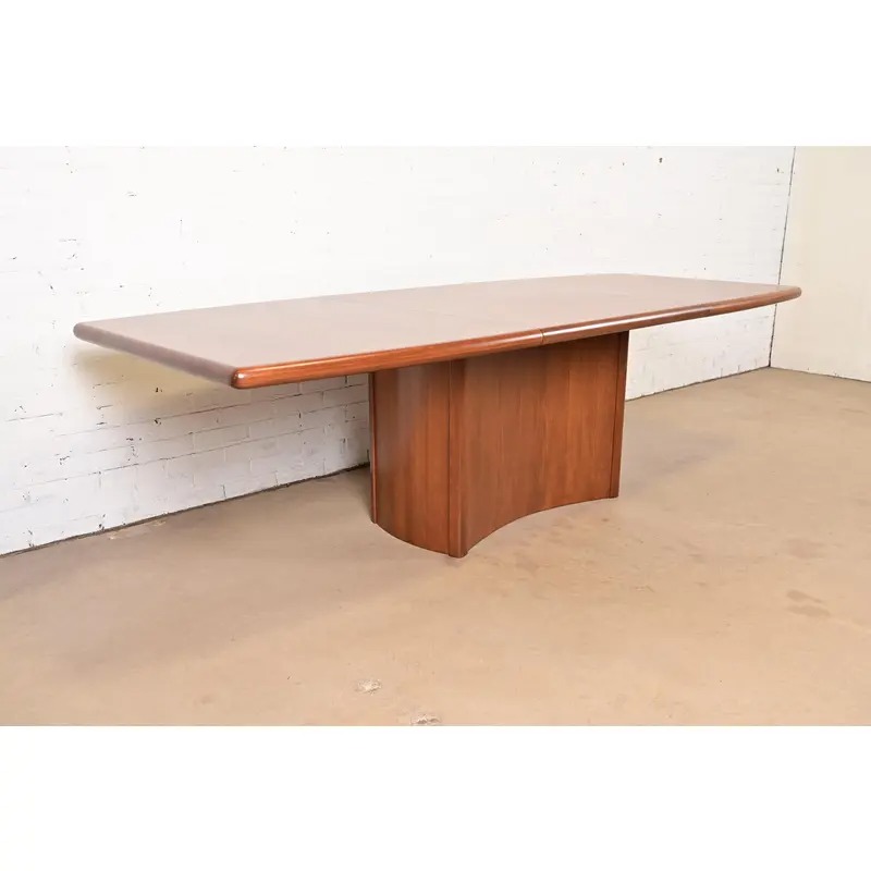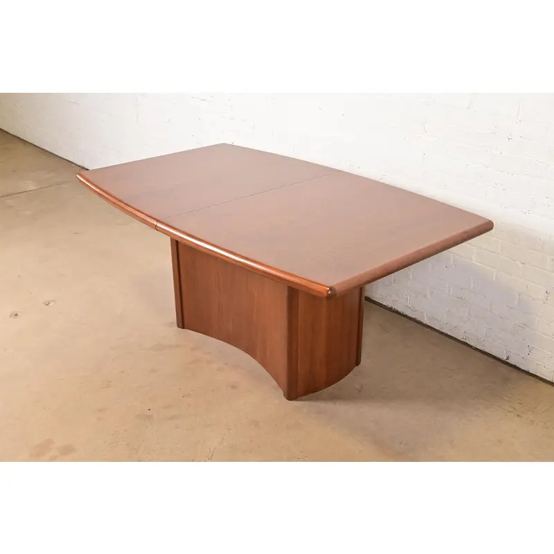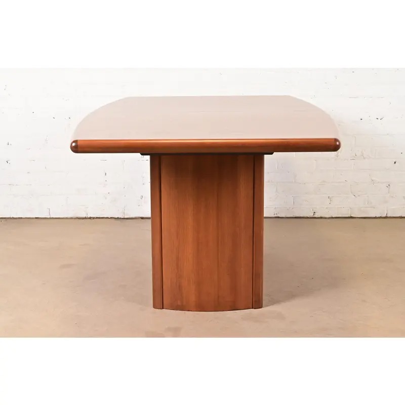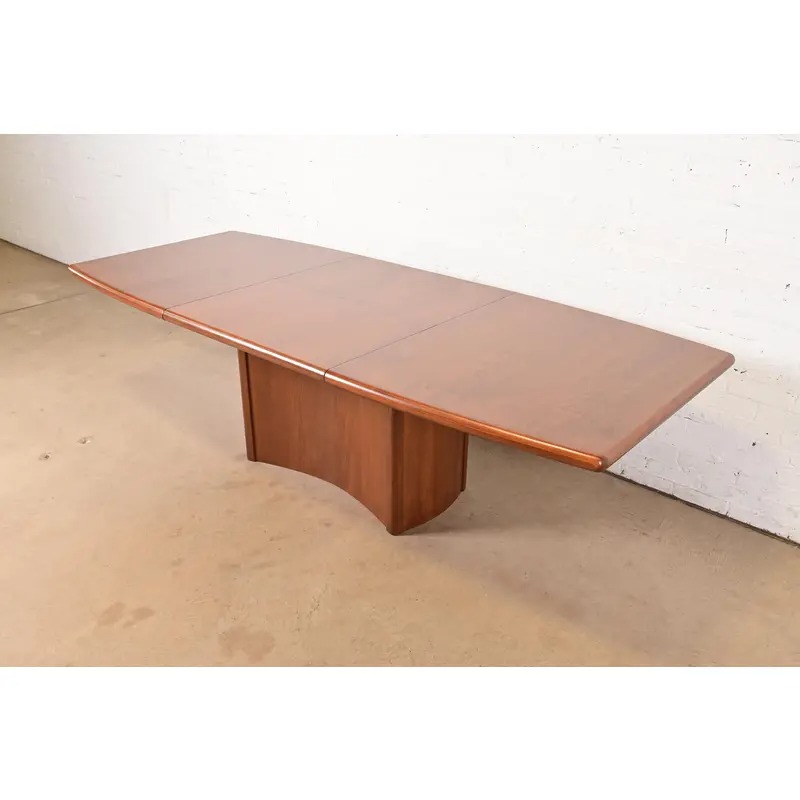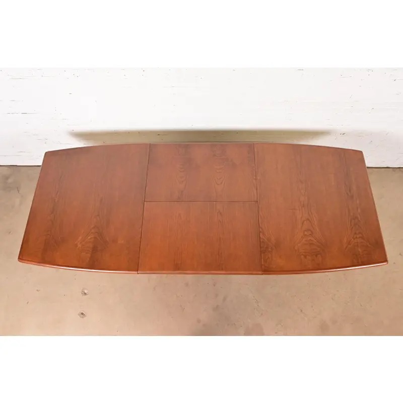 An exceptional Danish Modern teak boat-shaped pedestal extension dining table