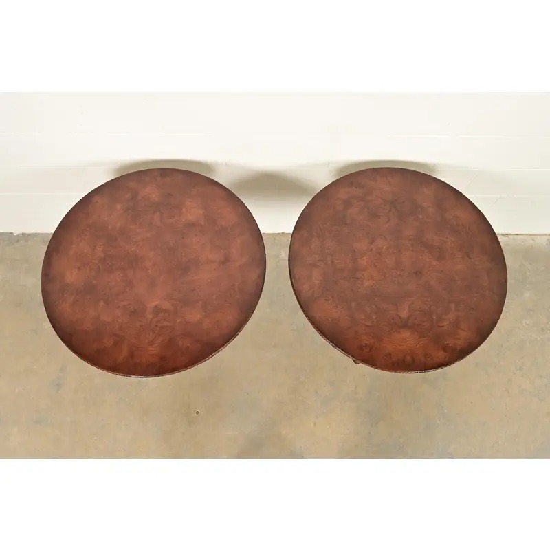 Beautiful book-matched burl wood tops, with carved mahogany trim and pedestals.