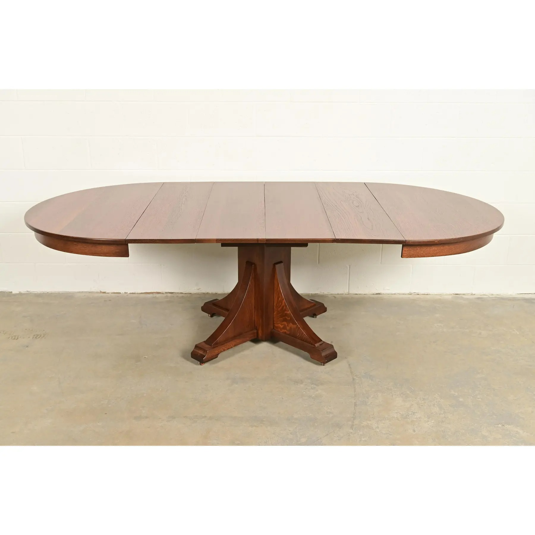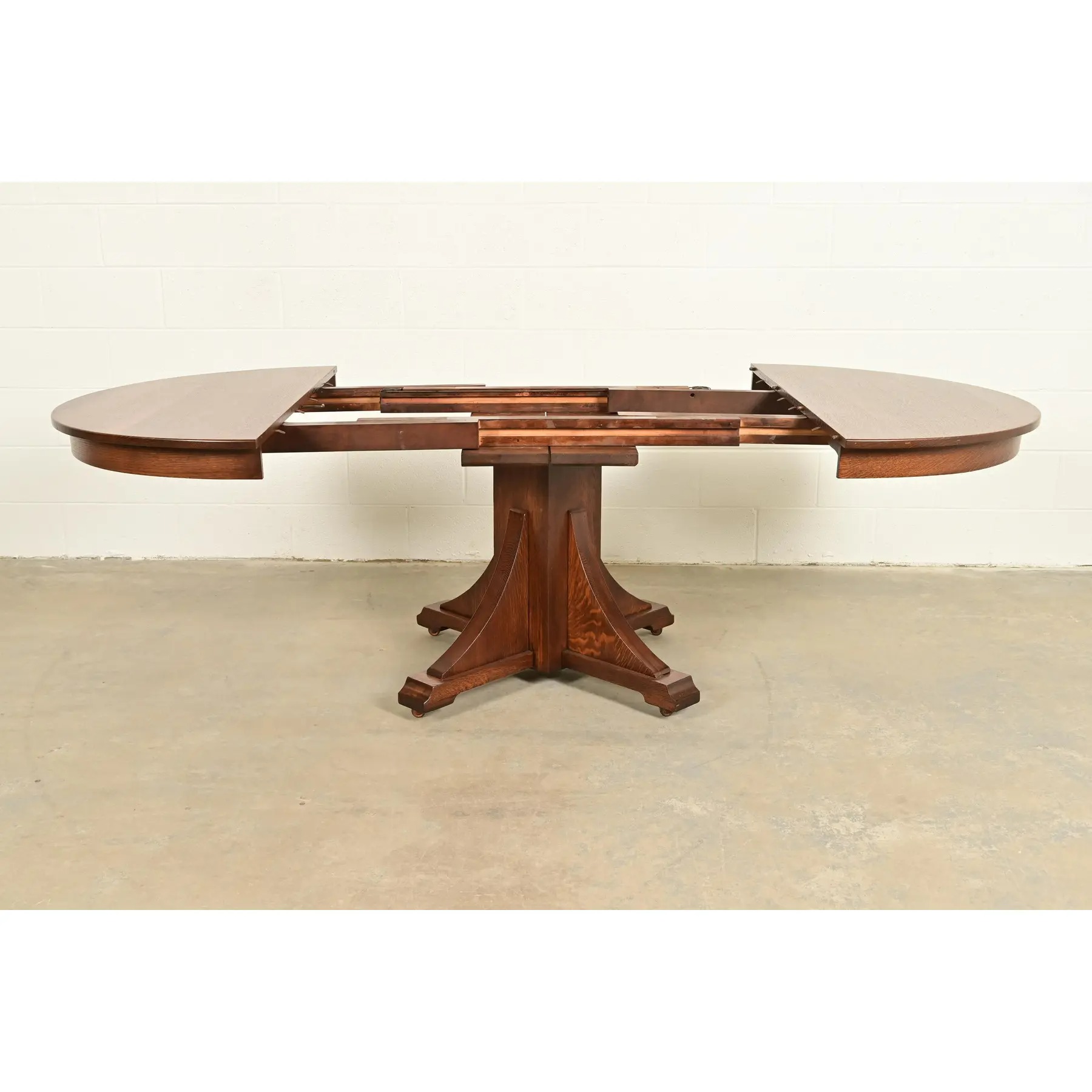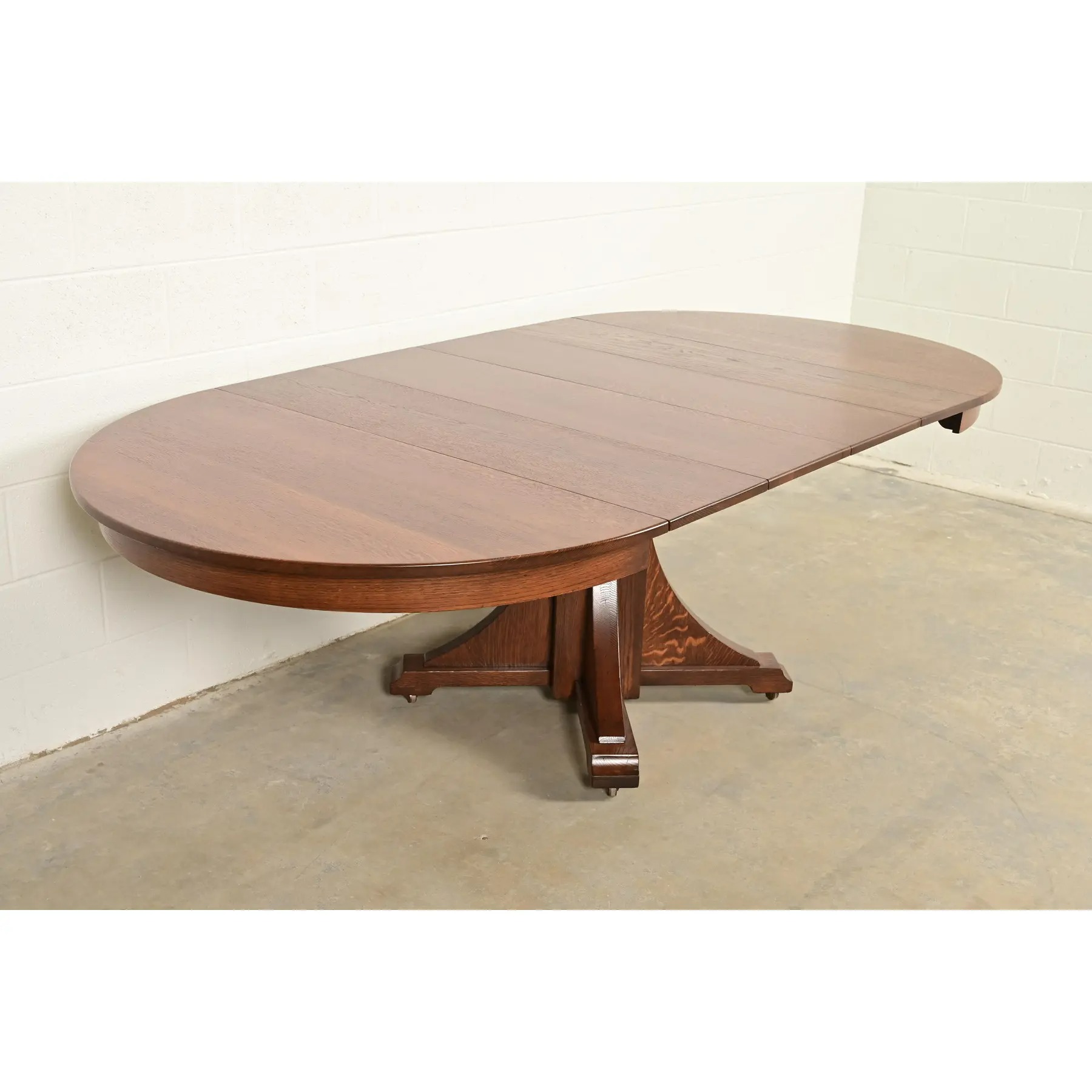 An exceptional antique Mission or Arts & Crafts period quarter sawn oak pedestal extension dining table