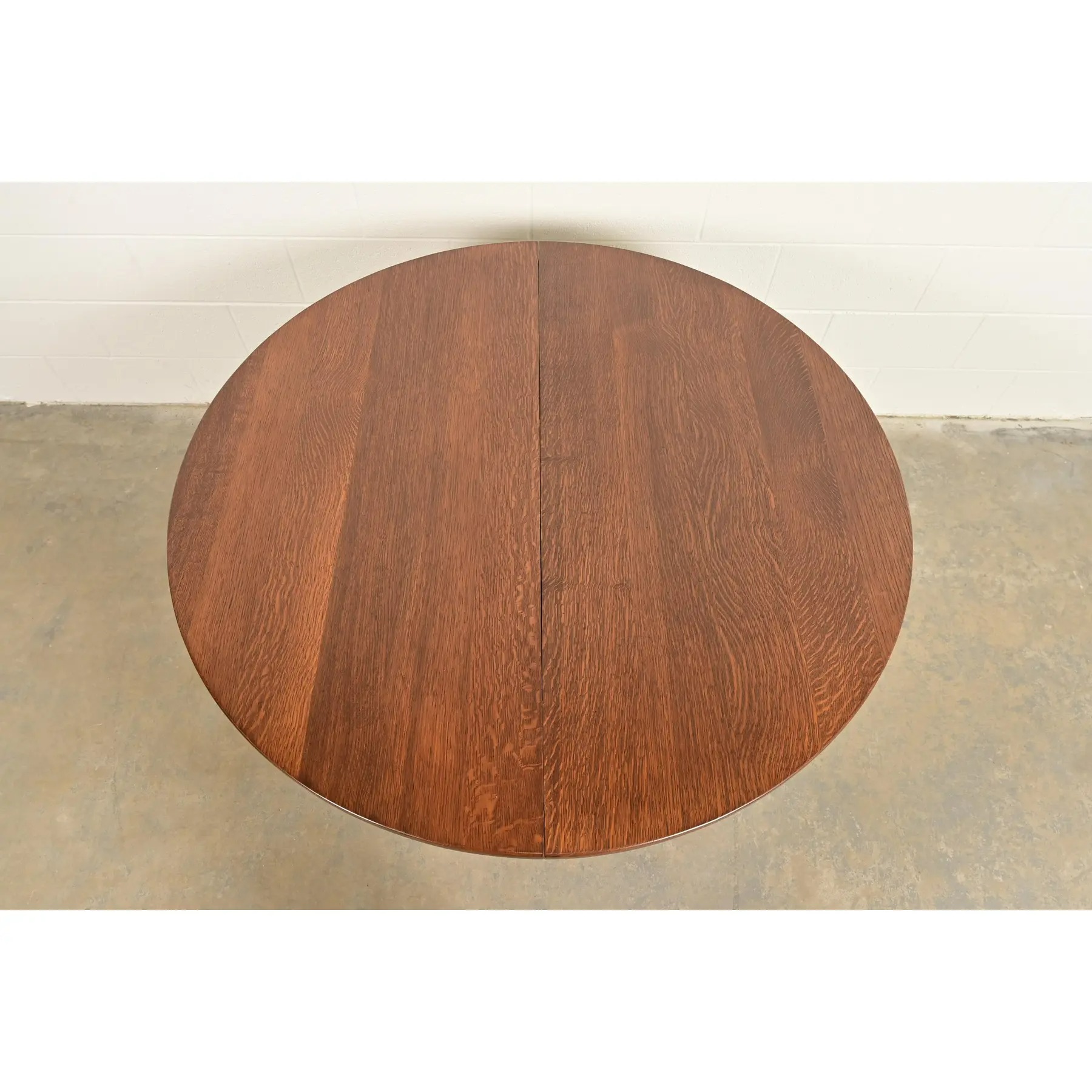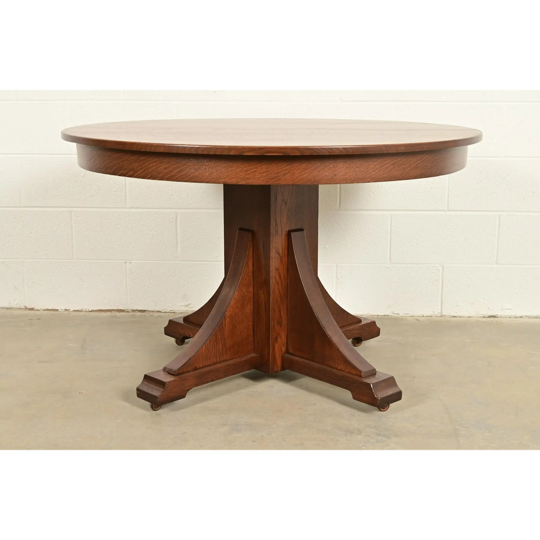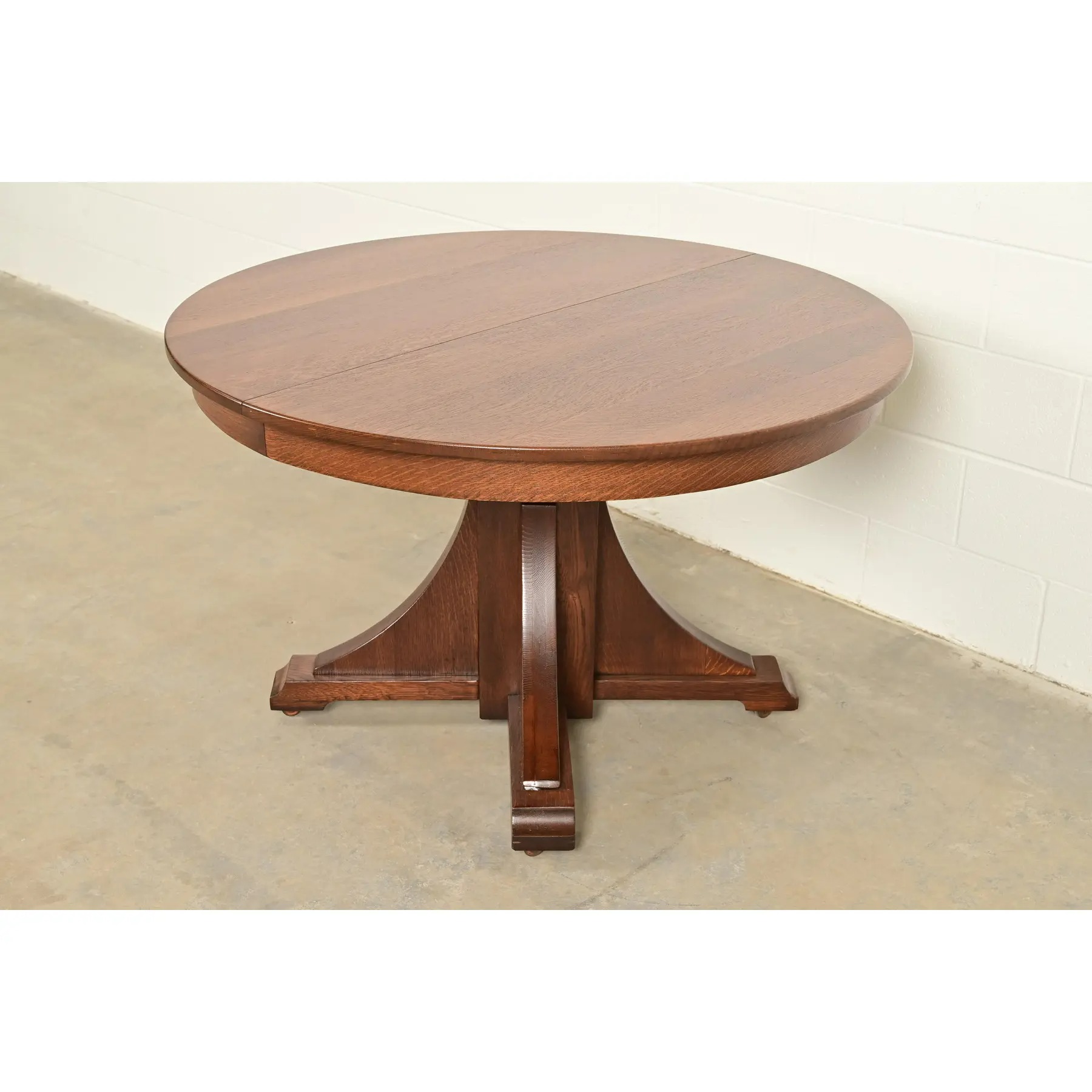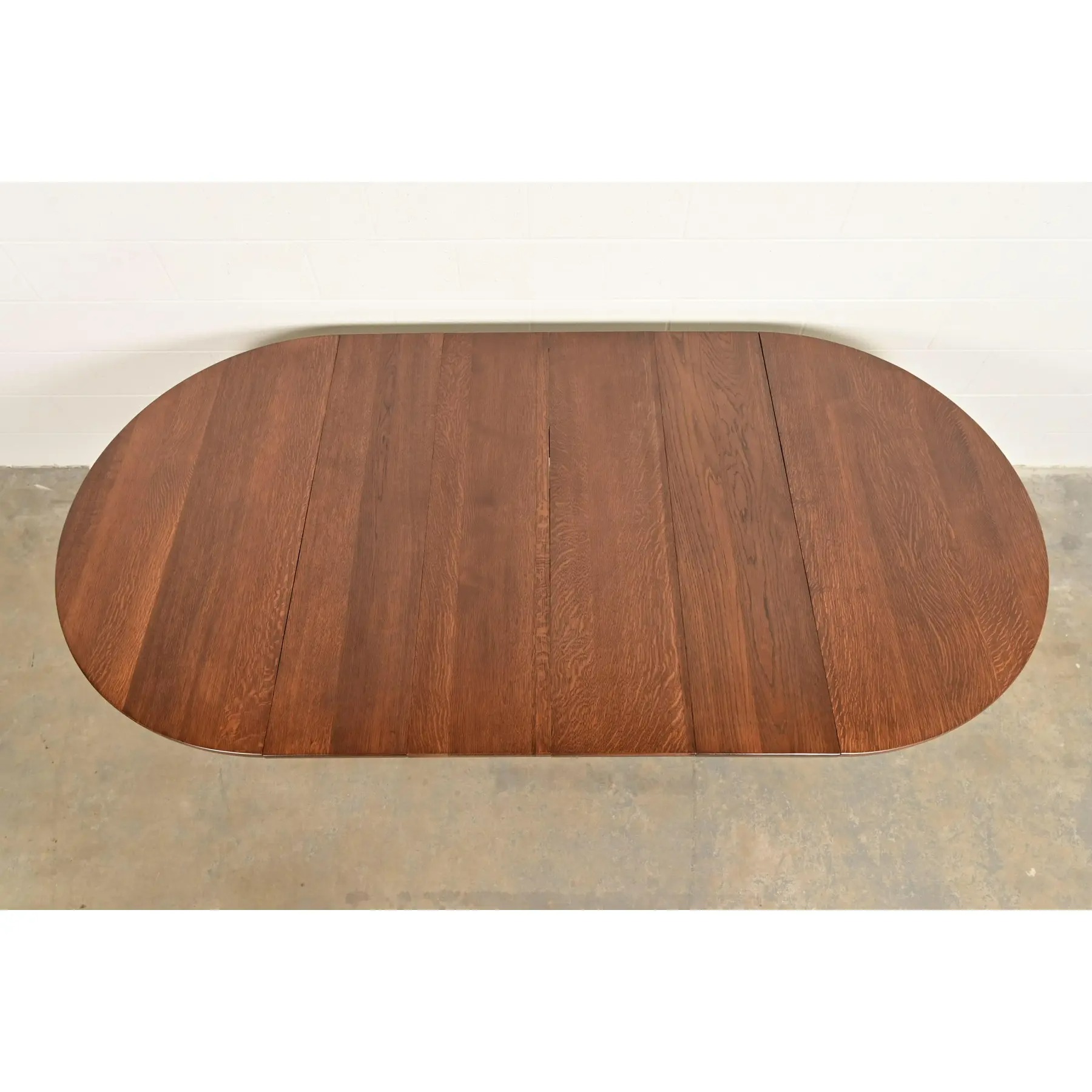 An exceptional antique Mission or Arts & Crafts period quarter sawn oak pedestal extension dining table