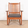 Solid quarter sawn oak, with newly reupholstered brown leather seat cushion.