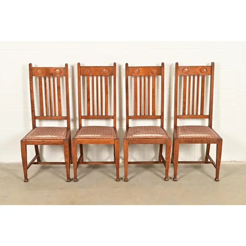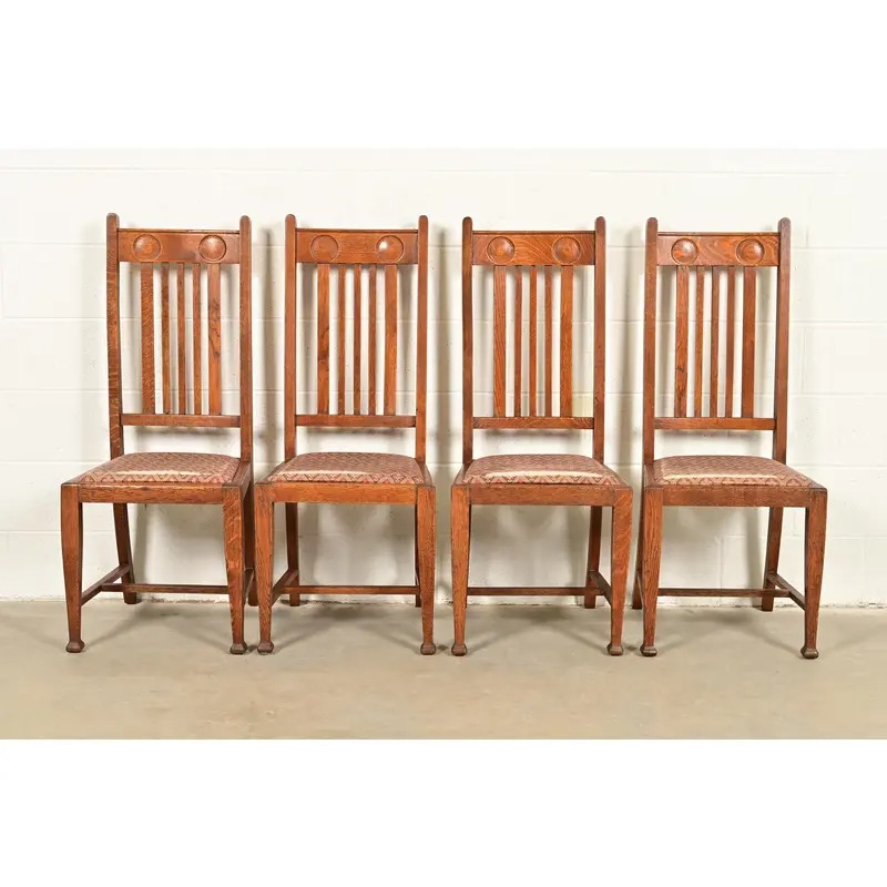 A fantastic set of four antique English Arts & Crafts high back dining chairs