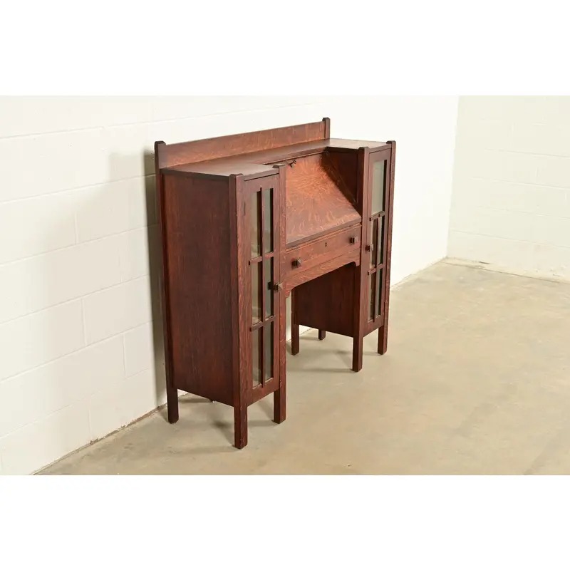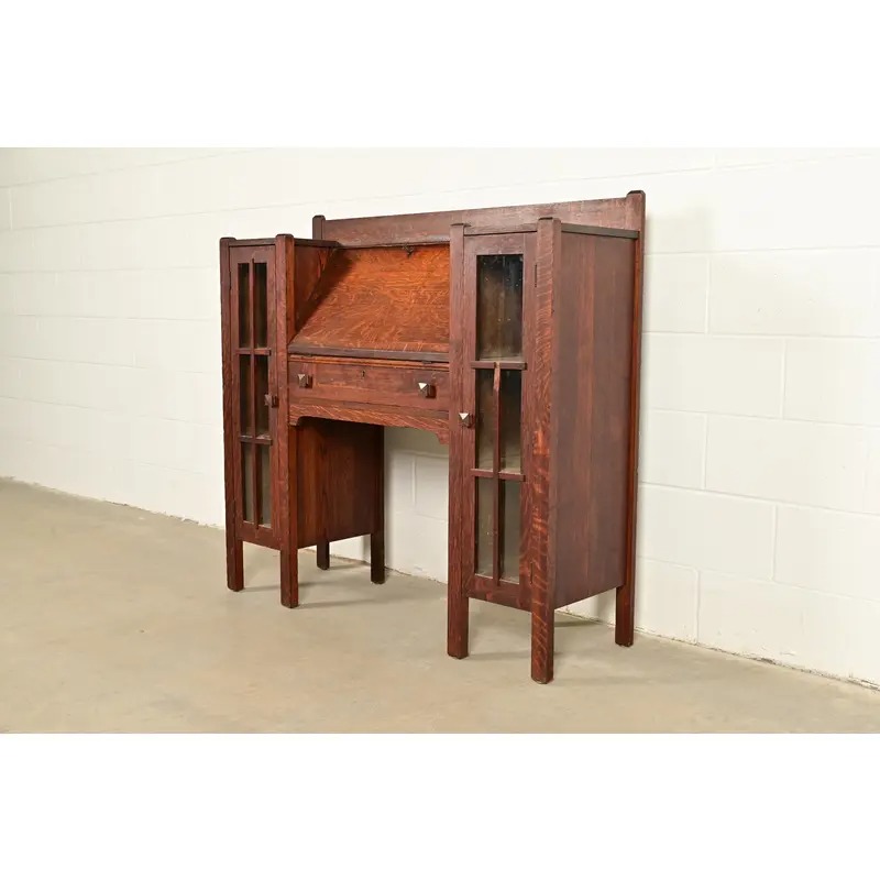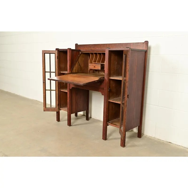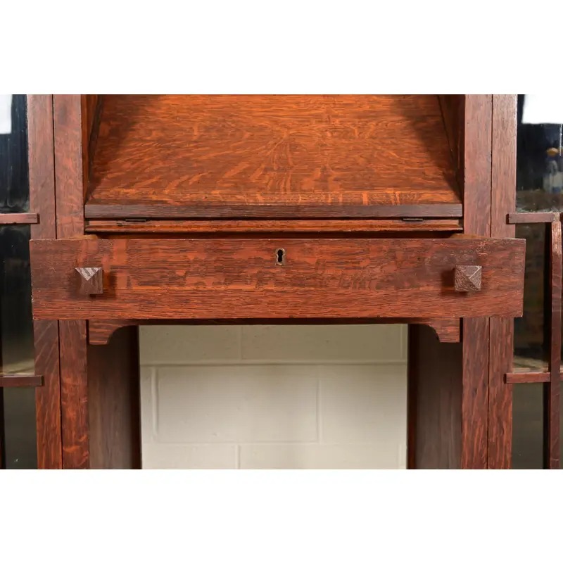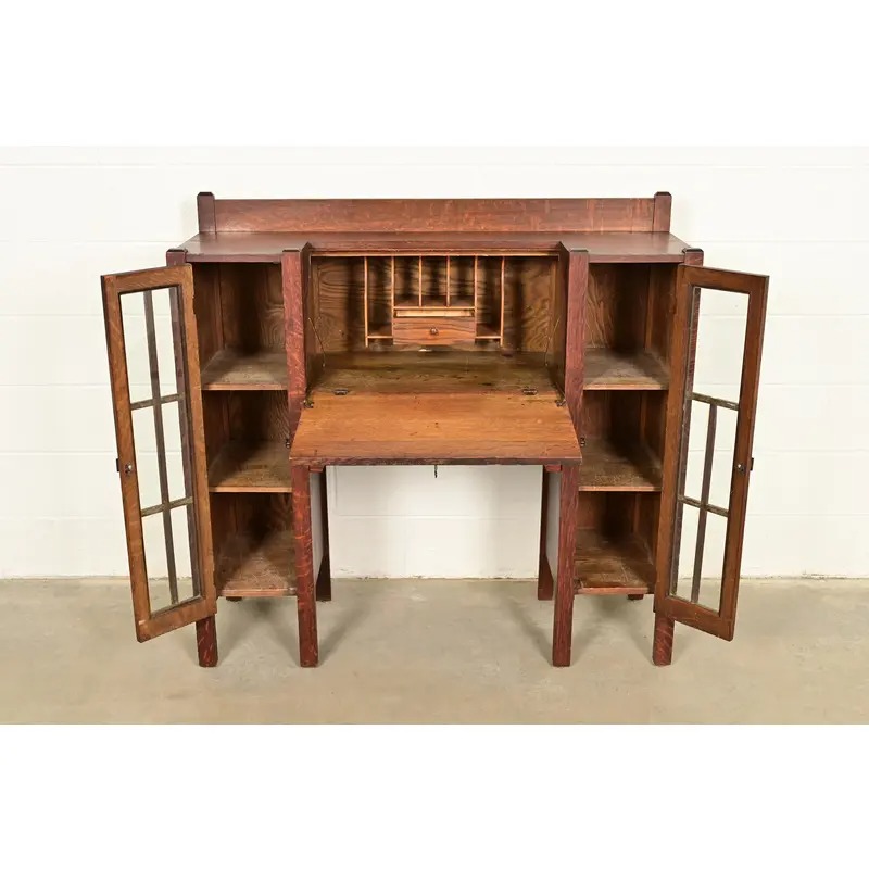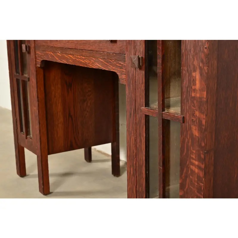 An outstanding antique Mission or Arts & Crafts side-by-side double bookcase cabinet with drop front secretary desk