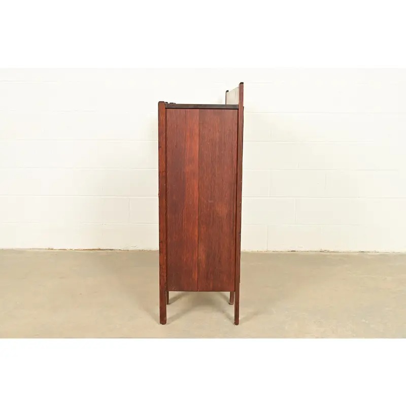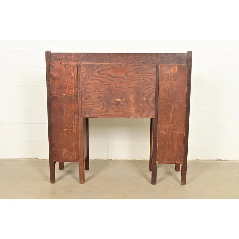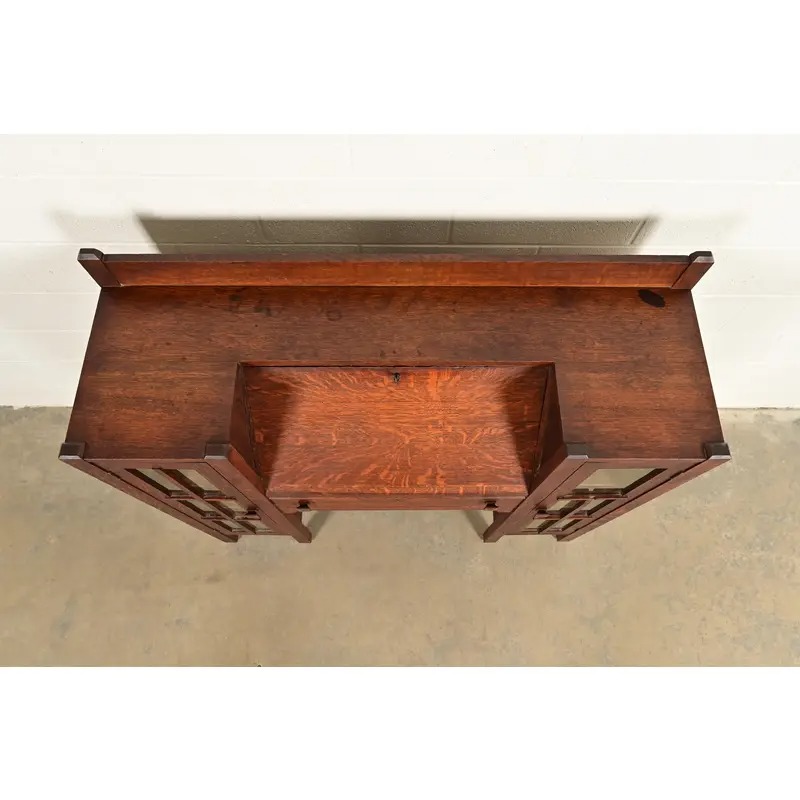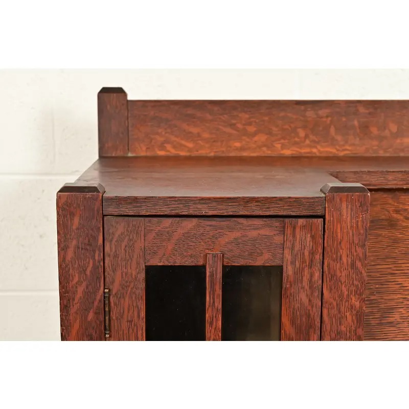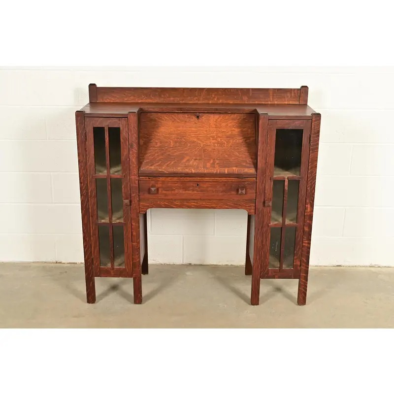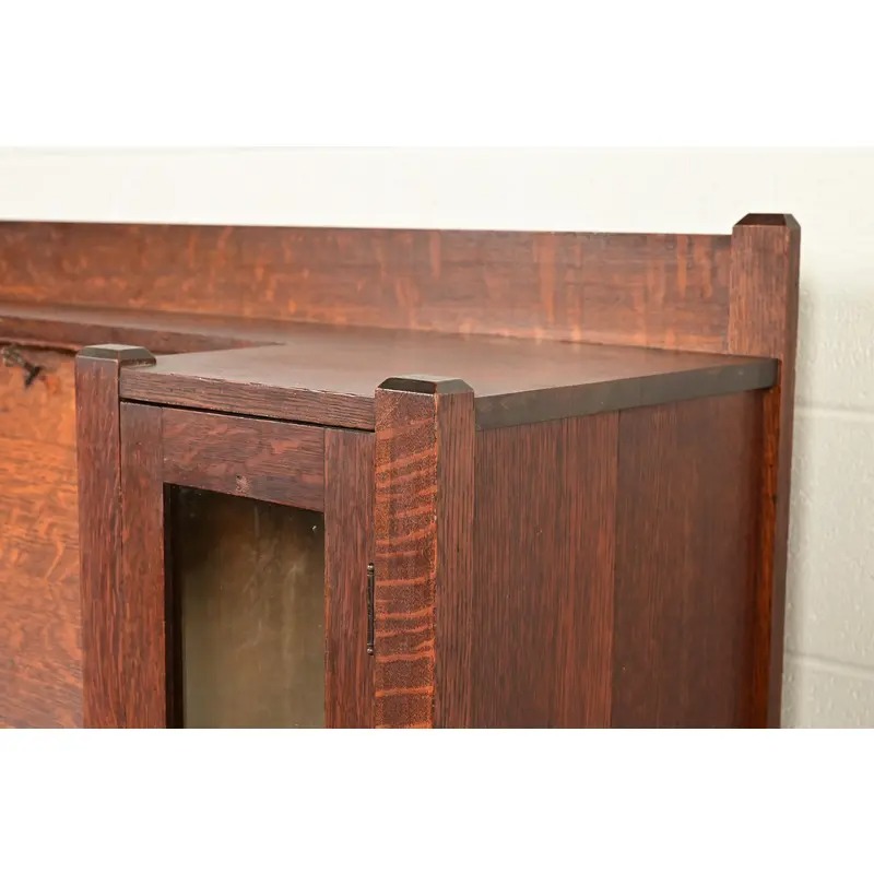 An outstanding antique Mission or Arts & Crafts side-by-side double bookcase cabinet with drop front secretary desk