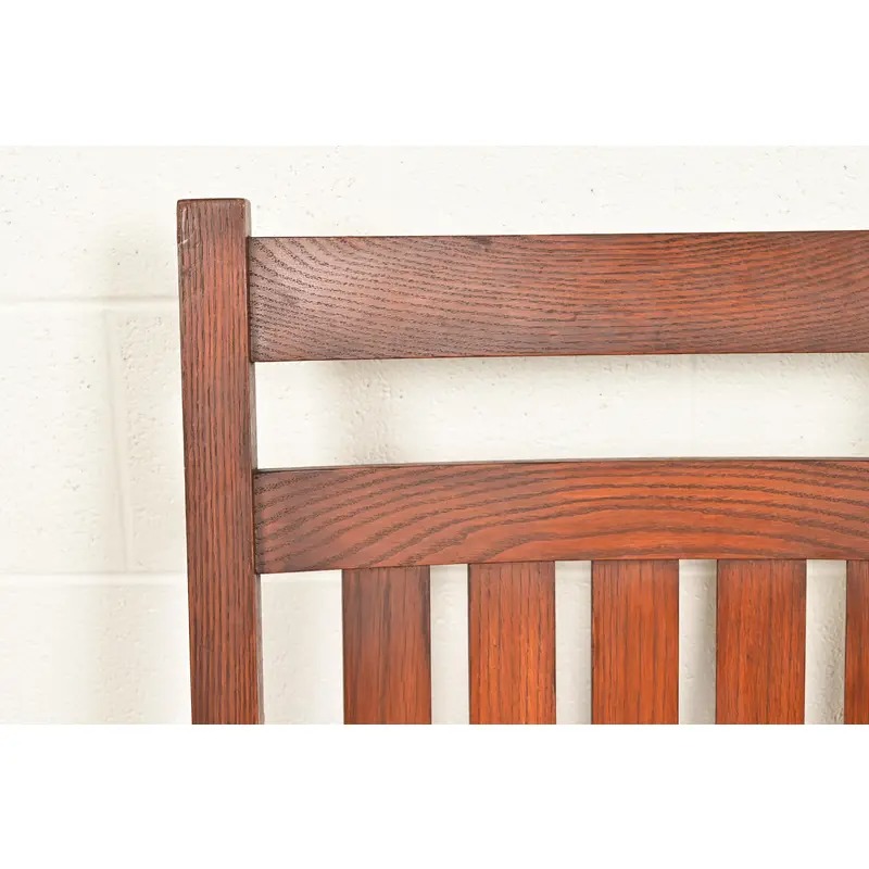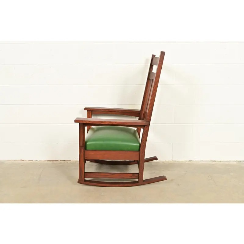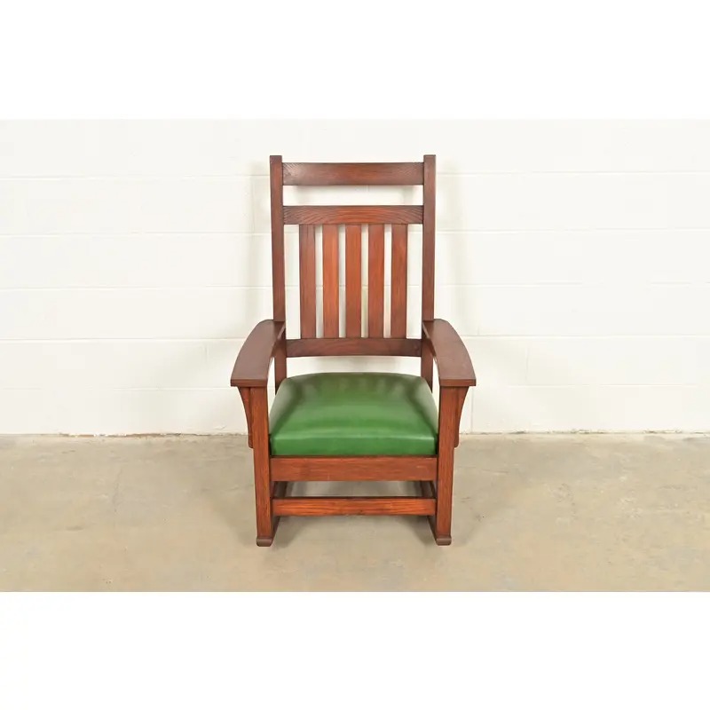 Solid quarter sawn oak, with green vinyl upholstered seat cushion.