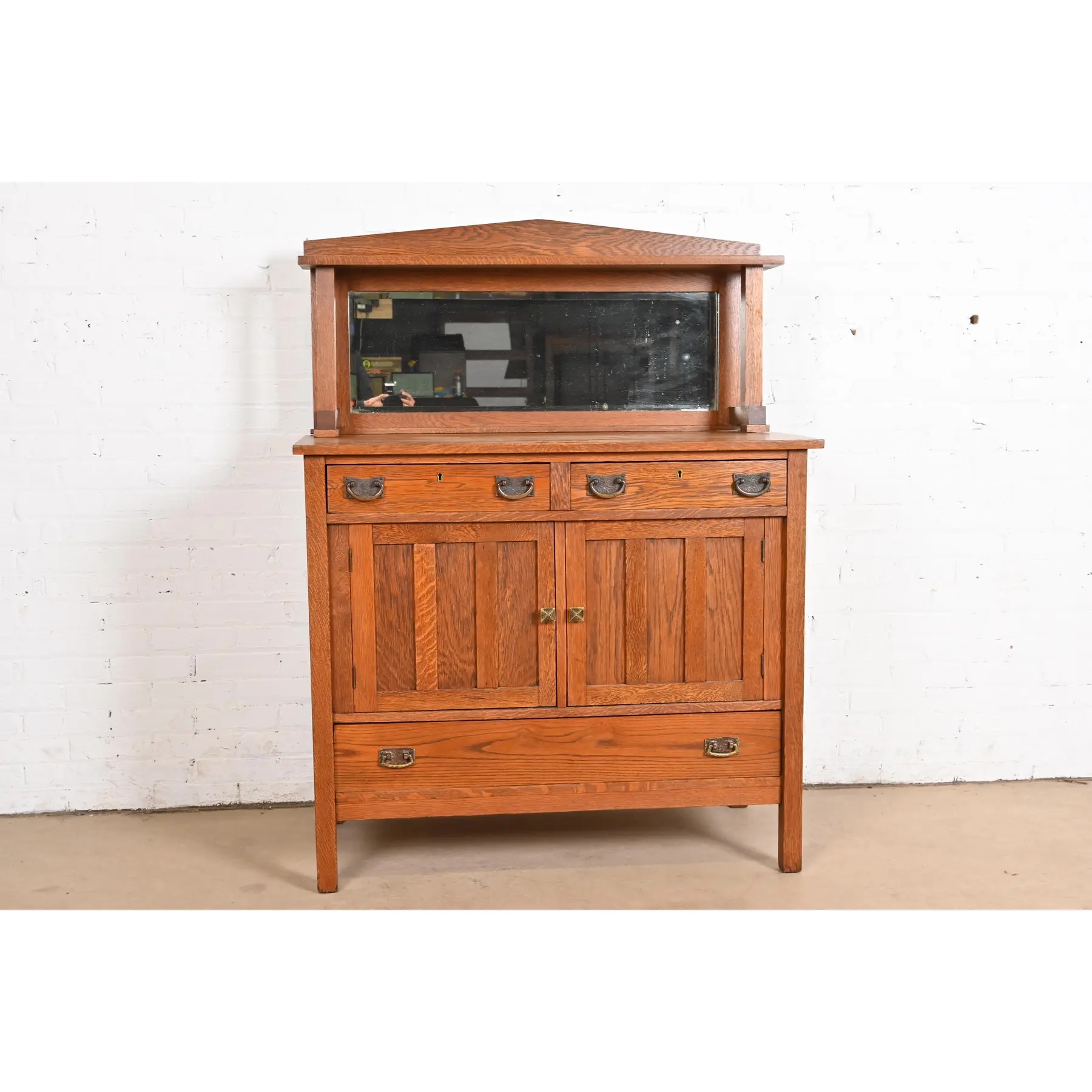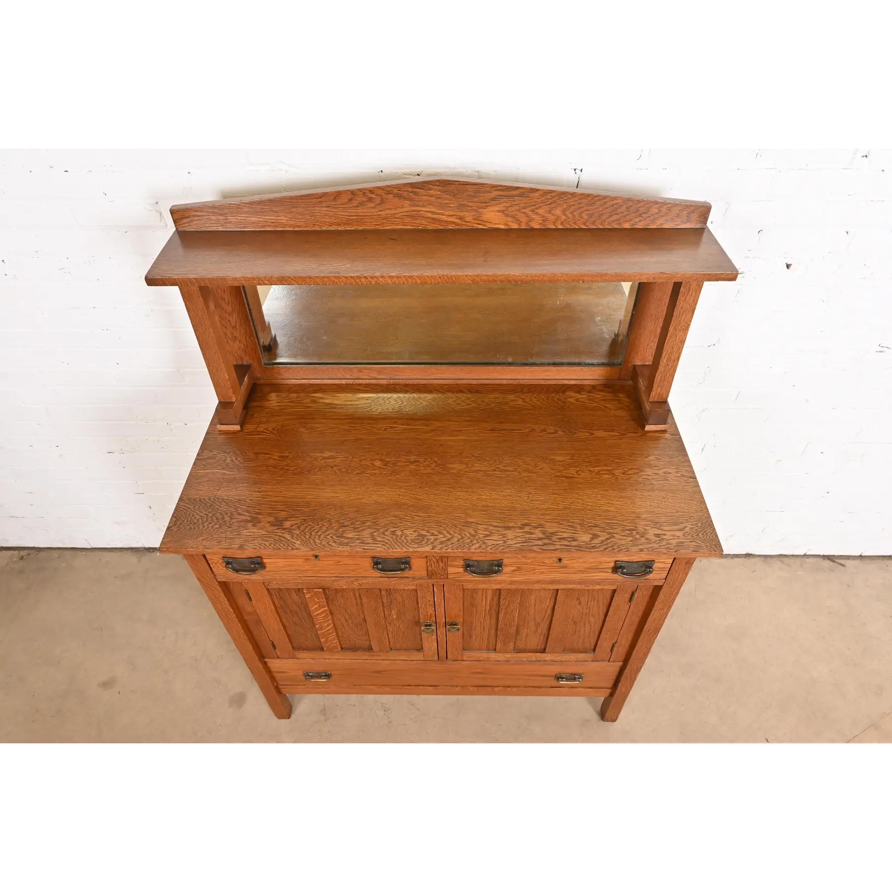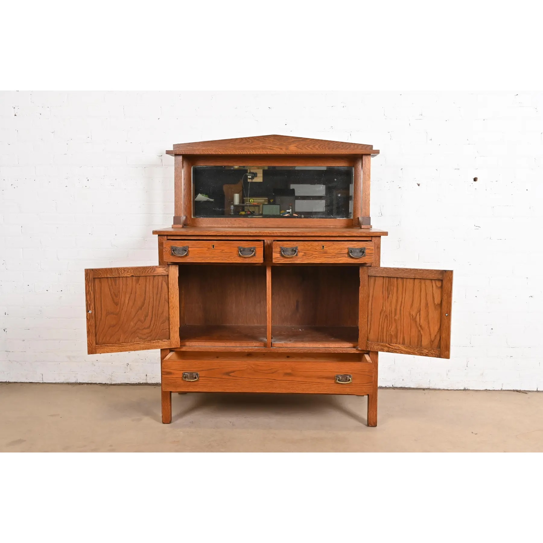 Gorgeous quarter sawn oak, with mirrored backsplash, and hammered copper hardware.