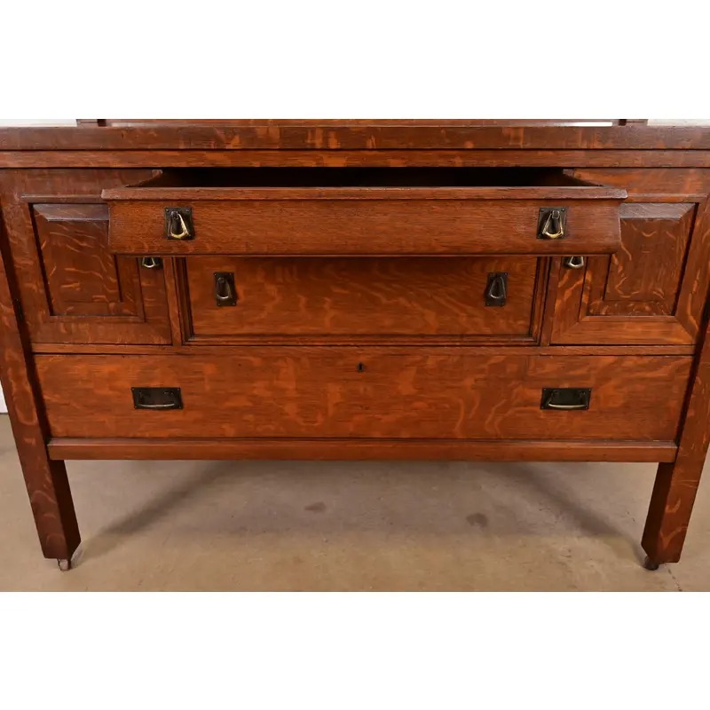 Quarter sawn oak, with mirrored backsplash, and original copper hardware.