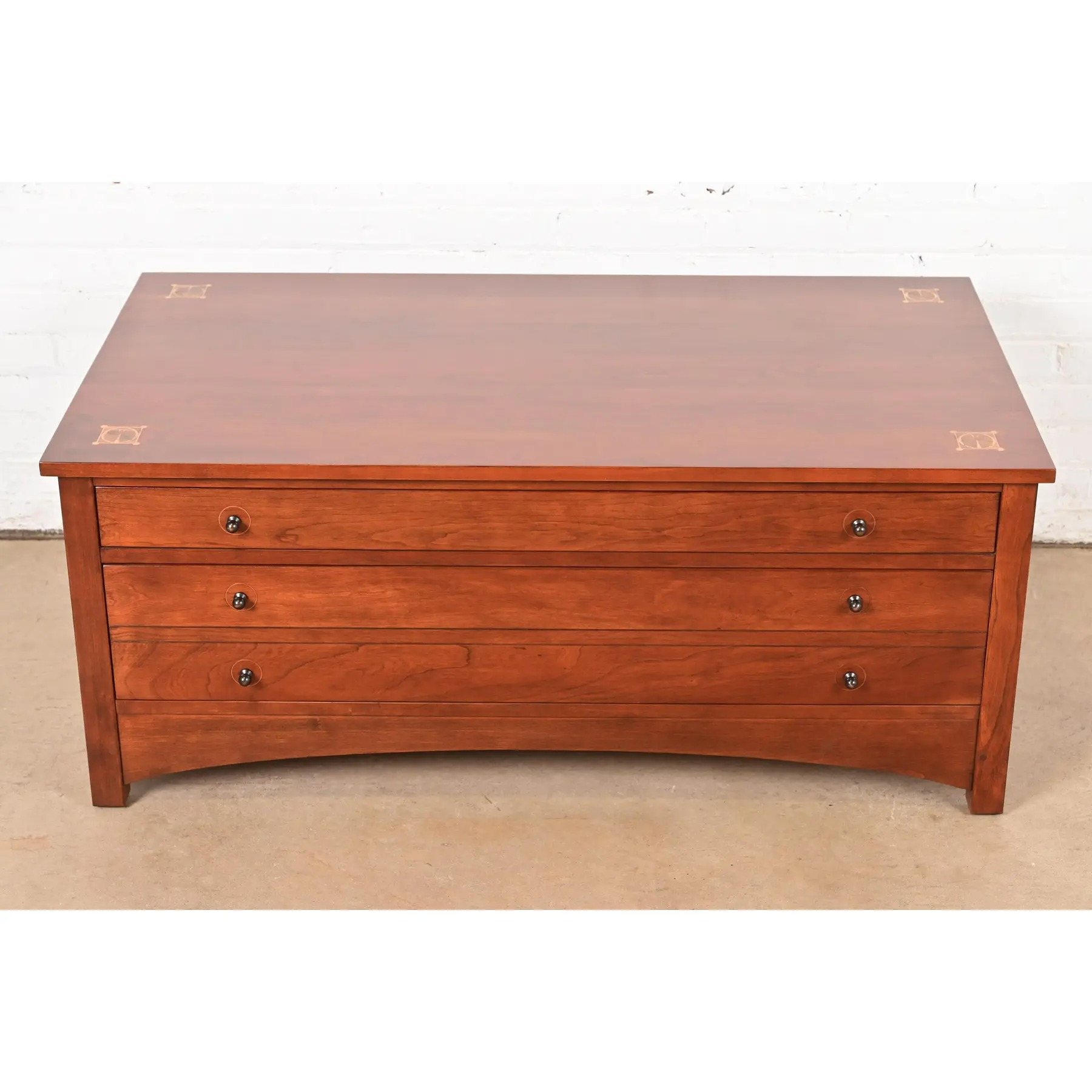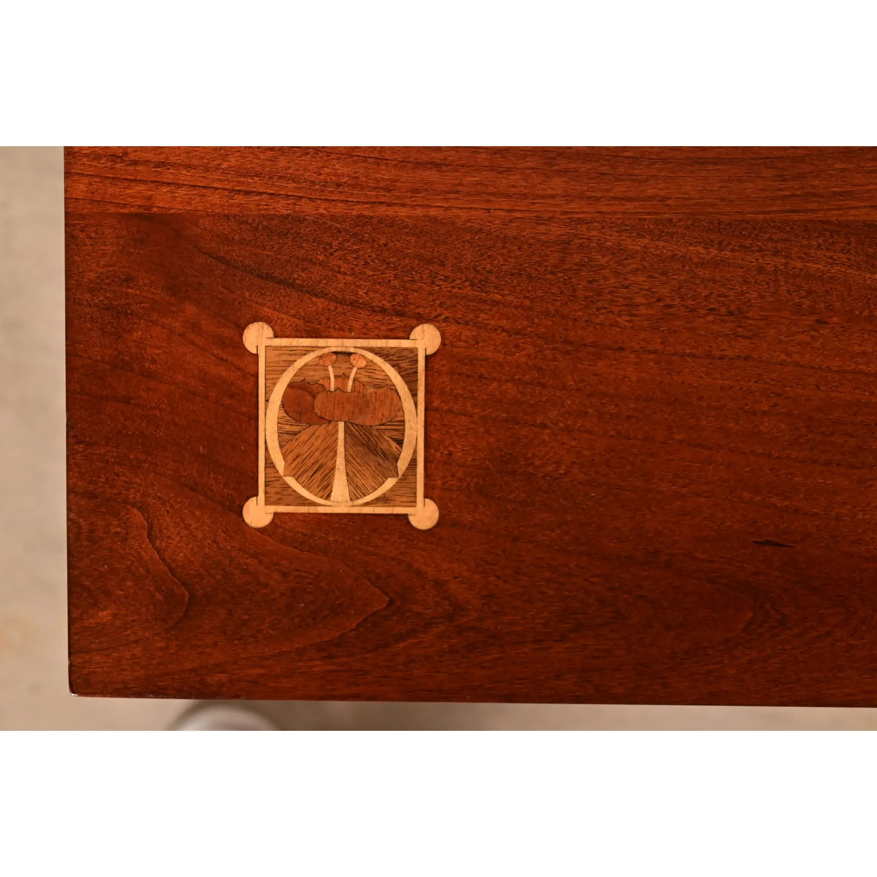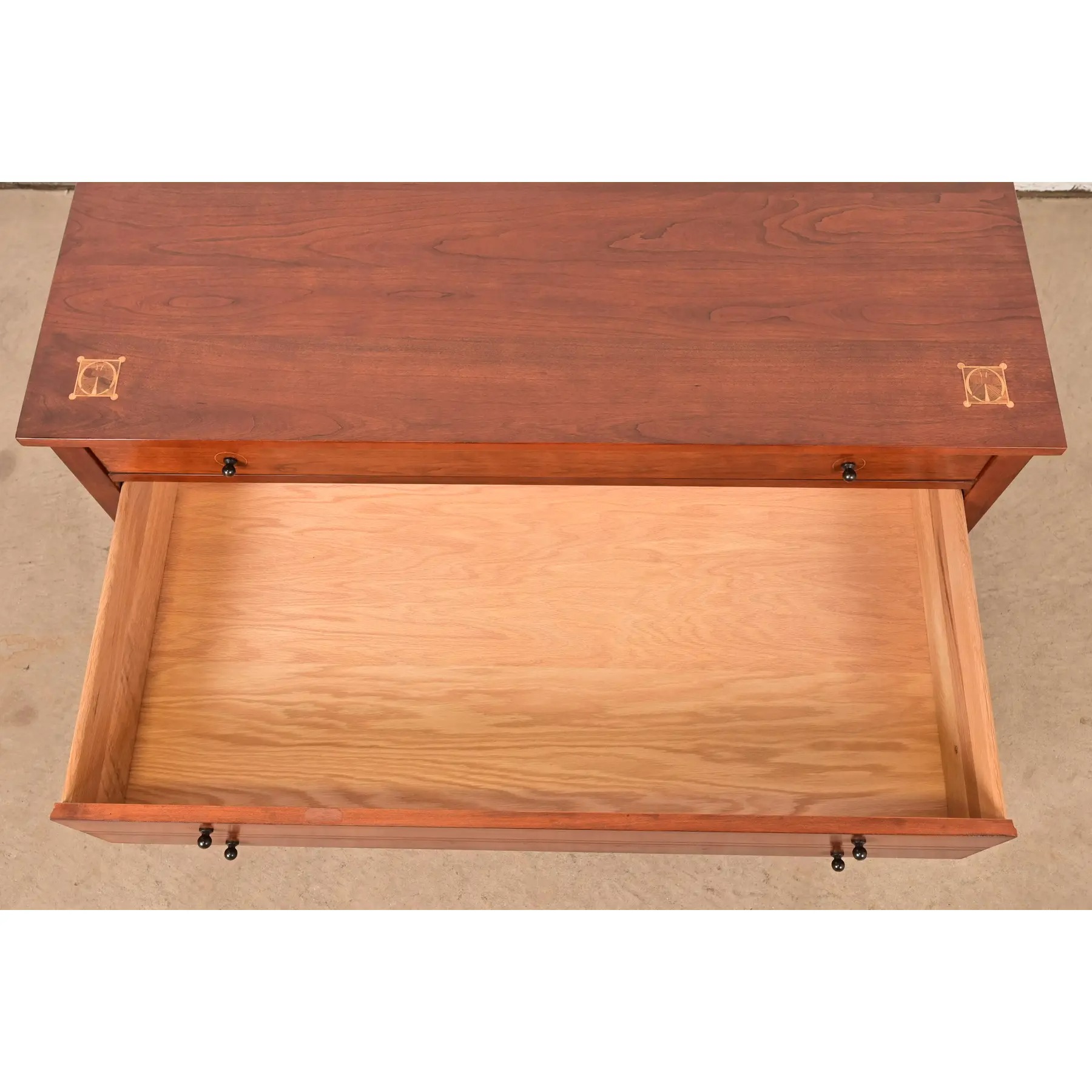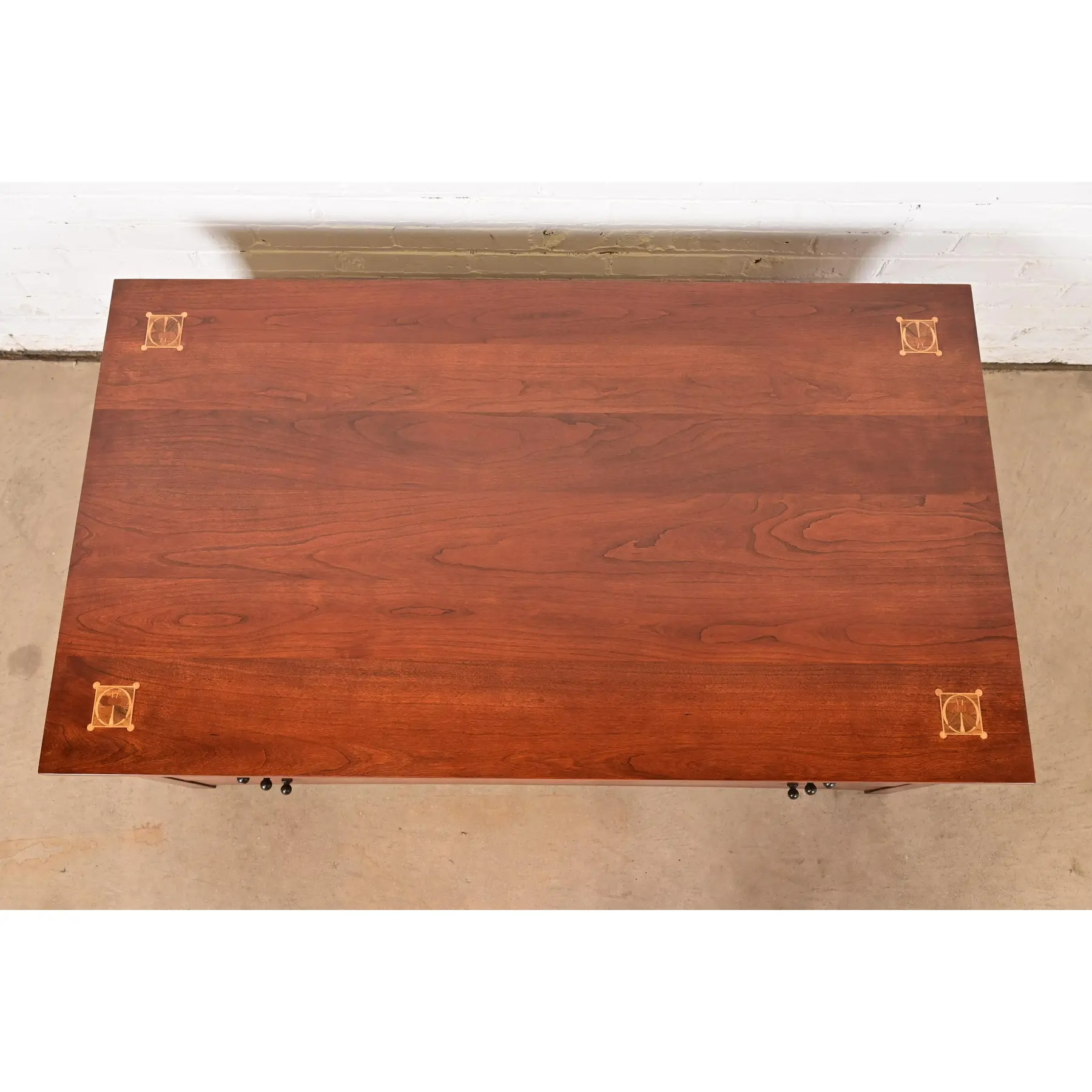 Solid cherry wood, with inlaid marquetry on four top corners, and original hardware.