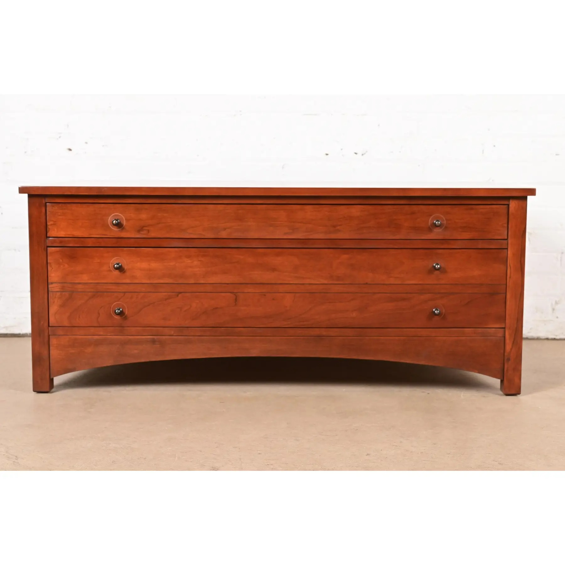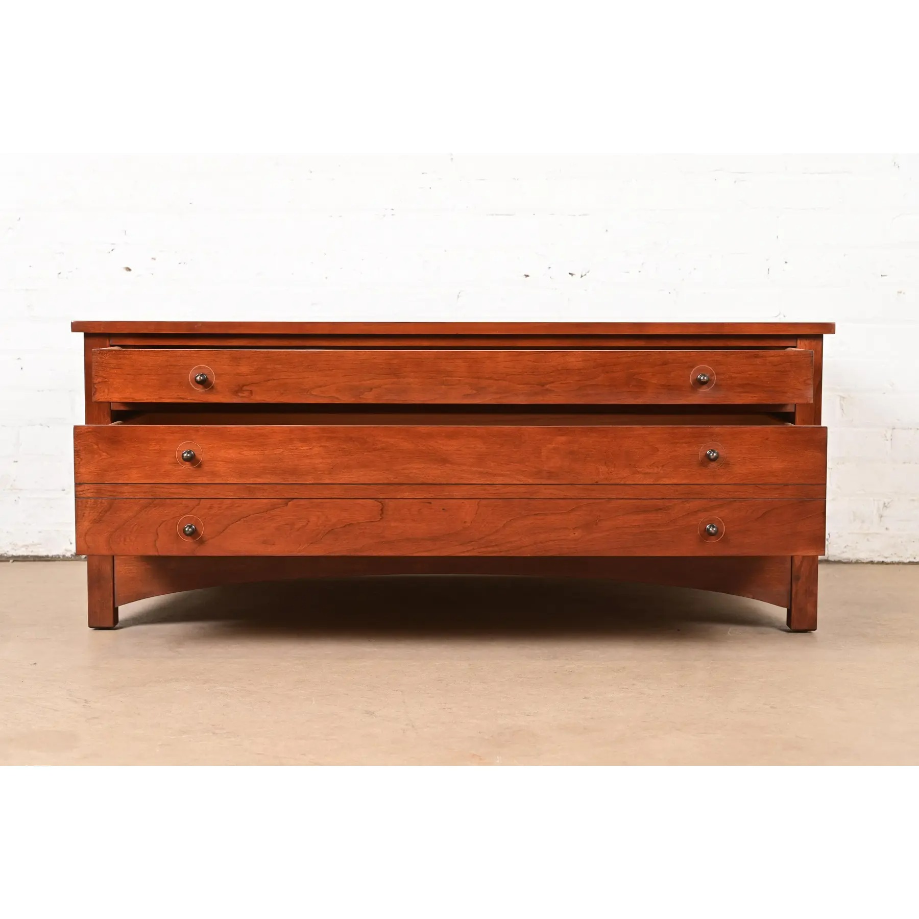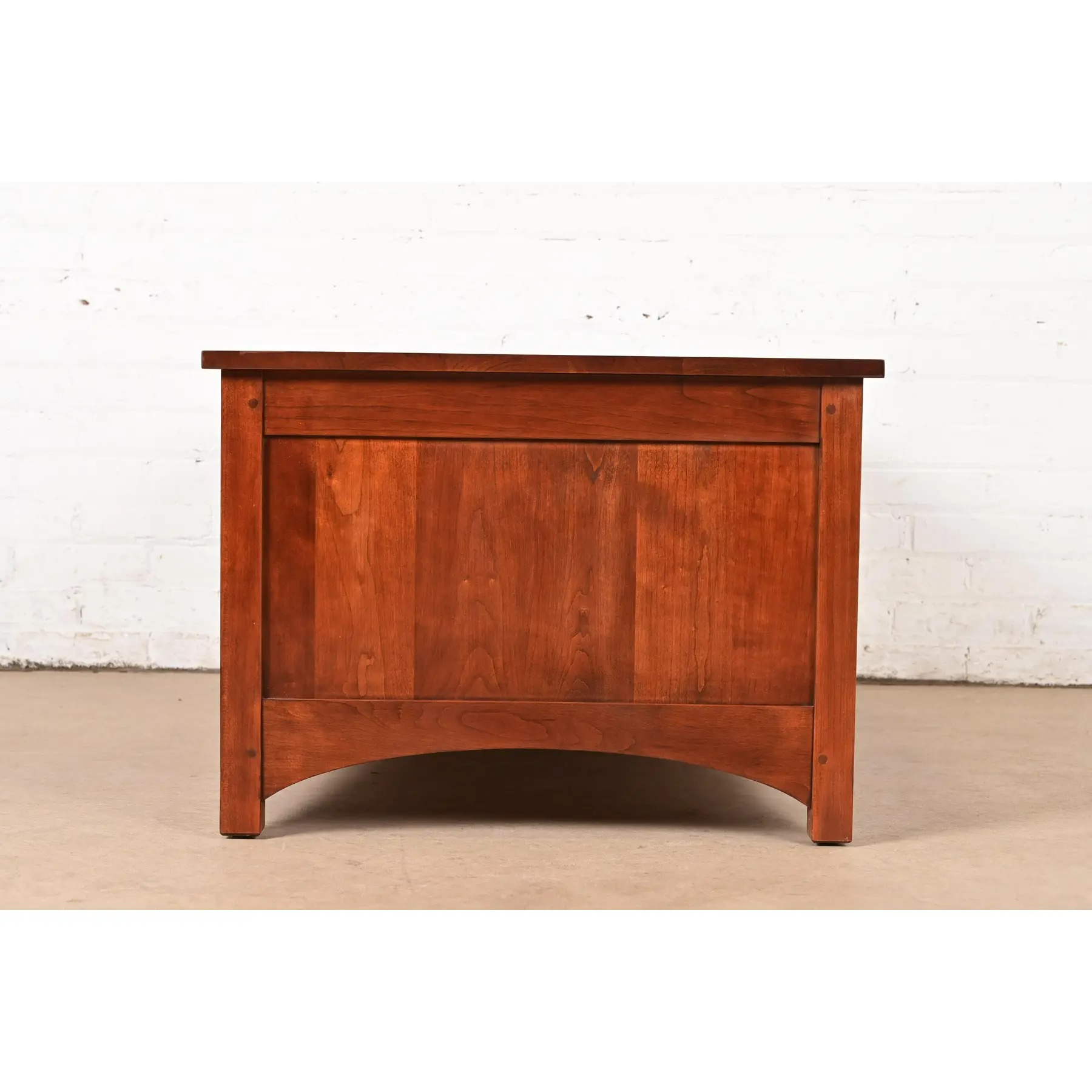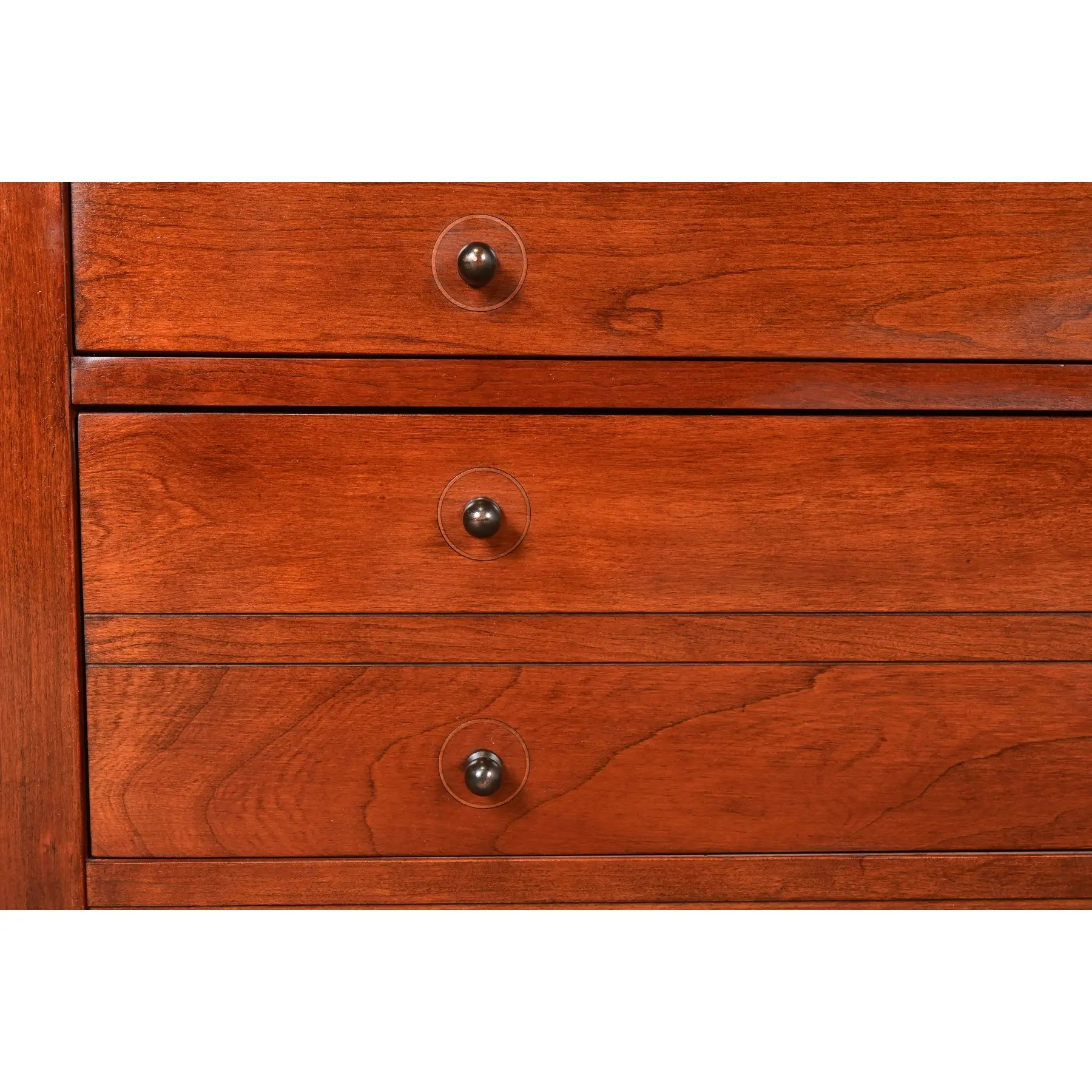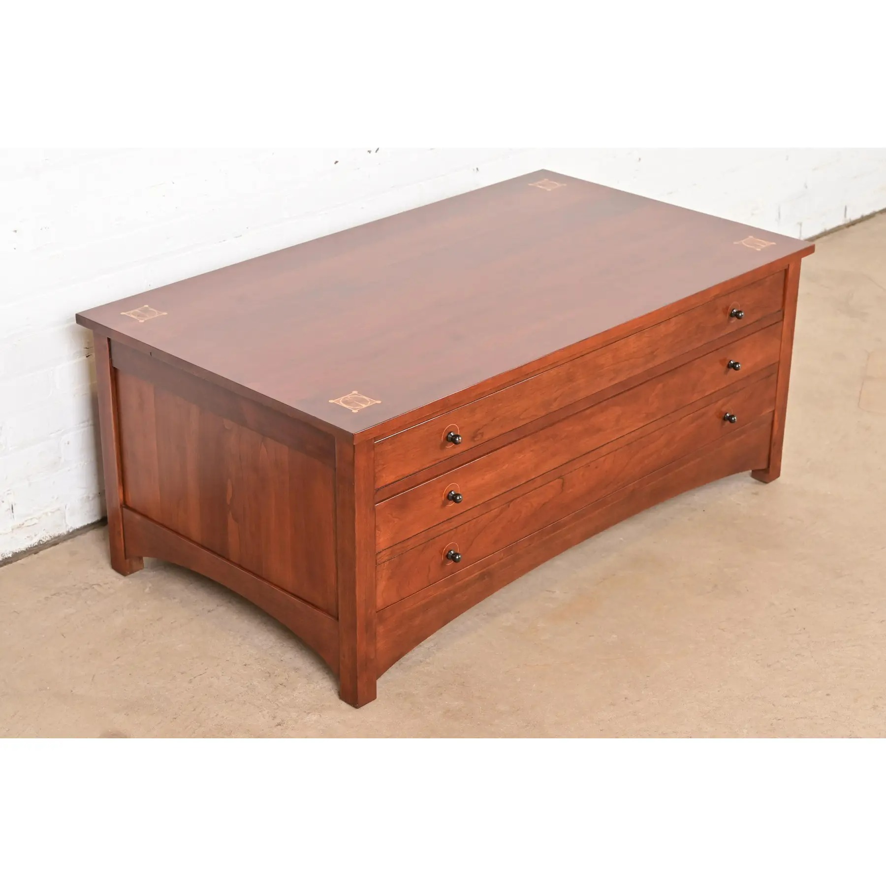 Solid cherry wood, with inlaid marquetry on four top corners, and original hardware.