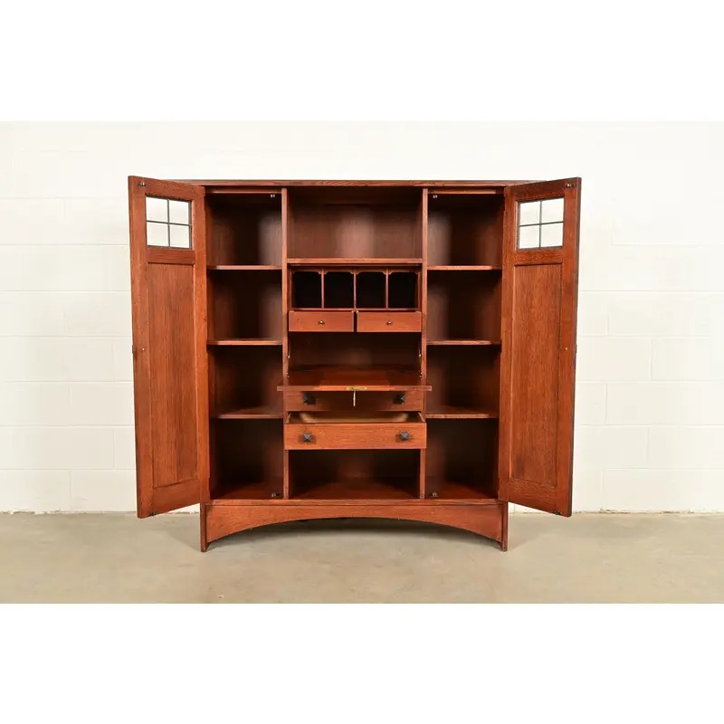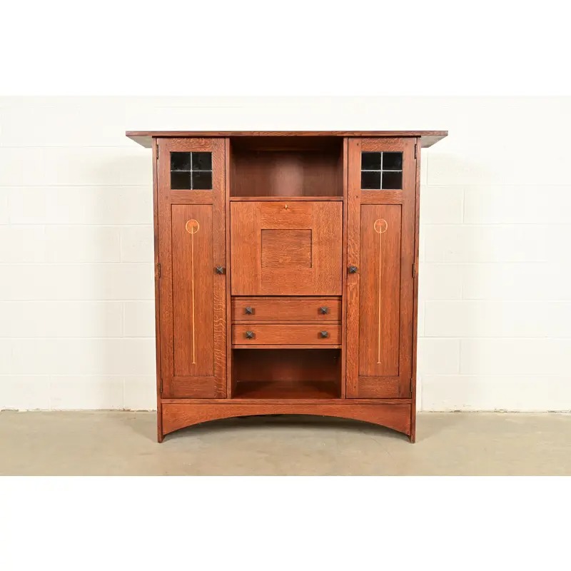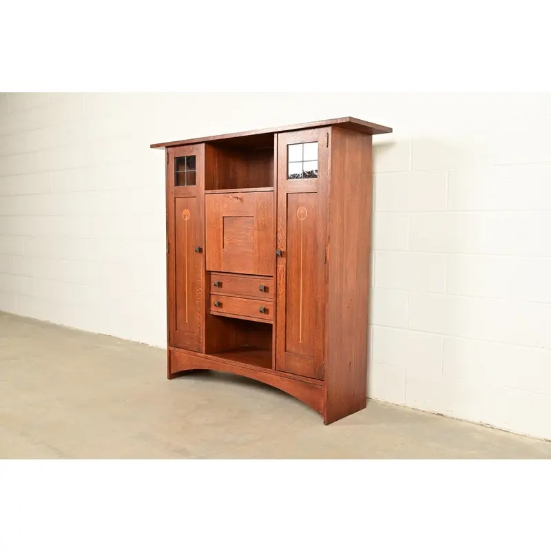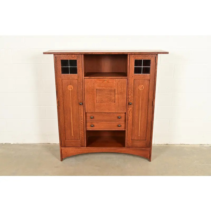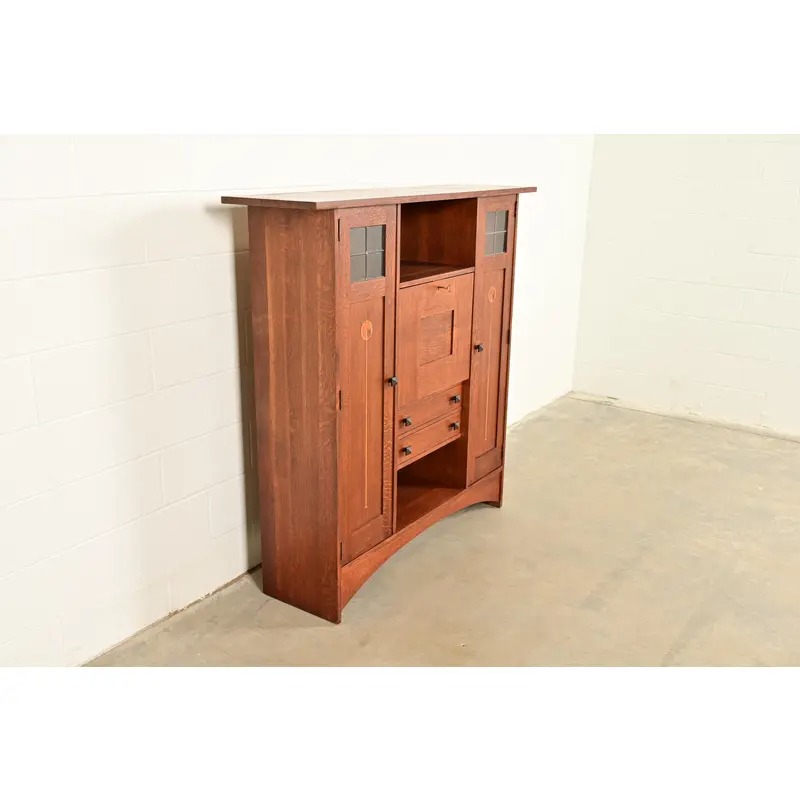 Stickley Harvey Ellis Collection Arts & Crafts Inlaid Oak and Leaded Glass Bookcase With Drop Front Secretary Desk