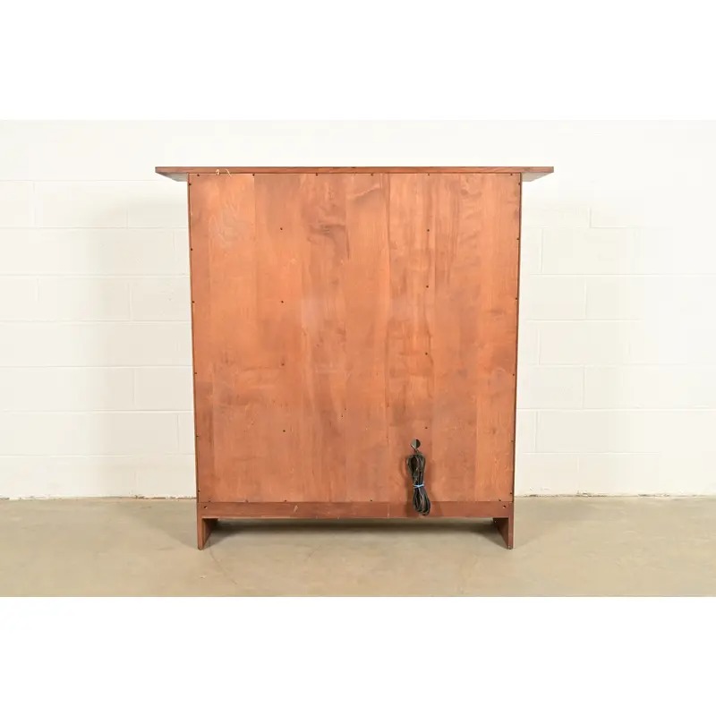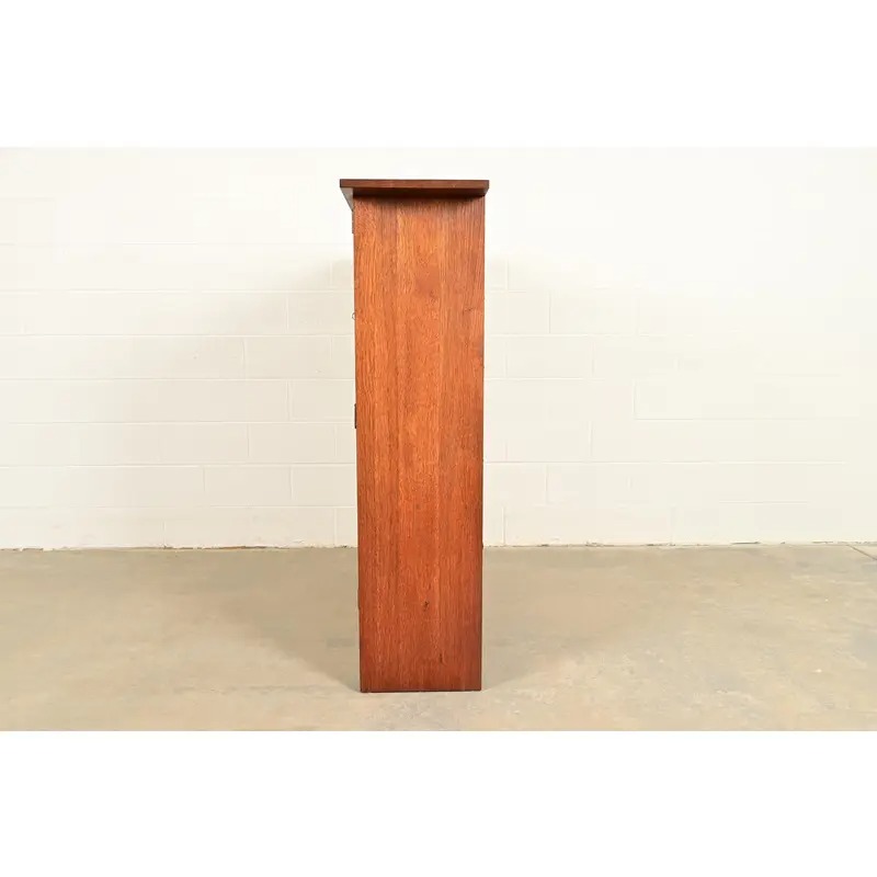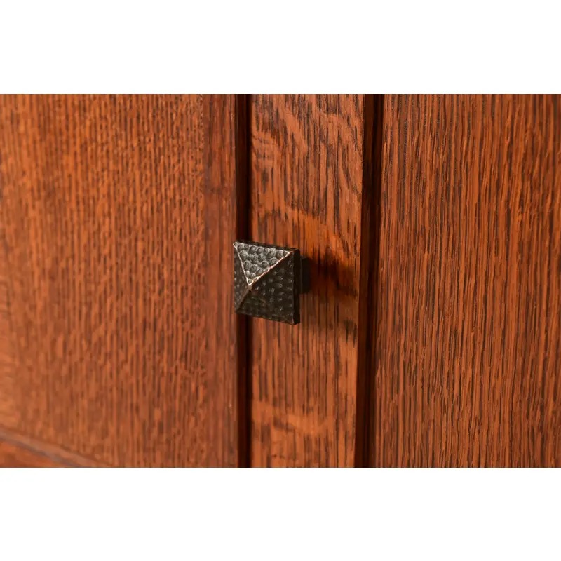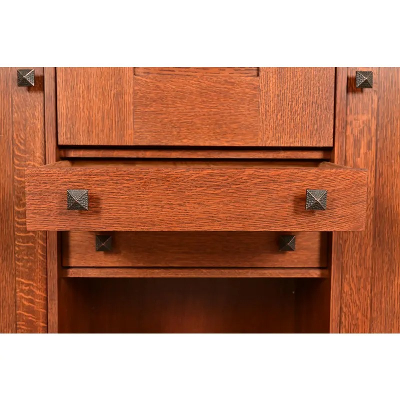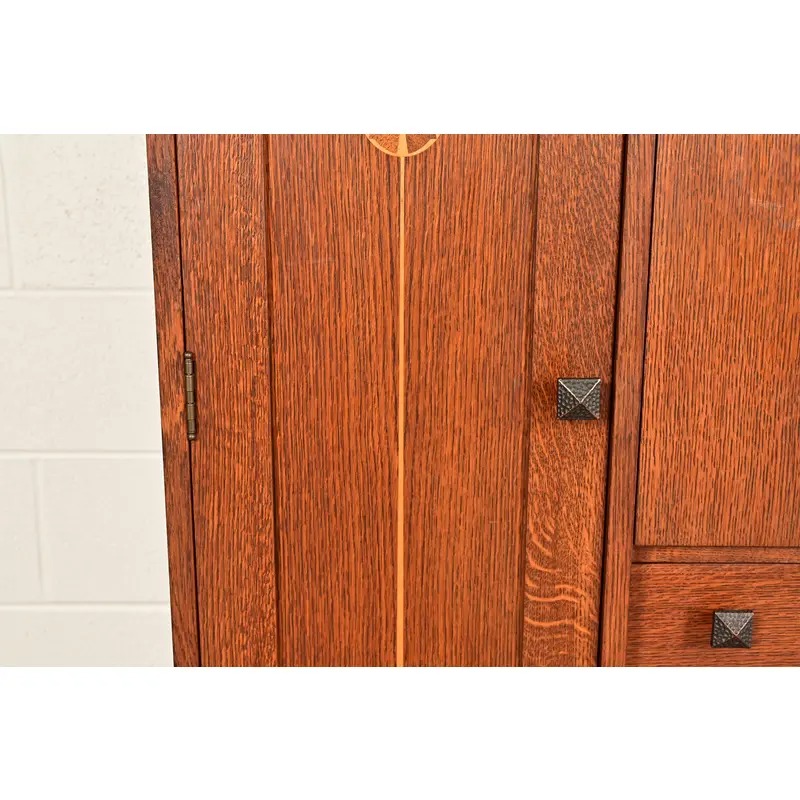 Solid oak, with inlaid marquetry, hammered copper hardware, and leaded glass. Interior shelves are removable and adjustable.