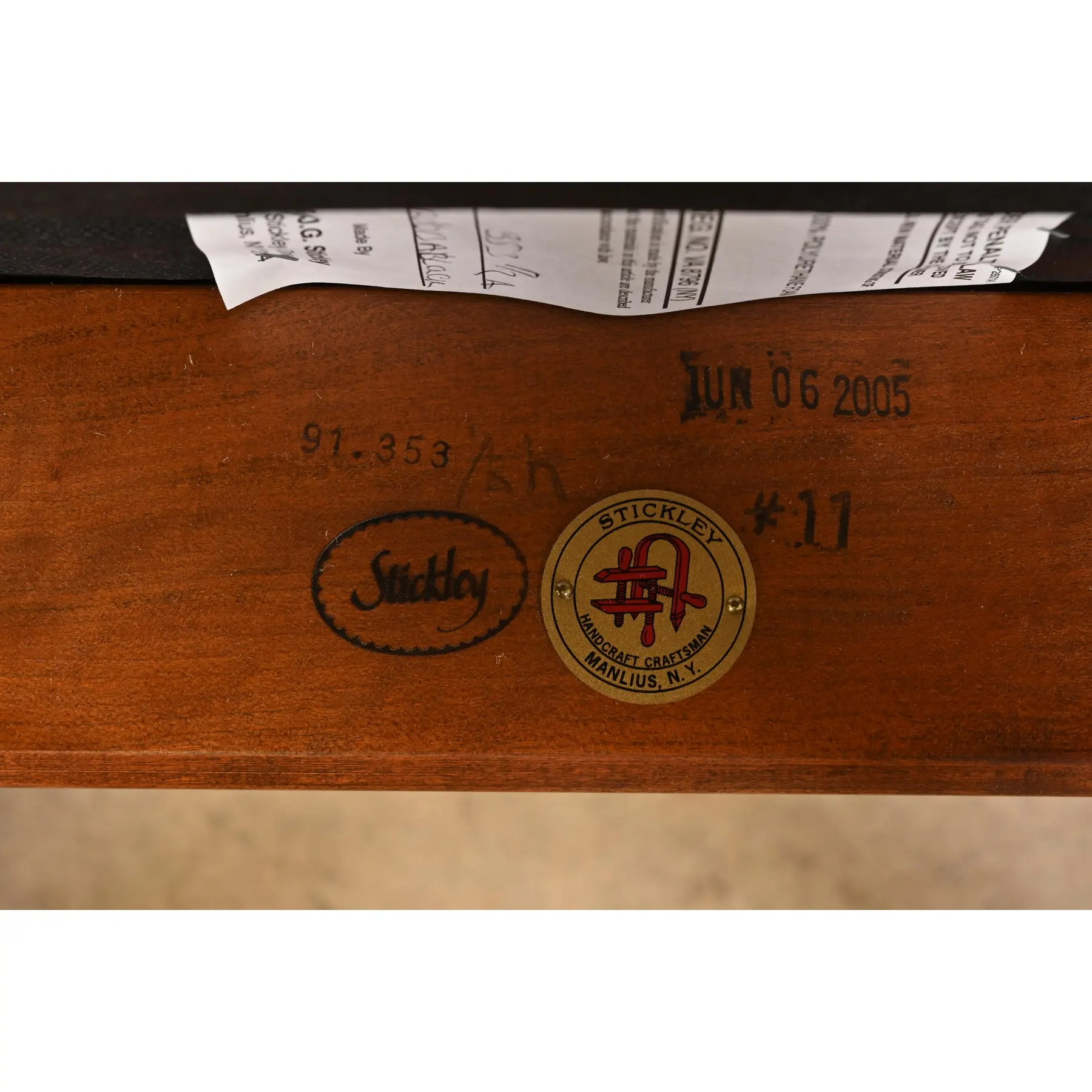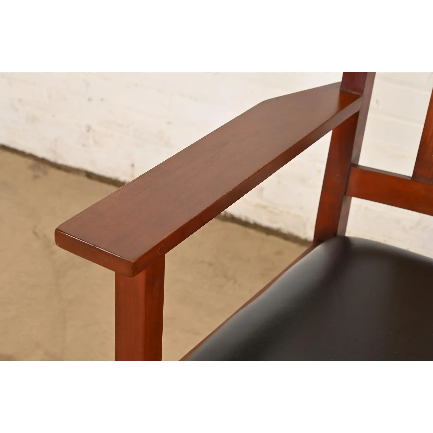 Solid cherry wood frame, with inlaid marquetry, and original black leather upholstered seat.