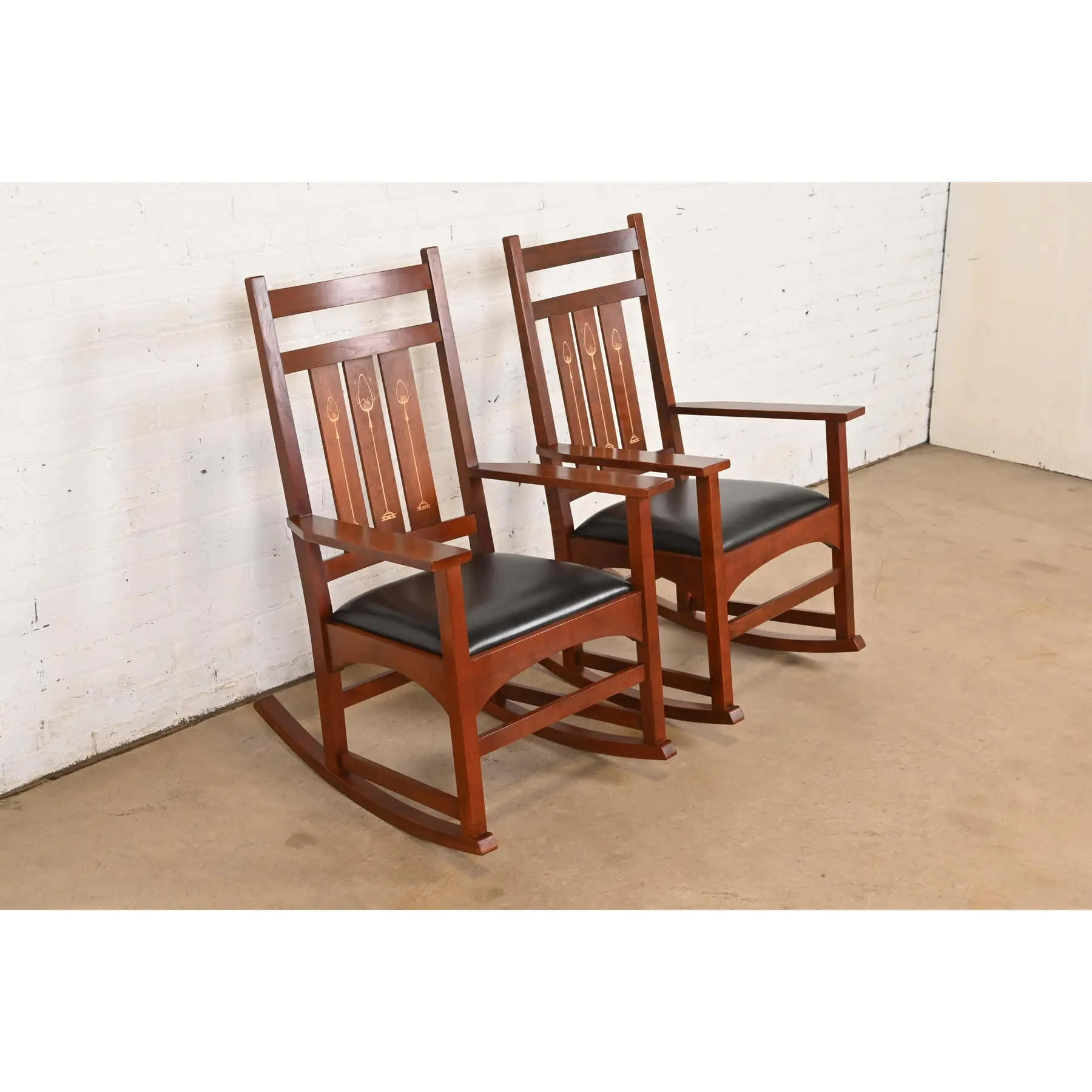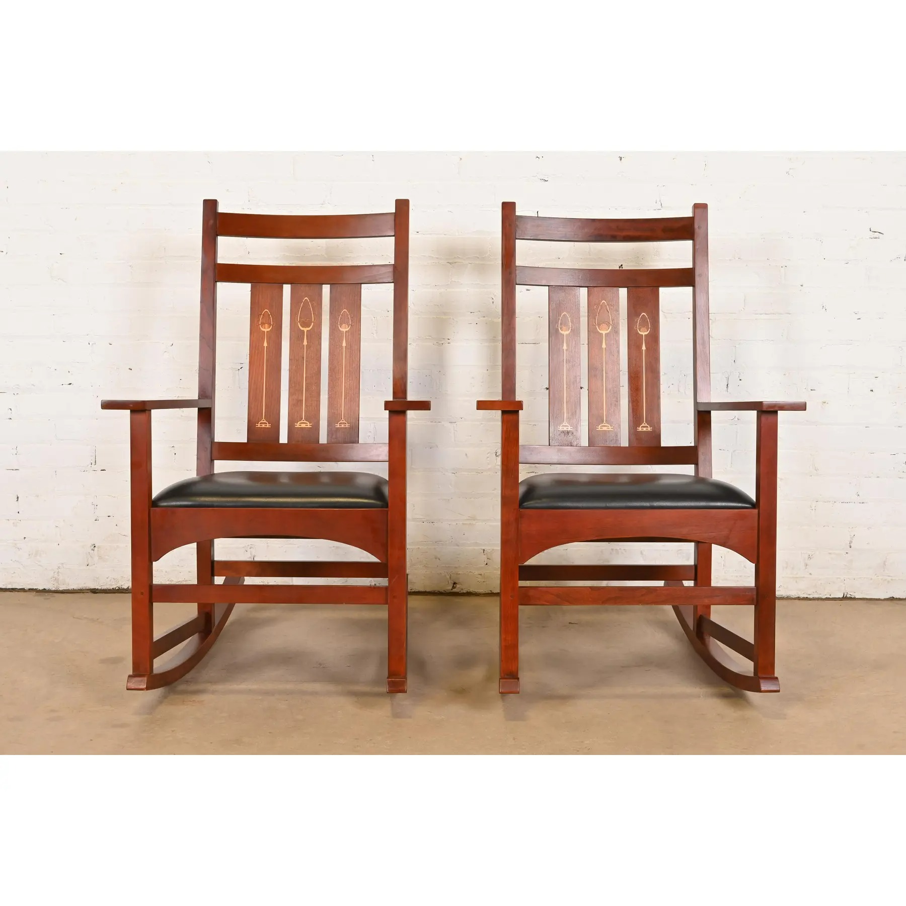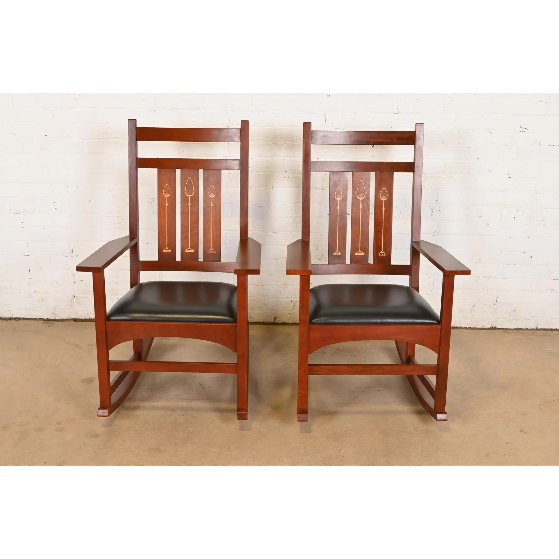 Stickley Harvey Ellis Collection Mission Arts & Crafts Inlaid Cherry Wood and Leather Rocking Chairs, Pair