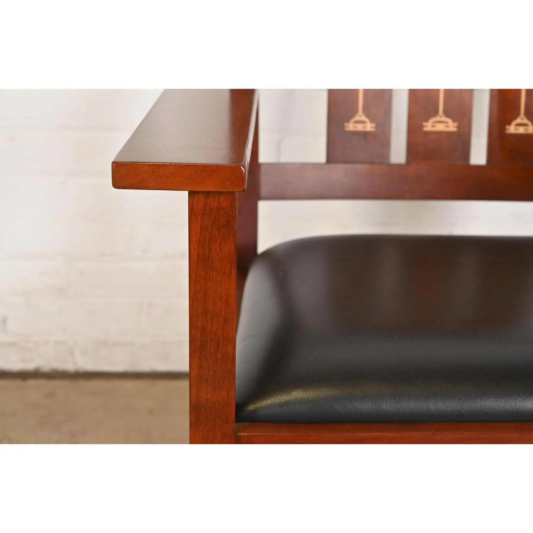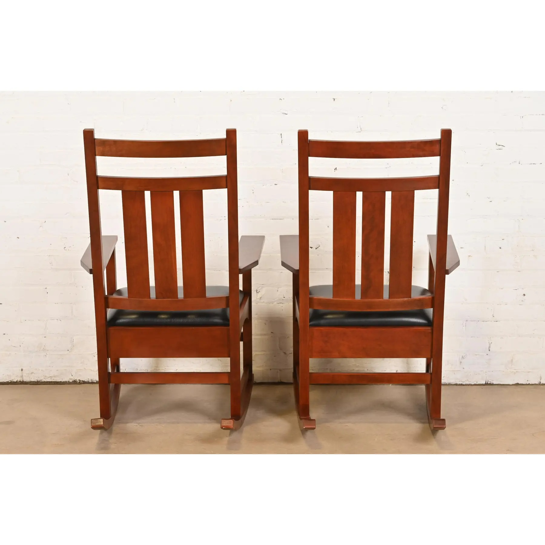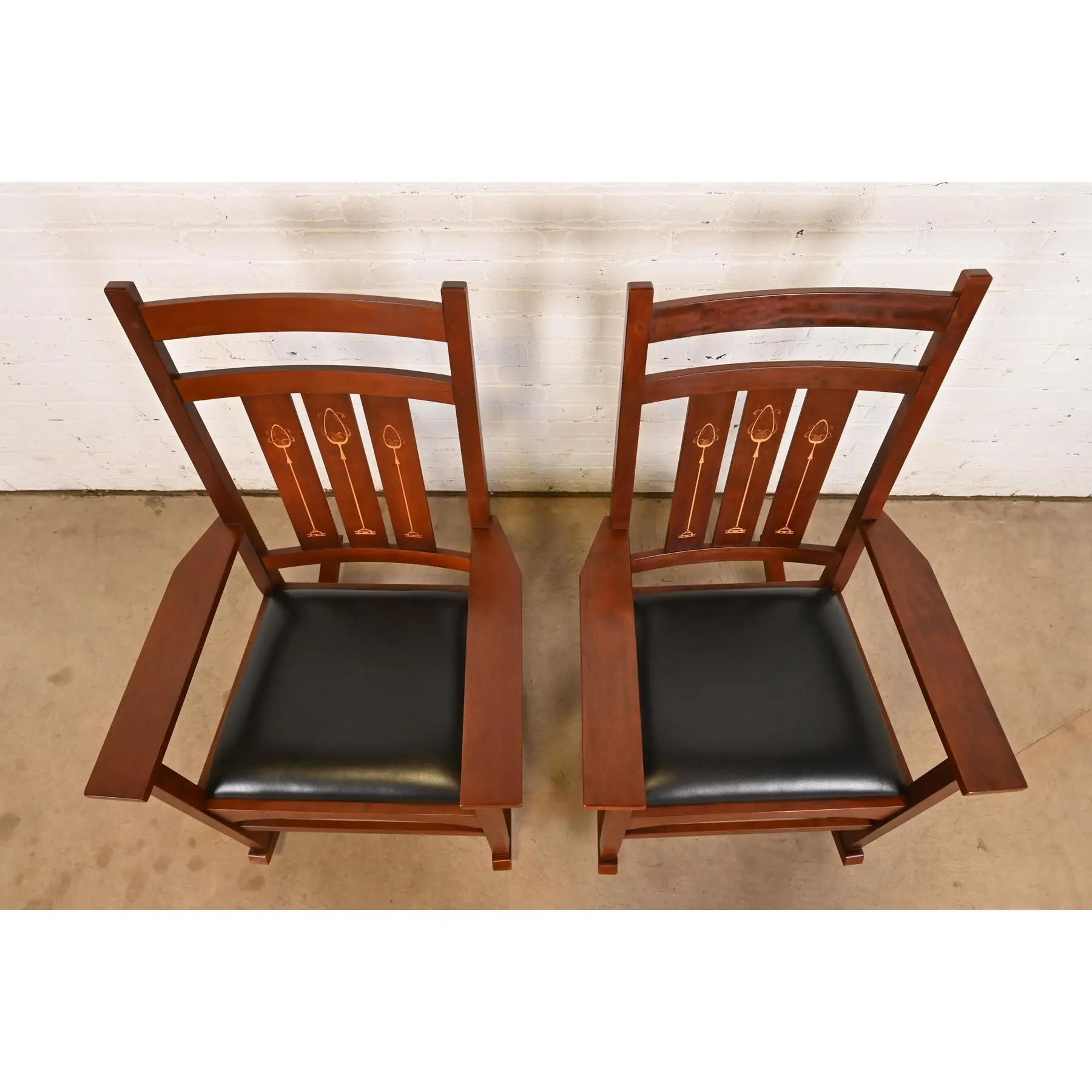 Stickley Harvey Ellis Collection Mission Arts & Crafts Inlaid Cherry Wood and Leather Rocking Chairs, Pair