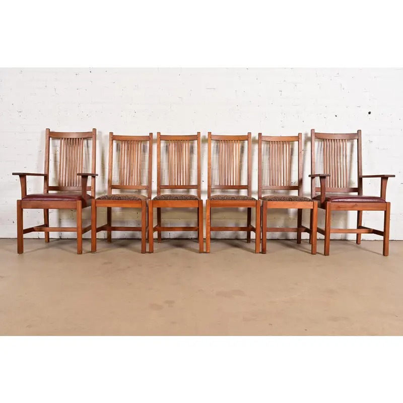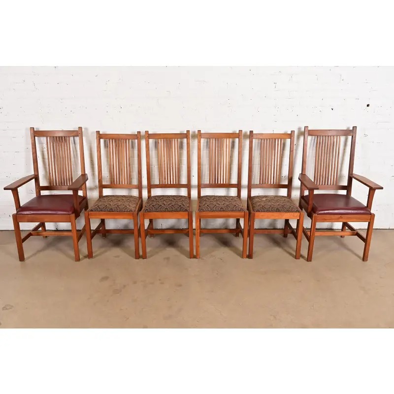 An exceptional set of six Mission or Arts & Crafts style spindle back dining chairs