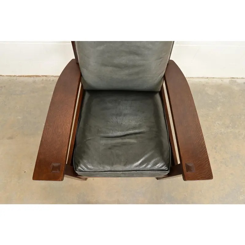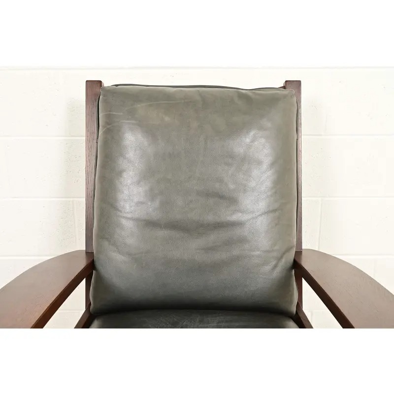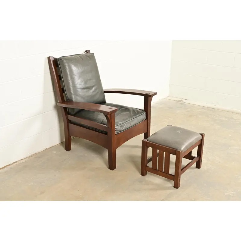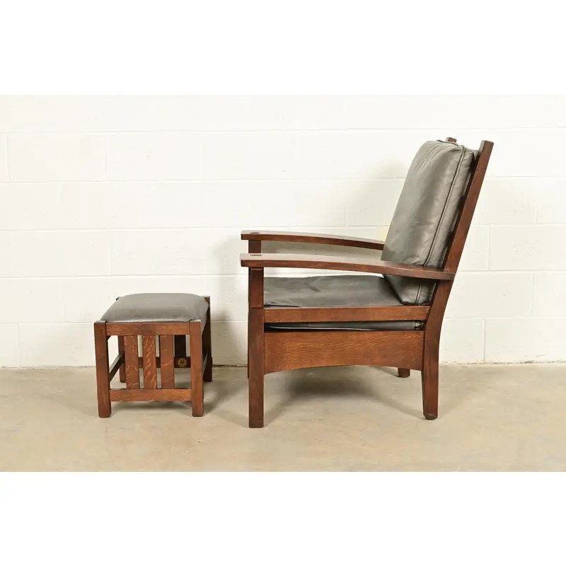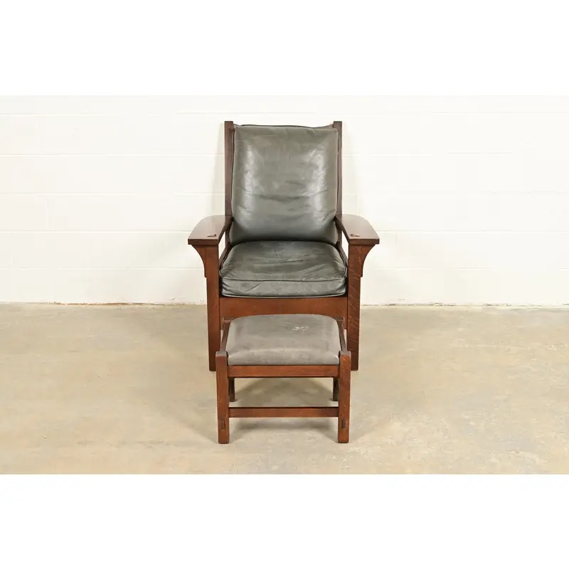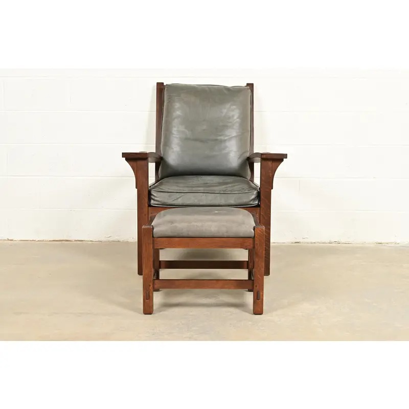 An exceptional Mission or Arts & Crafts bow arm lounge chair with ottoman
