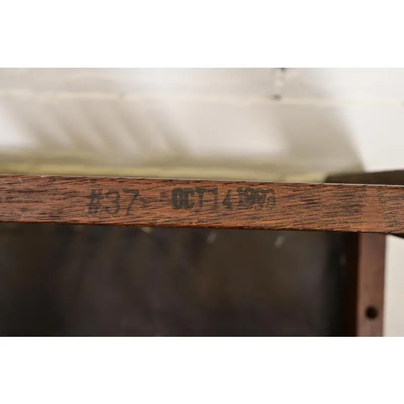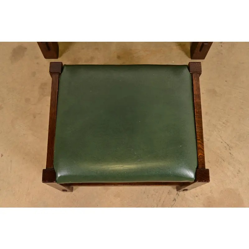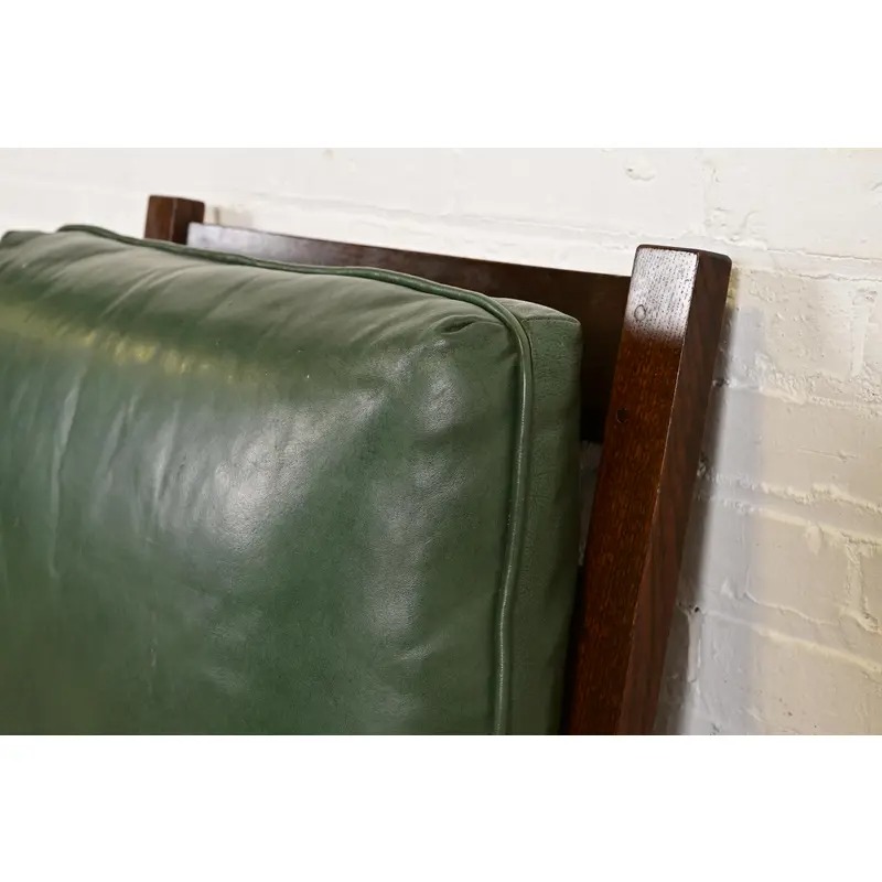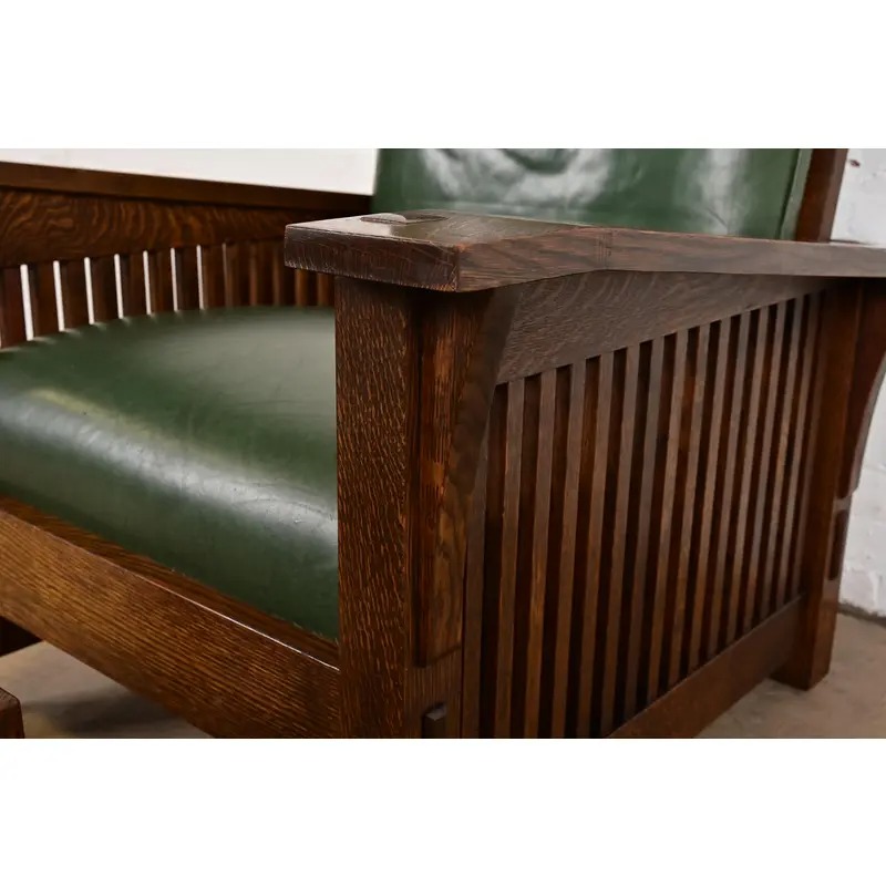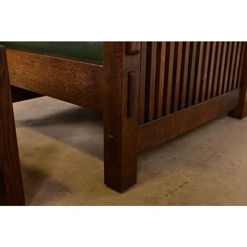Solid quarter sawn oak frame, with green leather upholstered seat and back cushions.