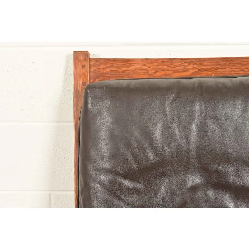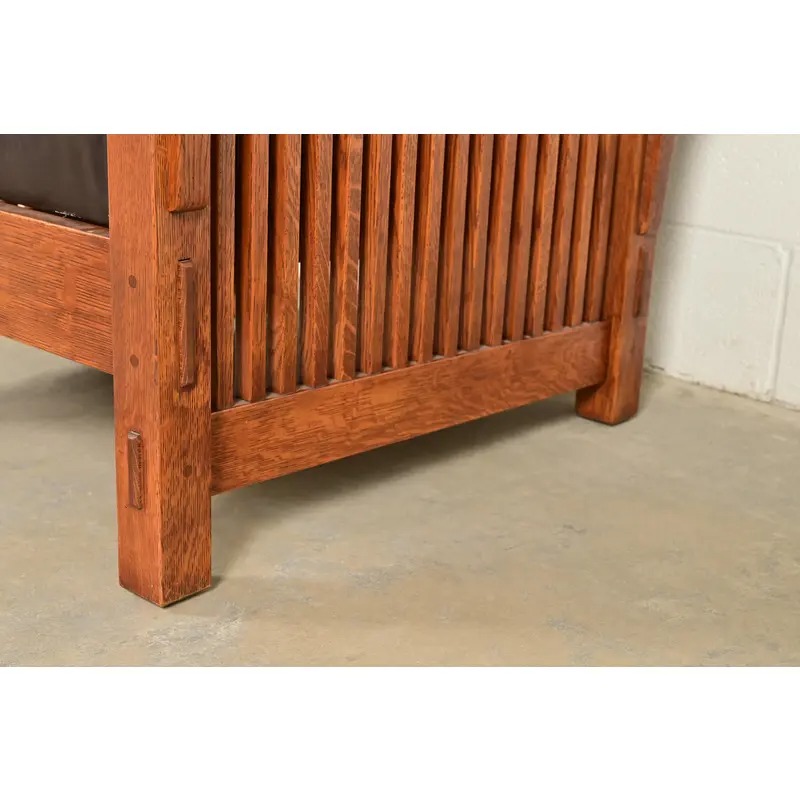 Solid quarter sawn oak frame, with leather upholstered seat and back cushions.