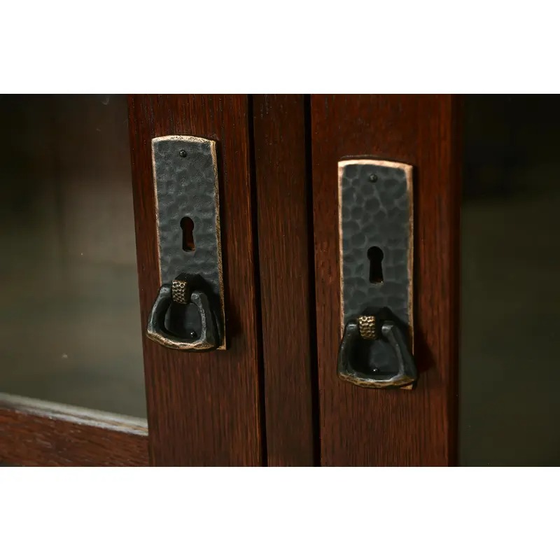 Solid quarter sawn oak, with mullioned glass front doors and hammered copper hardware. Interior shelves are removable and adjustable.
