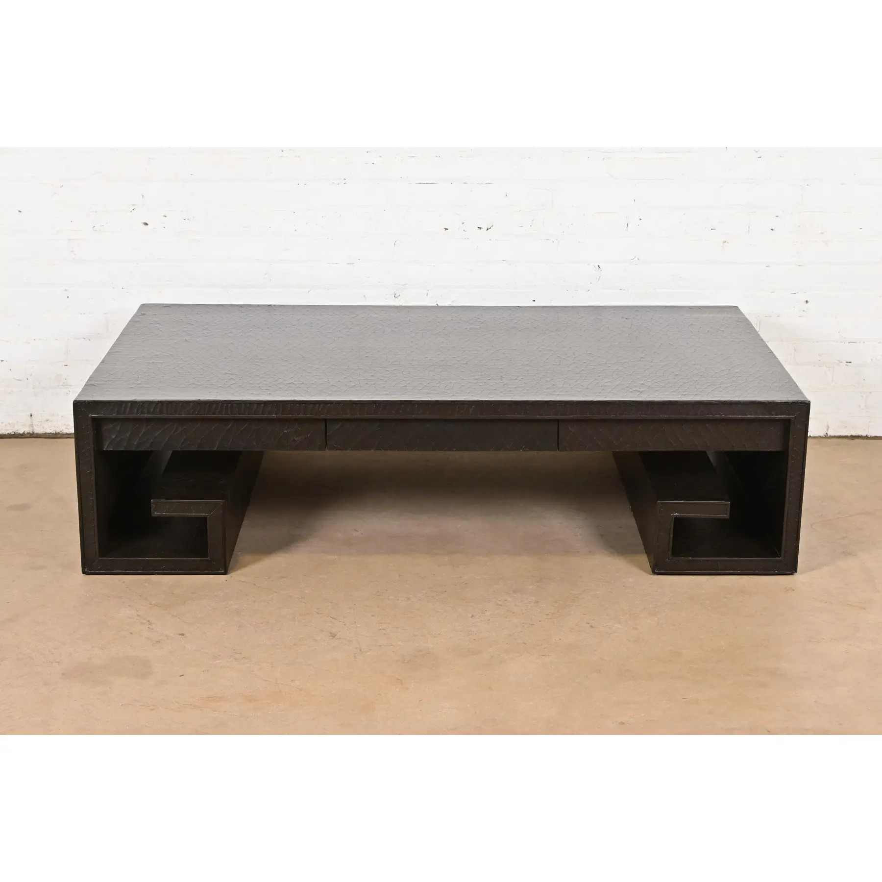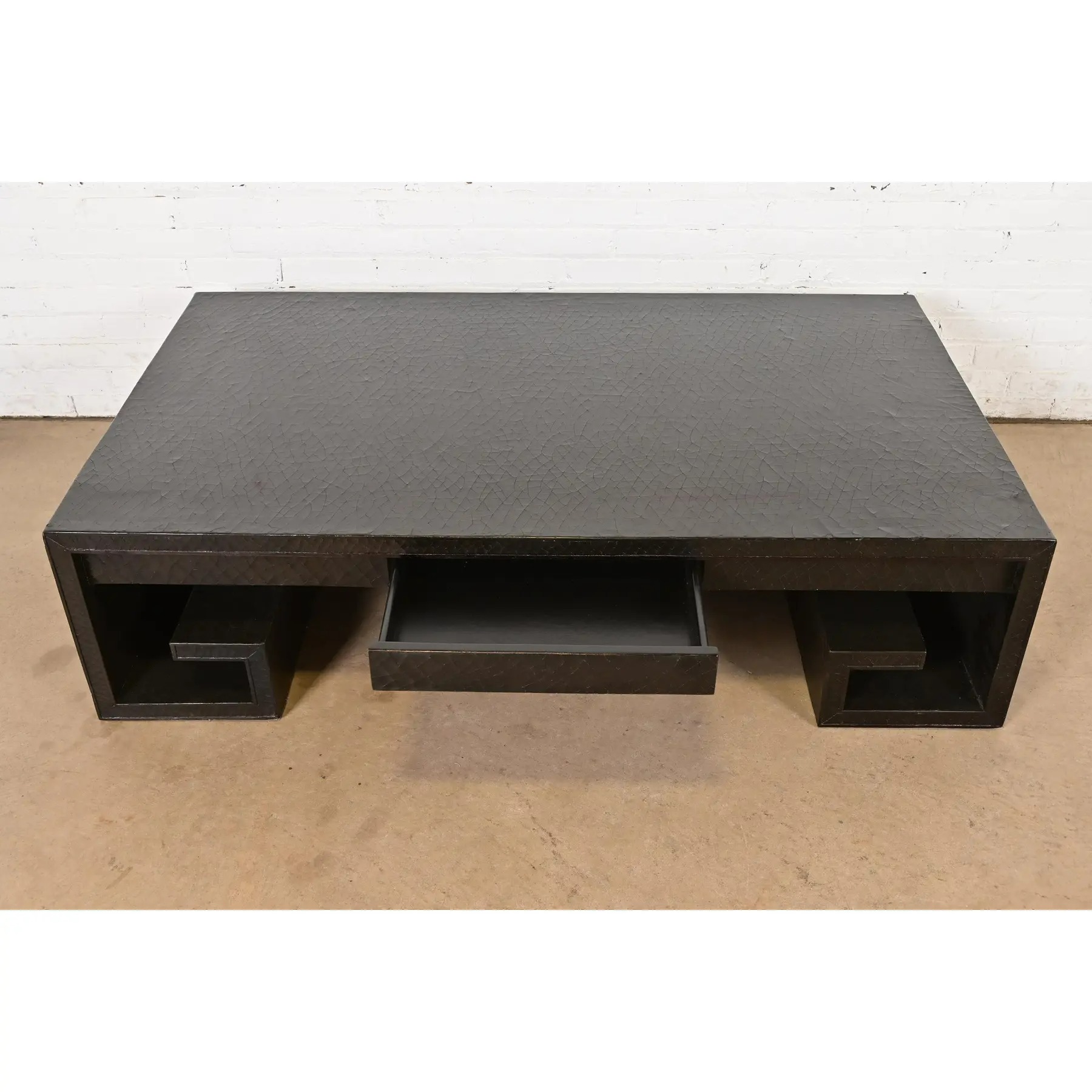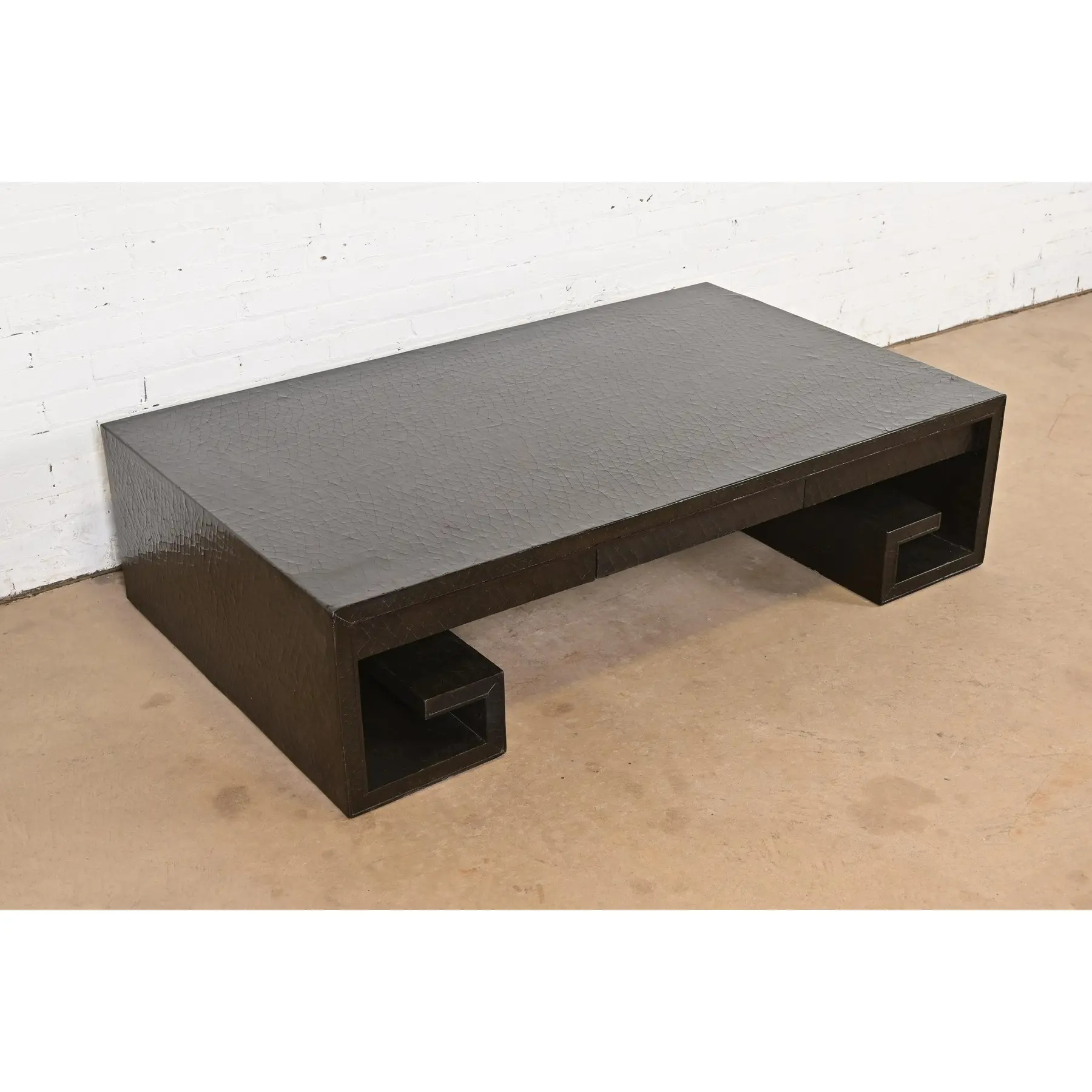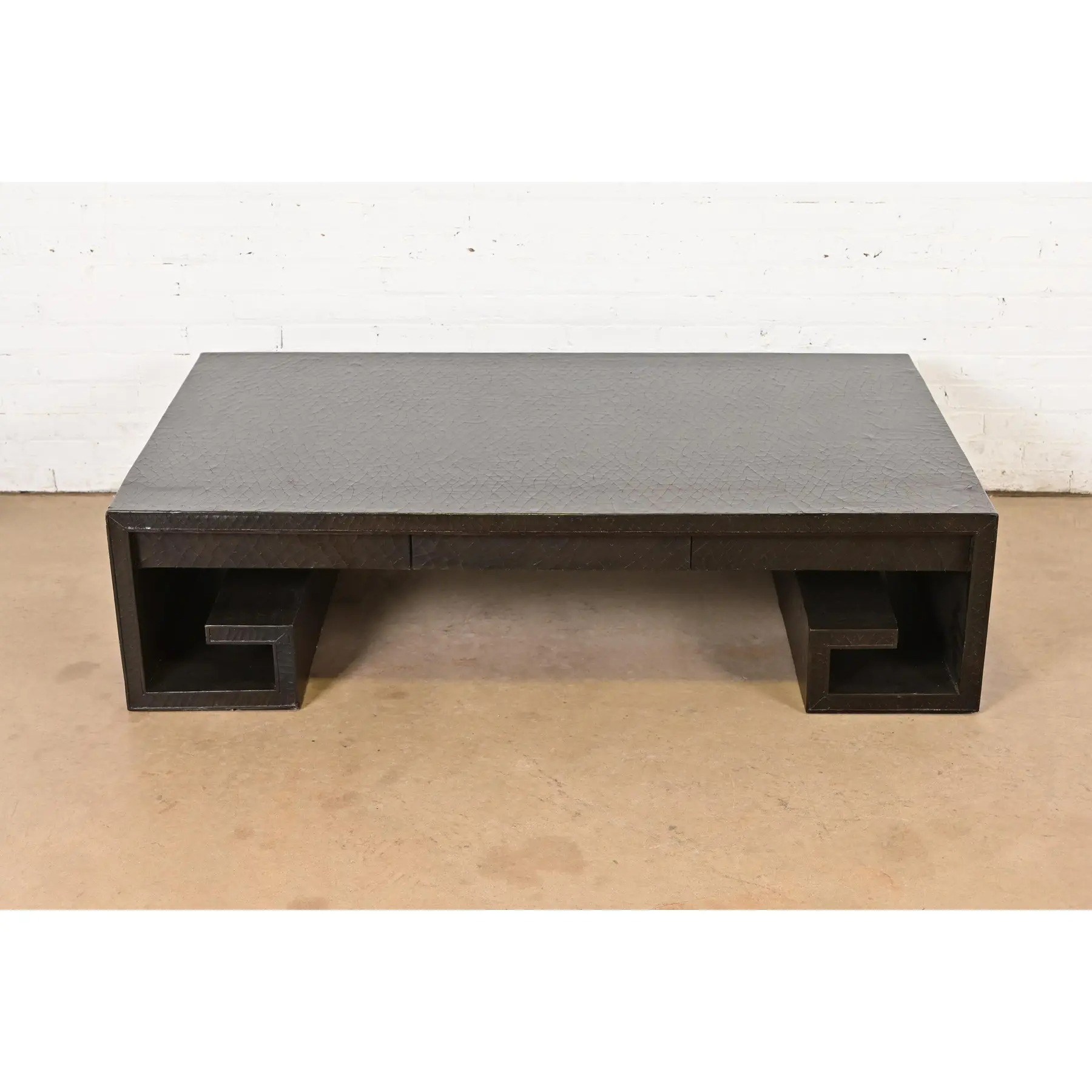A beautiful large scale Greek Key or Asian Scroll black crackle lacquered coffee table or cocktail table