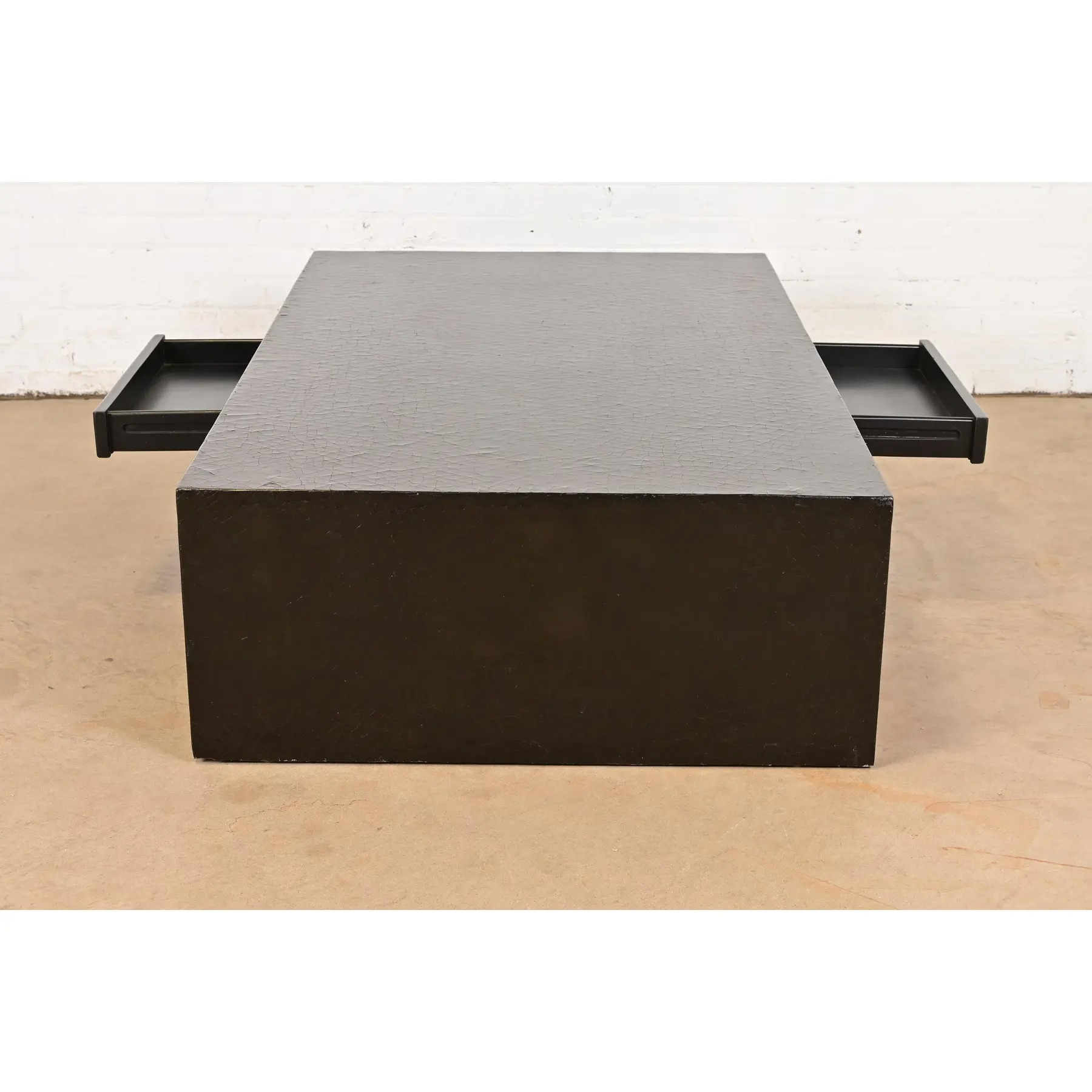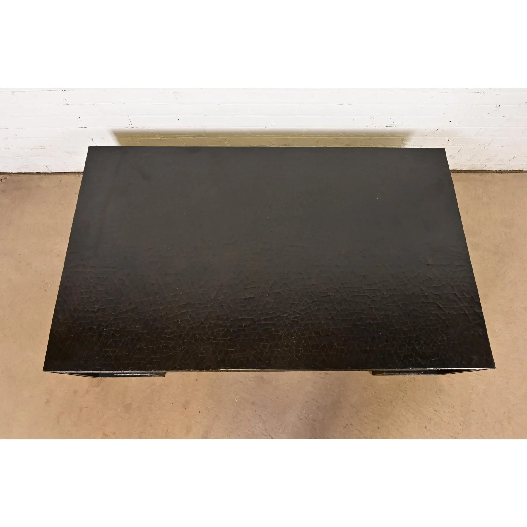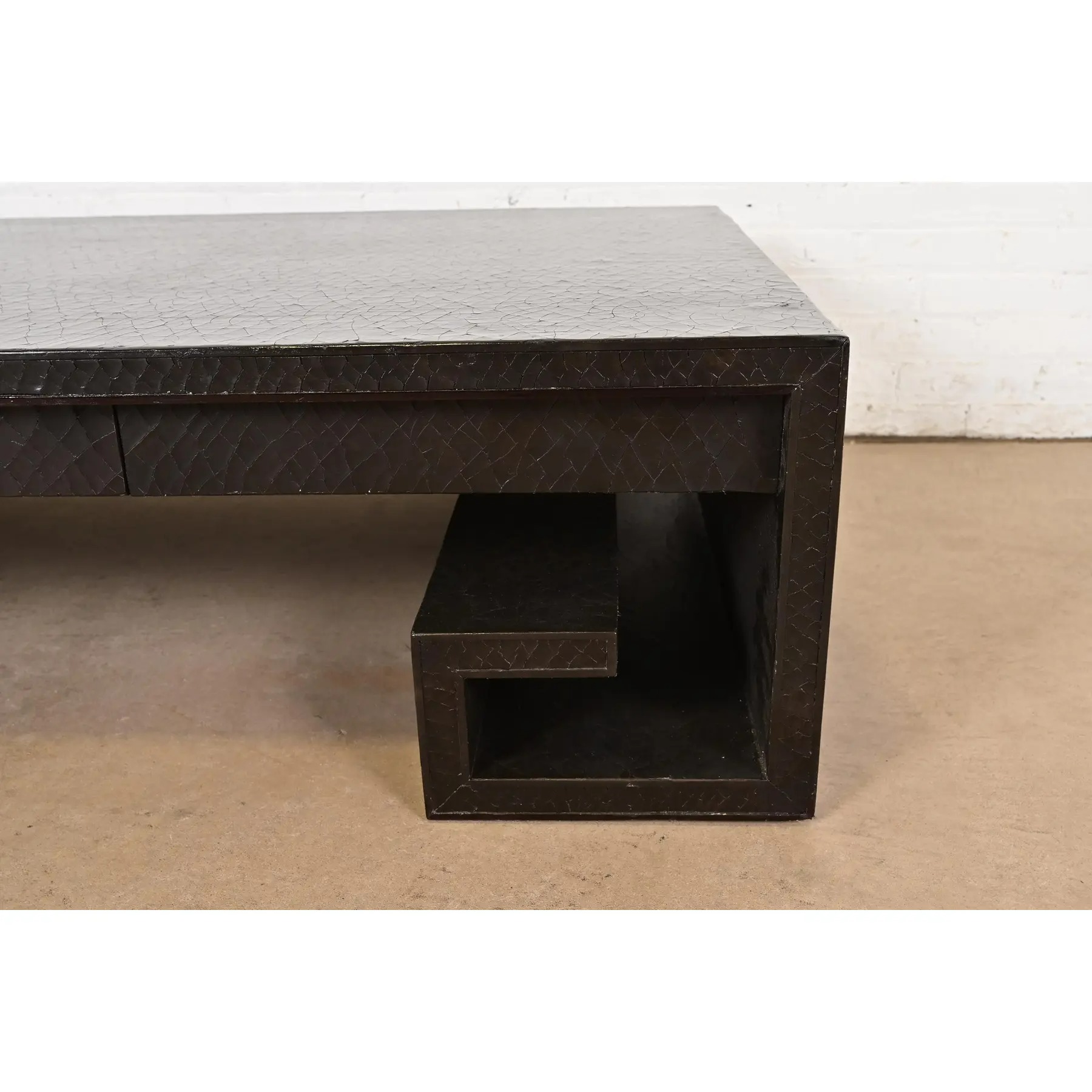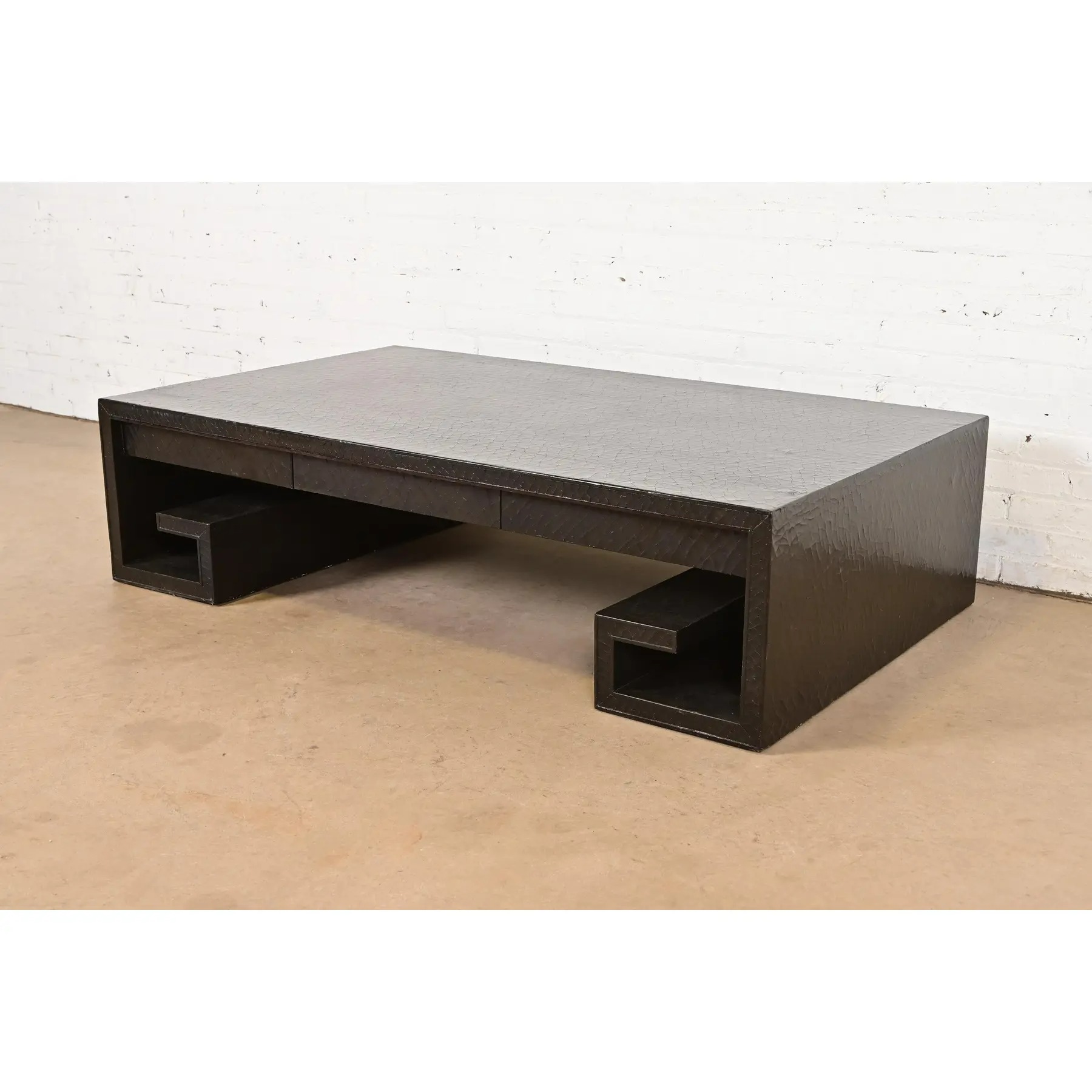 A beautiful large scale Greek Key or Asian Scroll black crackle lacquered coffee table or cocktail table