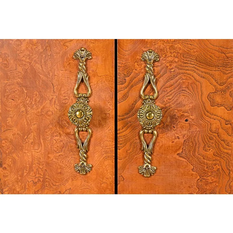 Carved burl wood, with original brass hardware. Interior shelves are adjustable.