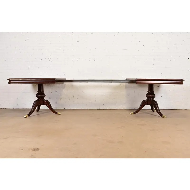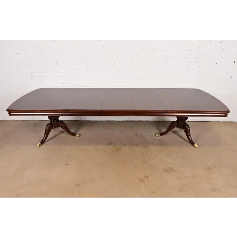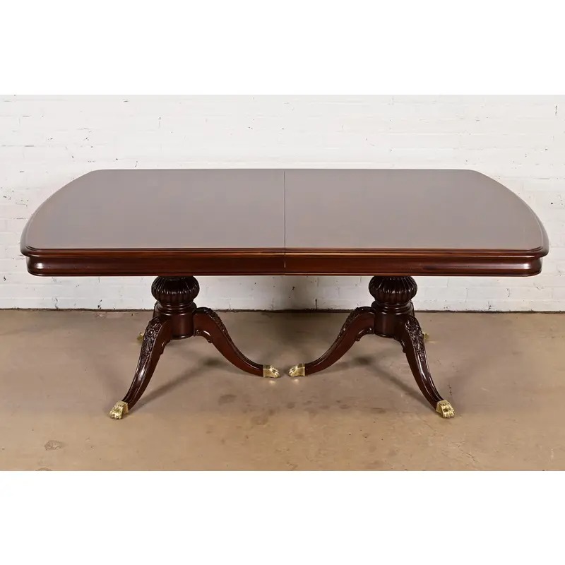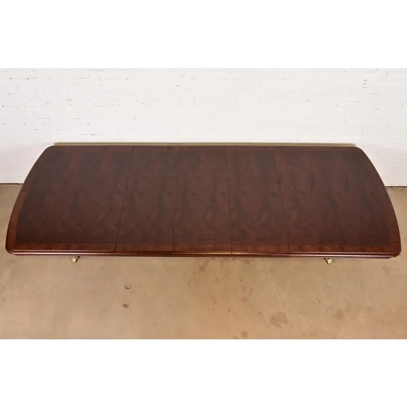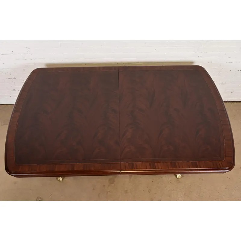 Gorgeous book-matched flame mahogany top, with satinwood banding, carved solid mahogany pedestals, and brass-capped paw feet.