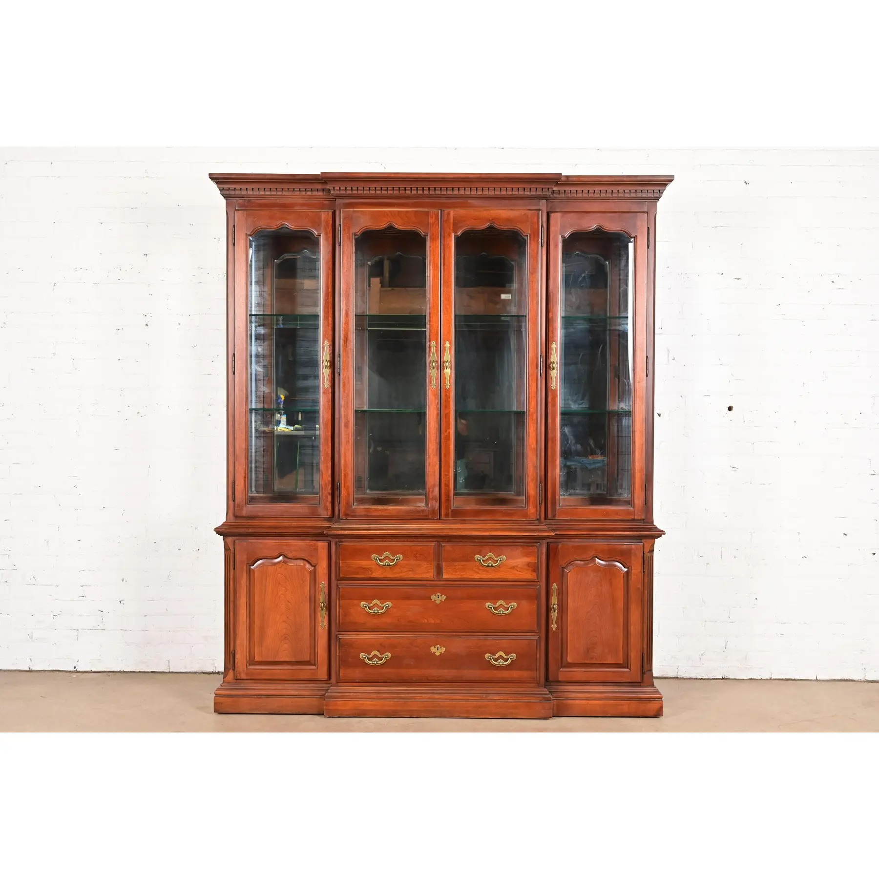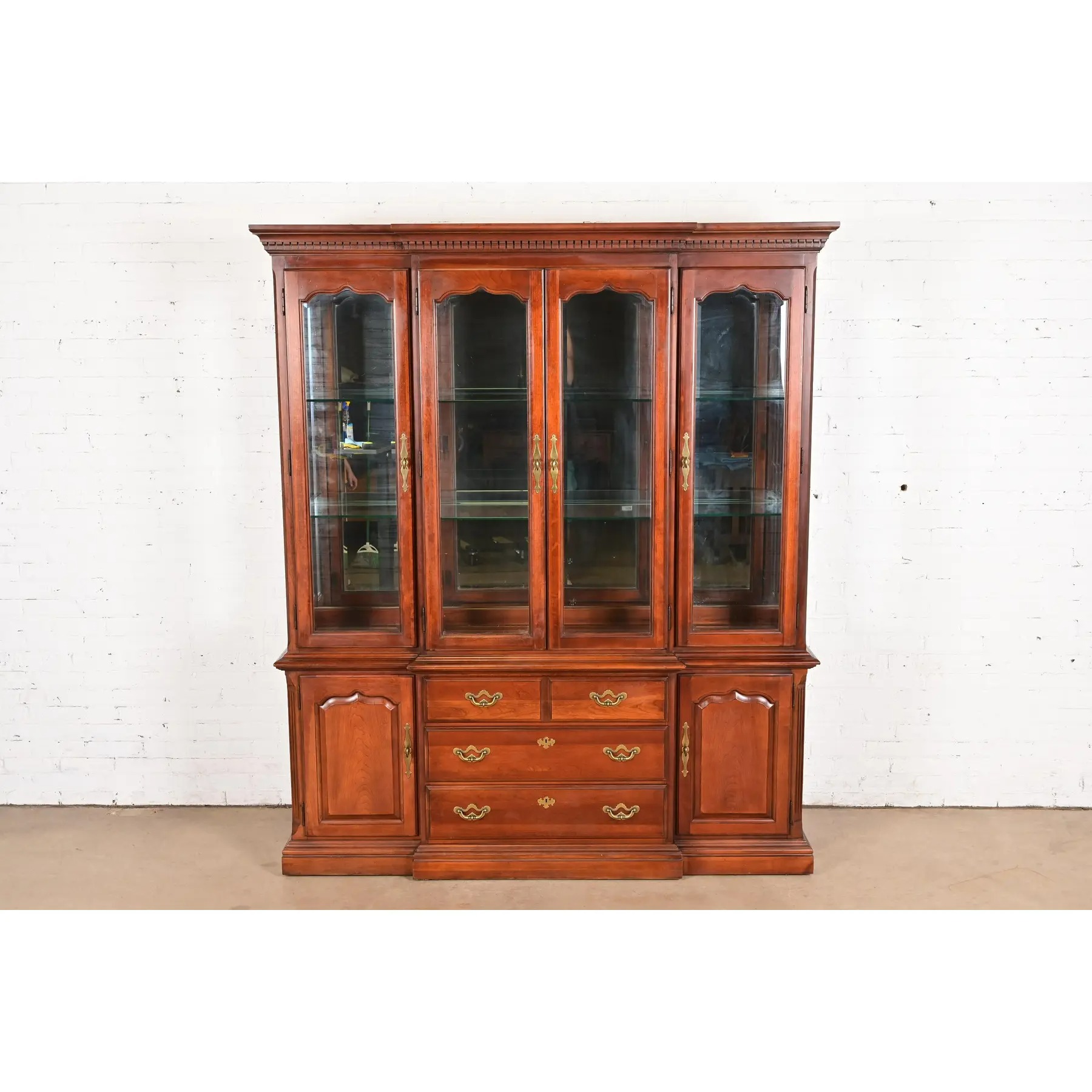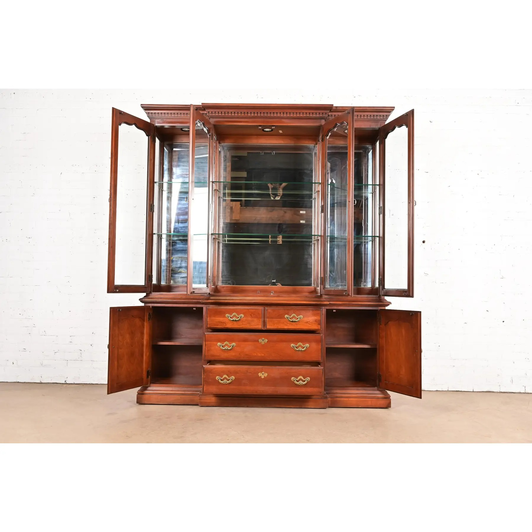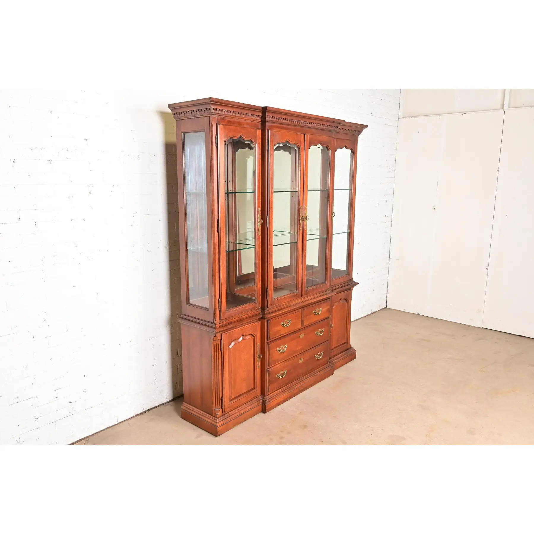 A gorgeous Georgian or Chippendale style lighted breakfront bookcase cabinet, display cabinet, or dining cabinet