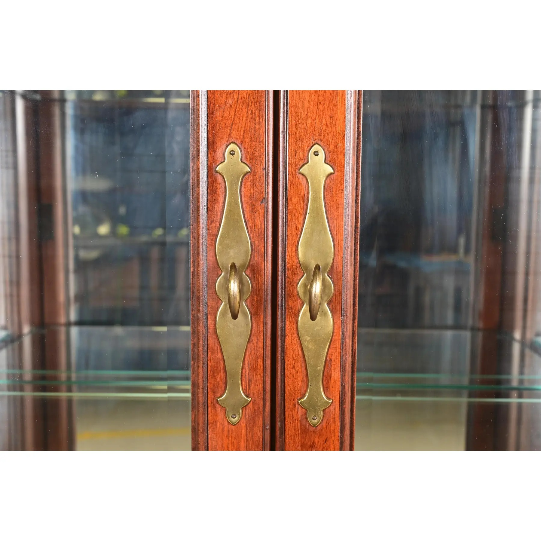 Carved cherry wood, with glass front doors and sides, mirrored back interior, and original brass hardware.