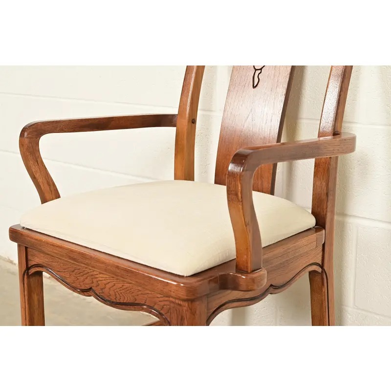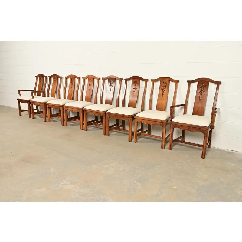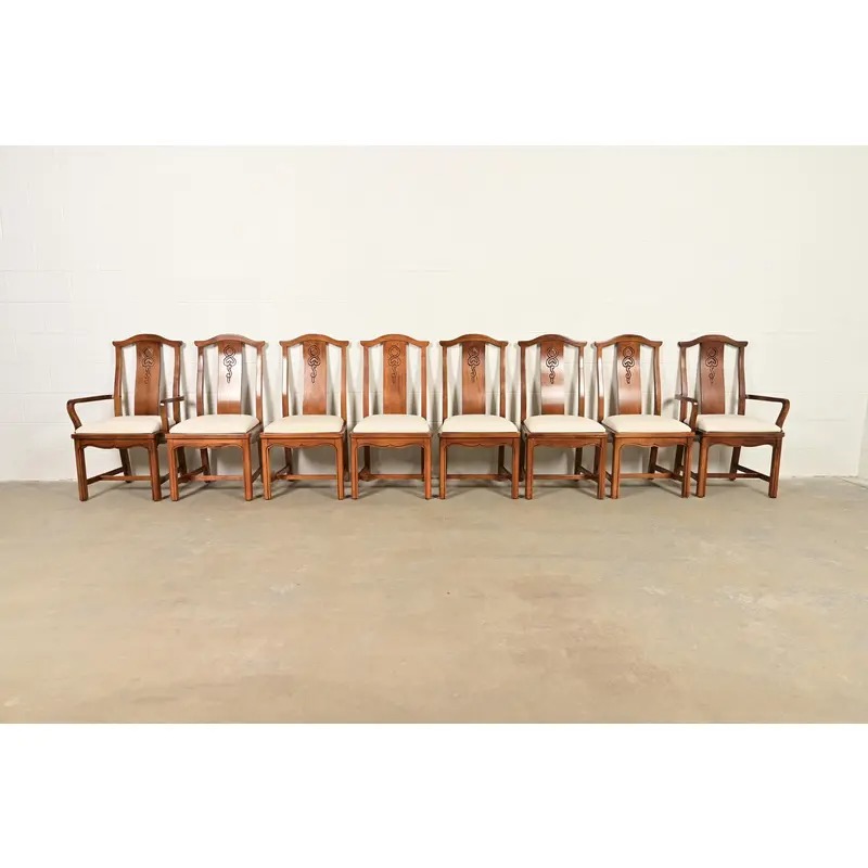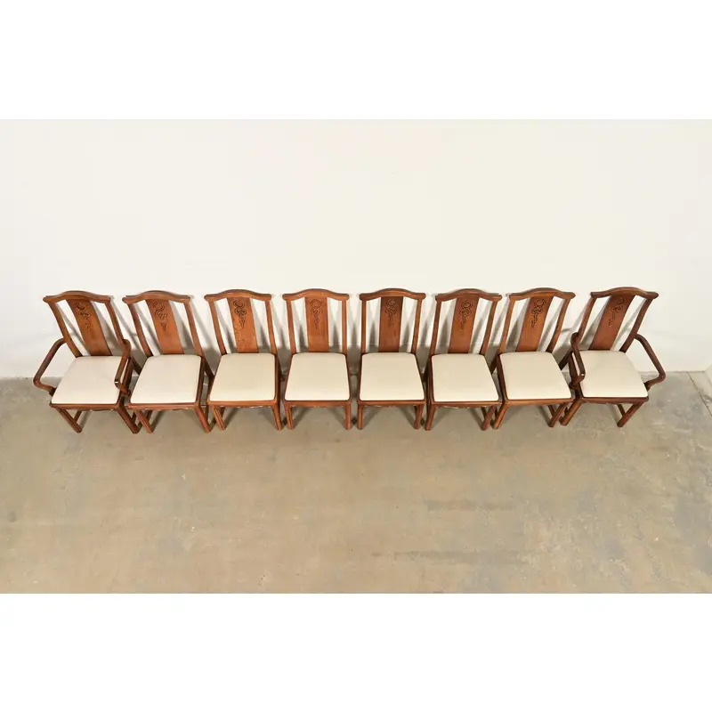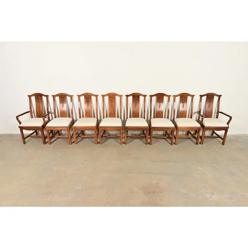 Thomasville Mid-Century Hollywood Regency Chinoiserie Carved Walnut Dining Chairs, Set of Eight
