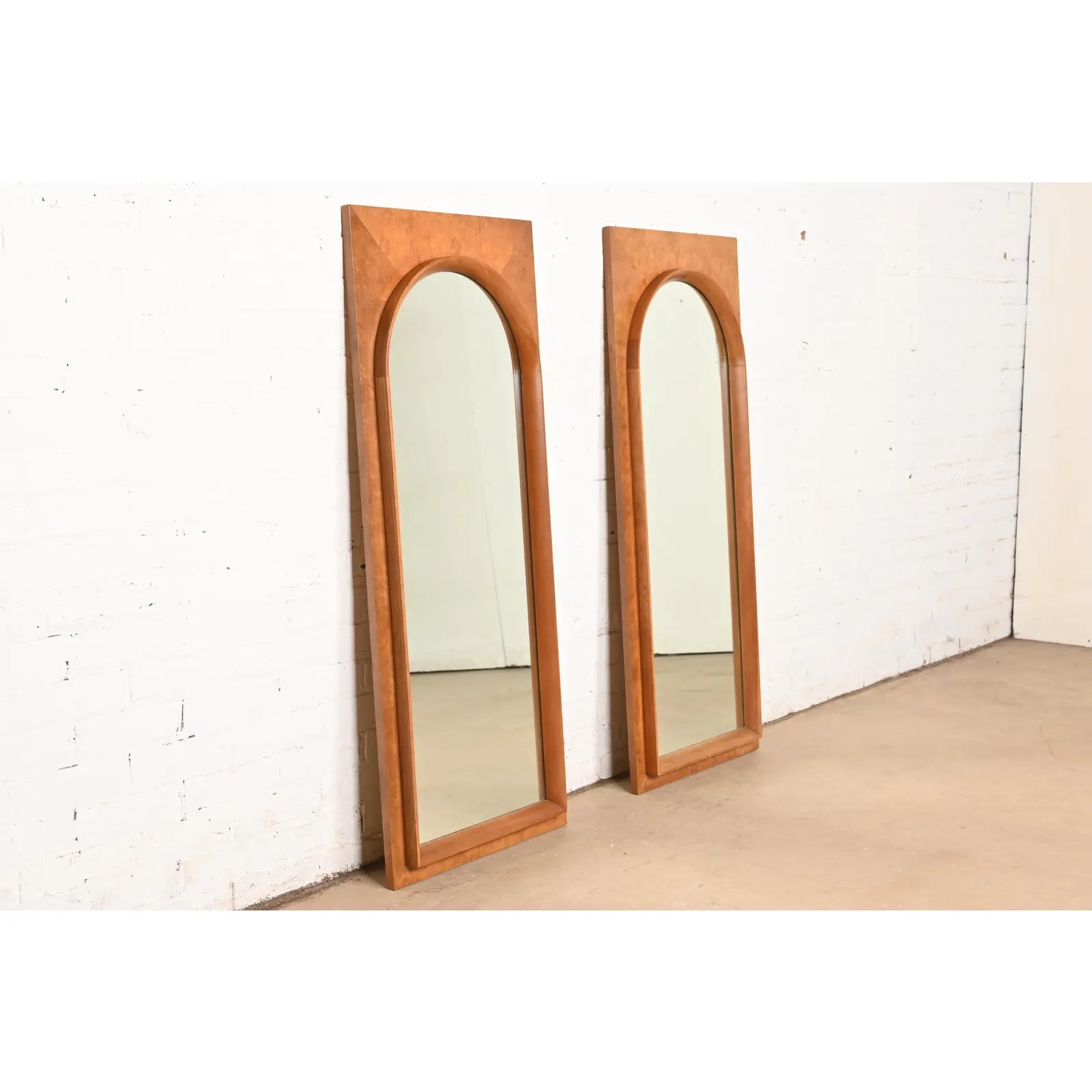 A beautiful pair of Mid-Century Modern burled walnut framed arched wall mirrors