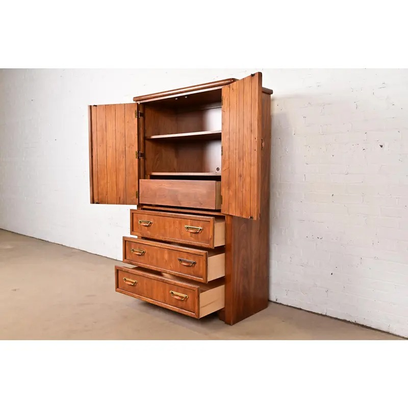 Thomasville Mid-Century Modern Campaign Walnut Armoire Dresser, Circa 1970s