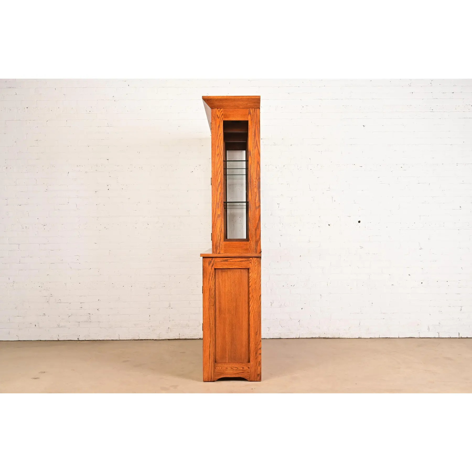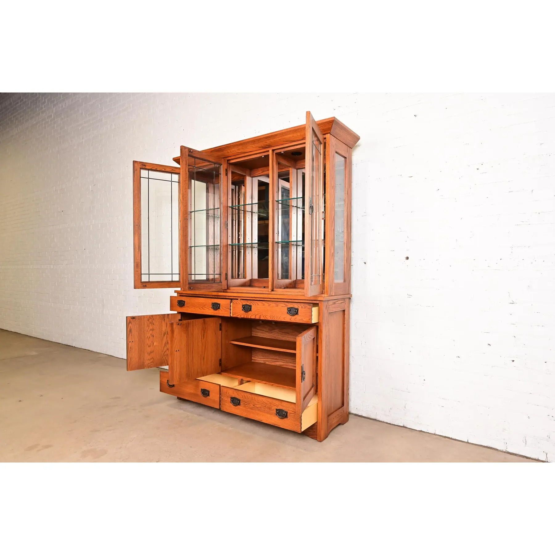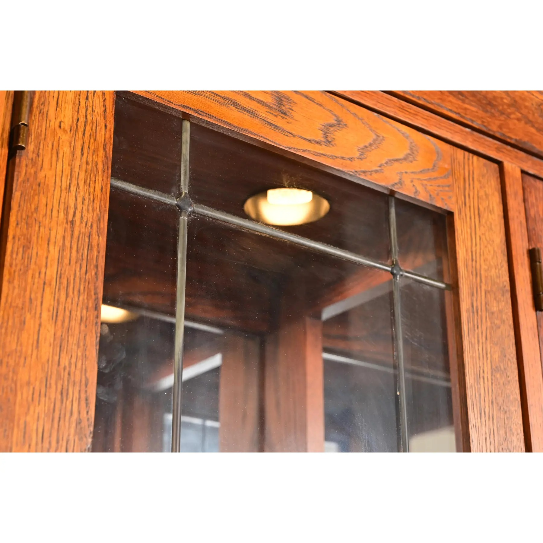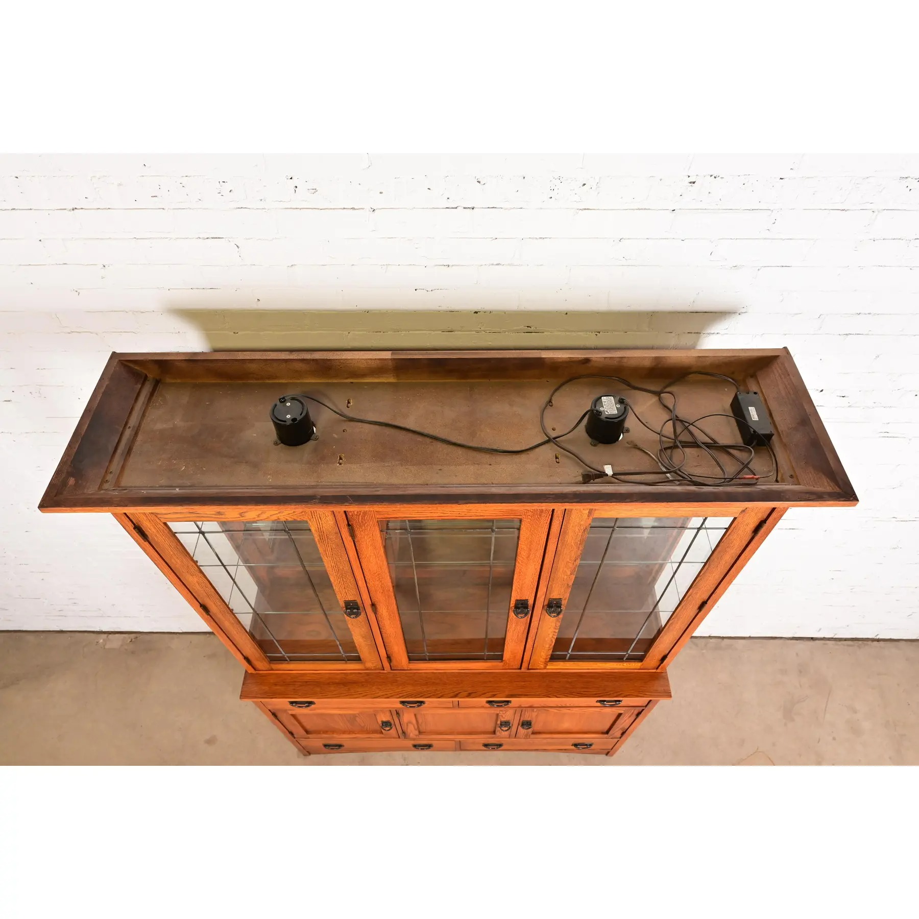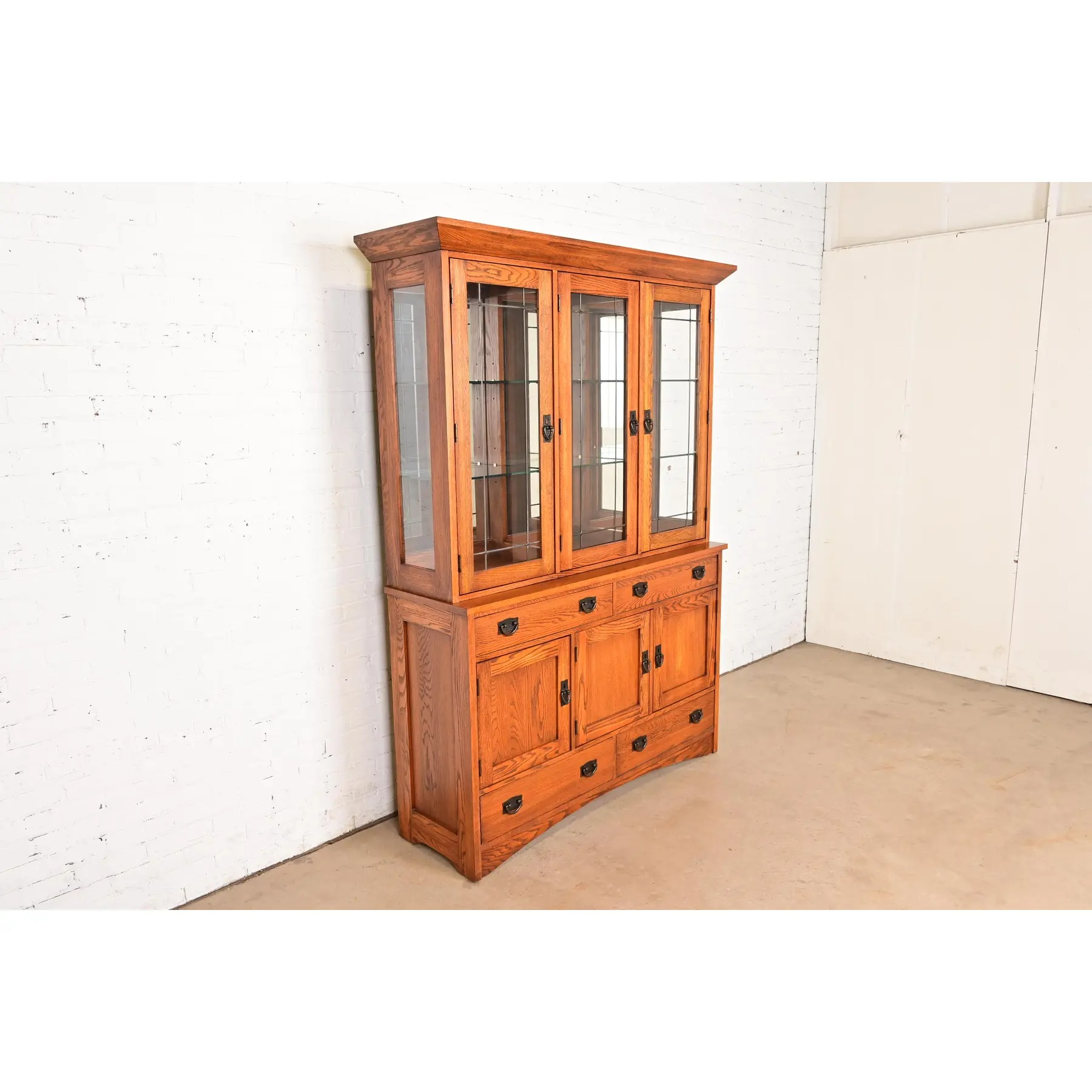 A gorgeous Mission or Arts & Crafts style lighted breakfront bookcase, display cabinet, or dining cabinet