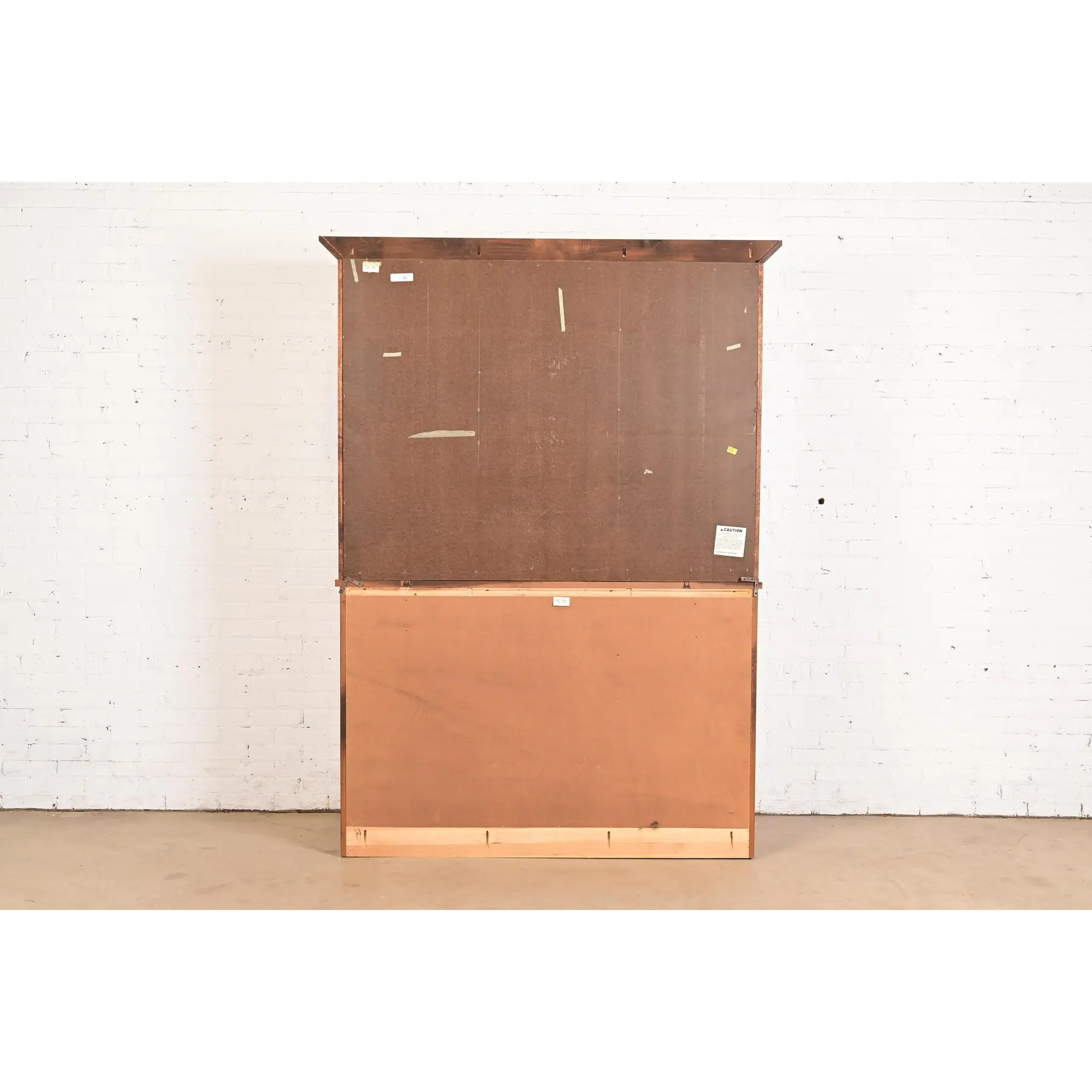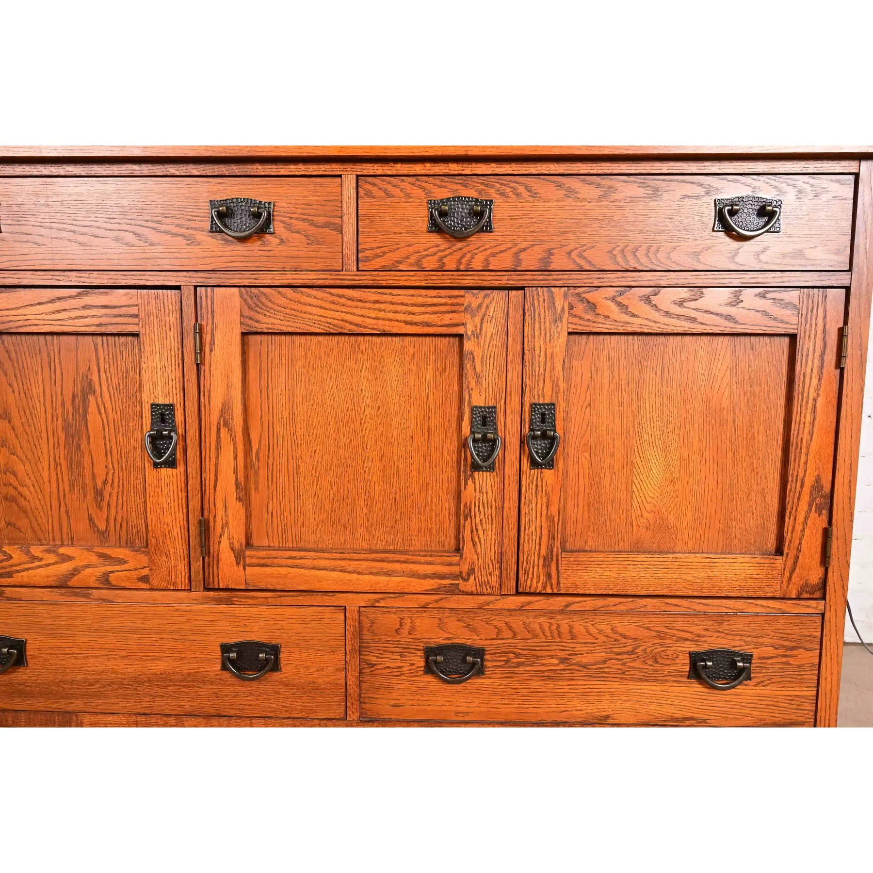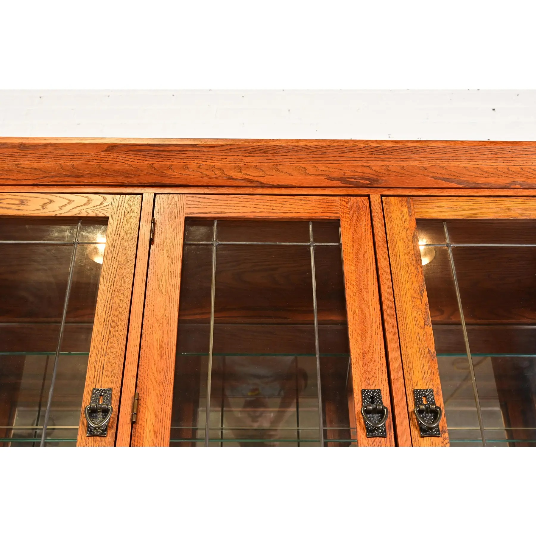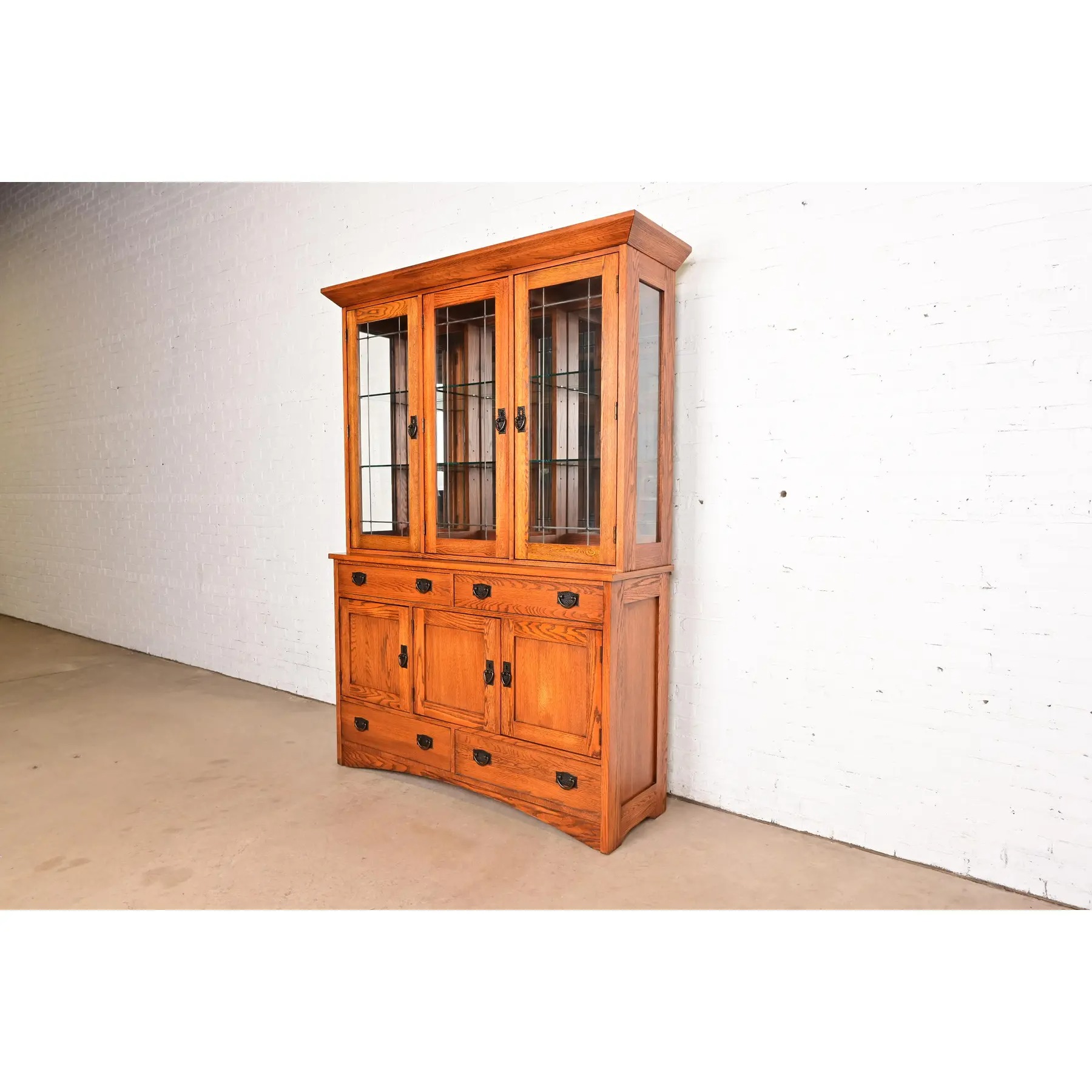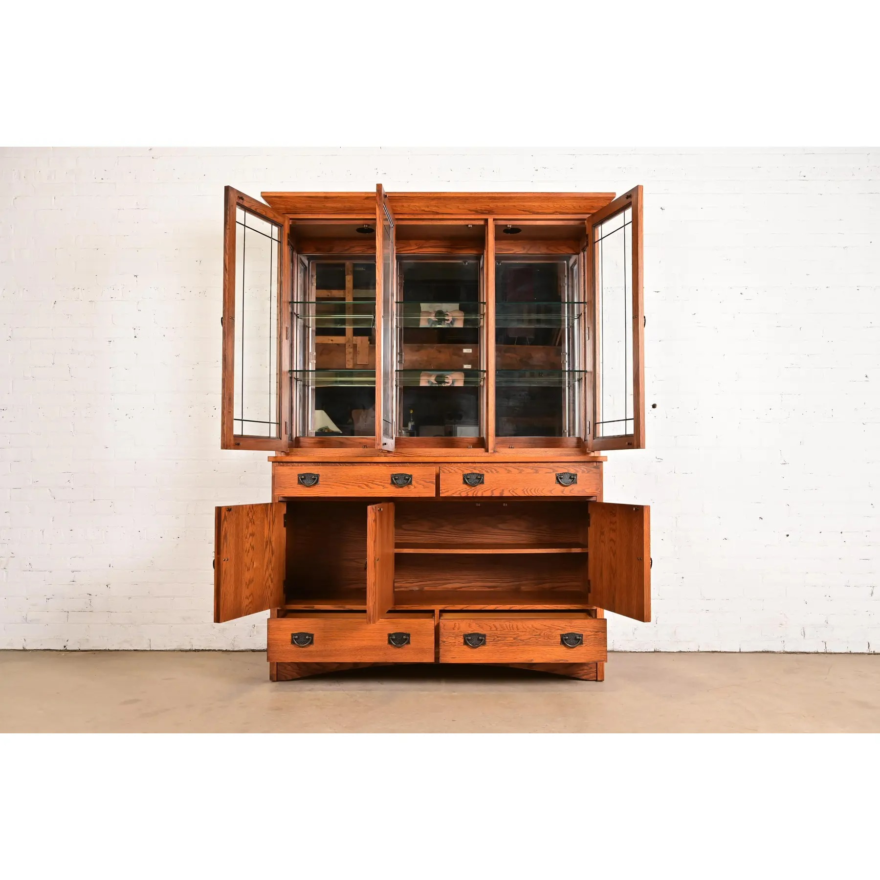A gorgeous Mission or Arts & Crafts style lighted breakfront bookcase, display cabinet, or dining cabinet