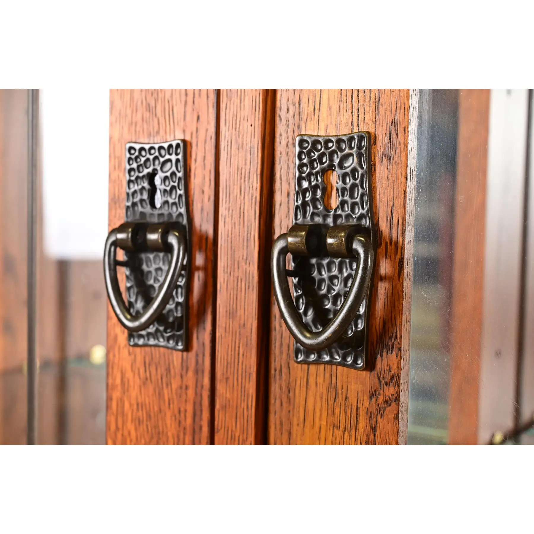 Oak, with mullioned leaded glass front doors, and original hammered copper hardware.