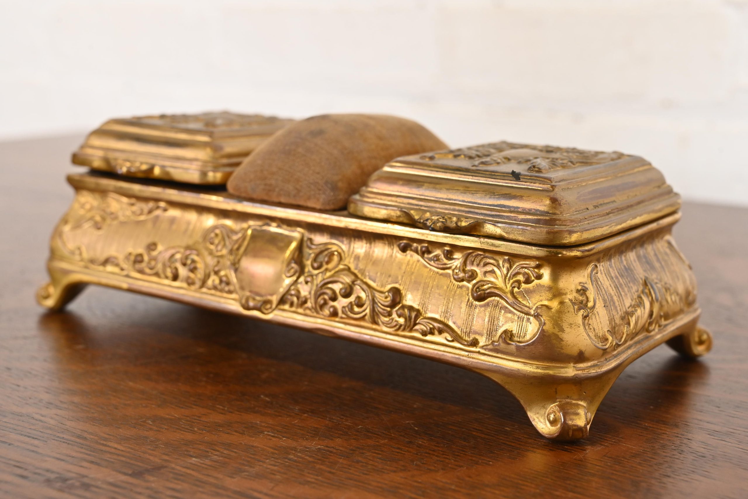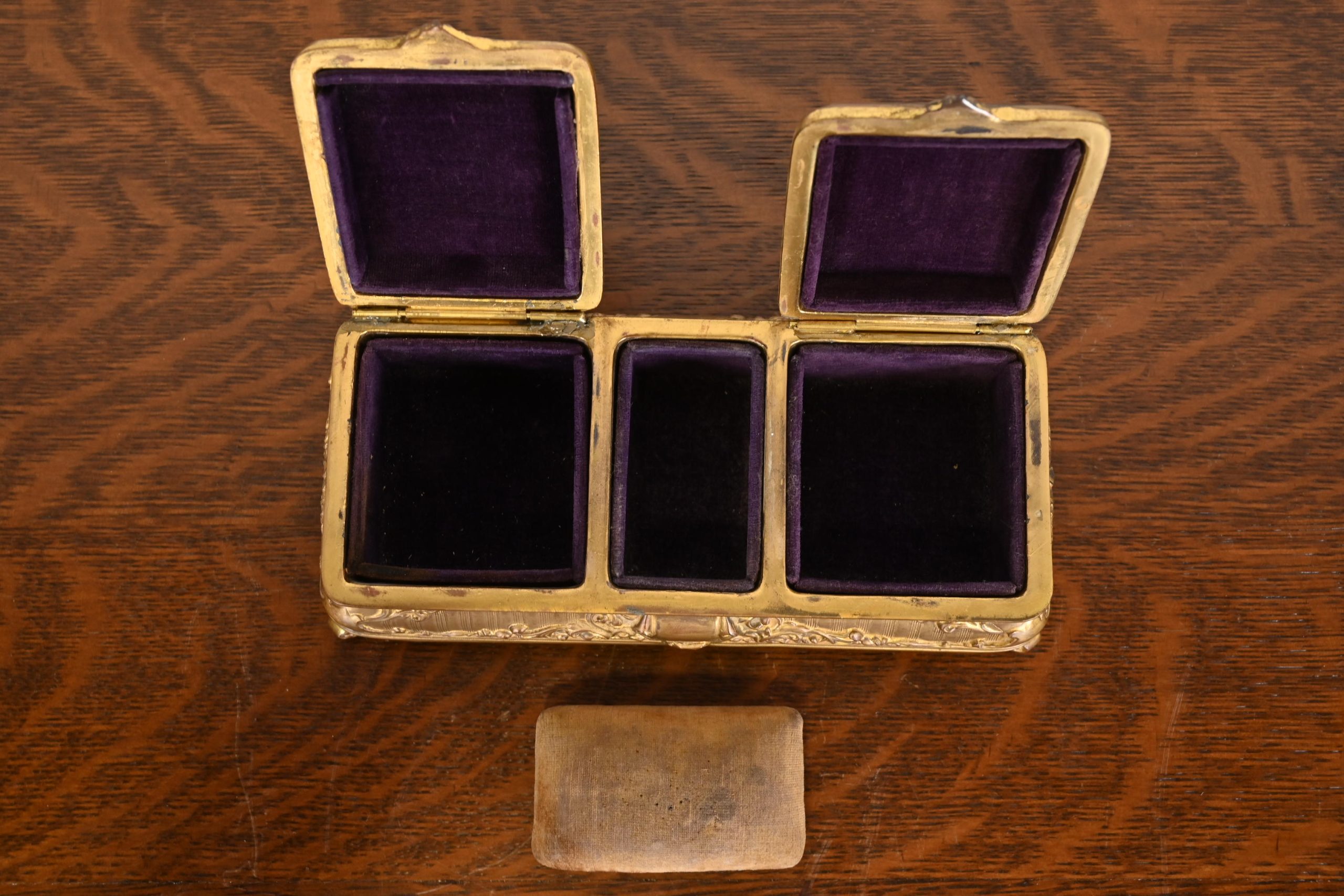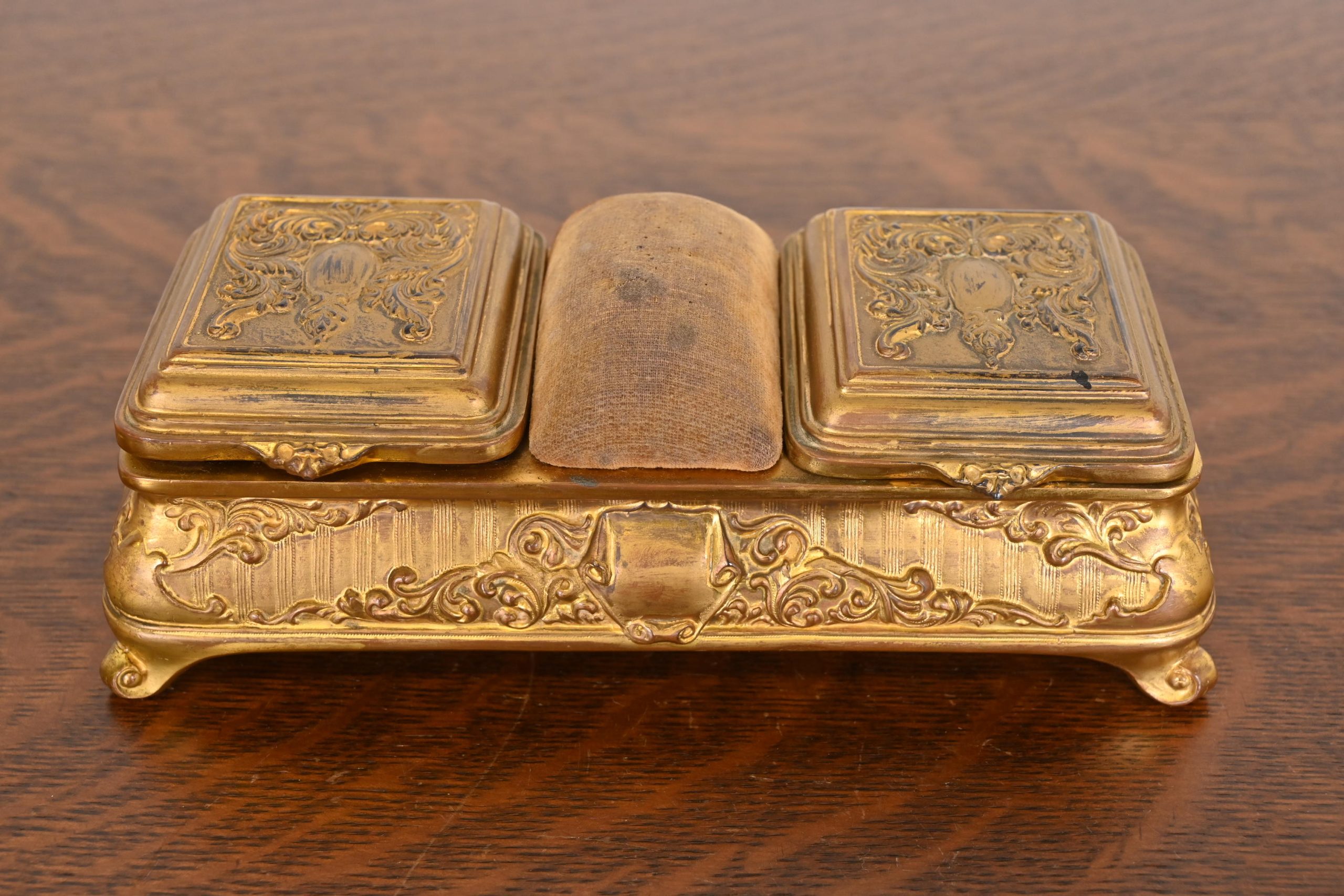 A gorgeous antique French Repousse gilt bronze three-compartment dresser box, jewelry box, or decorative box